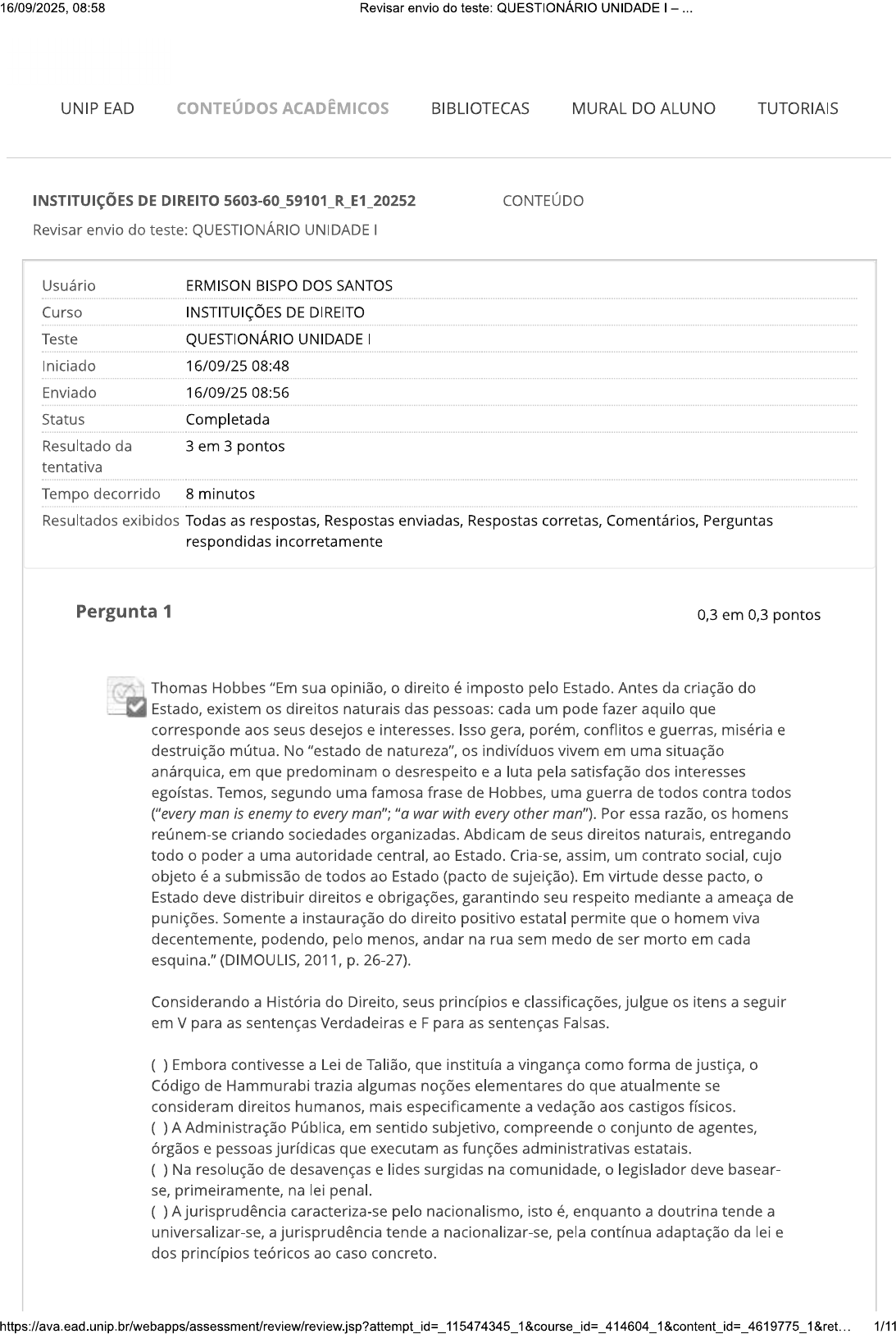 16/09/2025, 08:58 Revisar envio do teste: QUESTIONÁRIO UNIDADE UNIP EAD CONTEÚDOS ACADÊMICOS BIBLIOTECAS MURAL DO ALUNO TUTORIAIS INSTITUIÇÕES DE DIREITO 5603-60_59101_R_E1_20252 CONTEÚDO Revisar envio do teste: QUESTIONÁRIO UNIDADE Usuário ERMISON BISPO DOS SANTOS Curso INSTITUIÇÕES DE DIREITO Teste QUESTIONÁRIO UNIDADE Iniciado 16/09/25 08:48 Enviado 16/09/25 08:56 Status Completada Resultado da 3 em 3 pontos tentativa Tempo decorrido 8 minutos Resultados exibidos Todas as respostas, Respostas enviadas, Respostas corretas, Comentários, Perguntas respondidas incorretamente Pergunta 1 0,3 em 0,3 pontos Thomas Hobbes "Em sua opinião, o direito é imposto pelo Estado. Antes da criação do Estado, existem os direitos naturais das pessoas: cada um pode fazer aquilo que corresponde aos seus desejos e interesses. Isso gera, porém, conflitos e guerras, miséria e destruição mútua. No "estado de natureza", os indivíduos vivem em uma situação anárquica, em que predominam o desrespeito e a luta pela satisfação dos interesses egoístas. Temos, segundo uma famosa frase de Hobbes, uma guerra de todos contra todos ("every man is enemy to every man"; "a war with every other man"). Por essa razão, os homens reúnem-se criando sociedades organizadas. Abdicam de seus direitos naturais, entregando todo poder a uma autoridade central, ao Estado. Cria-se, assim, um contrato social, cujo objeto é a submissão de todos ao Estado (pacto de sujeição). Em virtude desse pacto, Estado deve distribuir direitos e obrigações, garantindo seu respeito mediante a ameaça de punições. Somente a instauração do direito positivo estatal permite que homem viva decentemente, podendo, pelo menos, andar na rua sem medo de ser morto em cada esquina." (DIMOULIS, 2011, p. 26-27). Considerando a História do Direito, seus princípios e classificações, julgue os itens a seguir em V para as sentenças Verdadeiras e F para as sentenças Falsas. Embora contivesse a Lei de Talião, que instituía a vingança como forma de justiça, Código de Hammurabi trazia algumas noções elementares do que atualmente se consideram direitos humanos, mais especificamente a vedação aos castigos físicos. A Administração Pública, em sentido subjetivo, compreende conjunto de agentes, órgãos e pessoas jurídicas que executam as funções administrativas estatais. Na resolução de desavenças e lides surgidas na comunidade, legislador deve basear- se, primeiramente, na lei penal. A jurisprudência caracteriza-se pelo nacionalismo, isto é, enquanto a doutrina tende a universalizar-se, a jurisprudência tende a nacionalizar-se, pela contínua adaptação da lei e dos princípios teóricos ao caso concreto. 1/1116/09/2025, 08:58 Revisar envio do teste: QUESTIONÁRIO UNIDADE A sequência que preenche corretamente os espaços entre os parênteses, de cima para baixo, é: Resposta Selecionada: Respostas: a. b. d. e. Comentário Resposta: da resposta: Comentário: Falso, pois Código de Hammurabi tinha como característica a presença de penas especificamente em relação aos direitos humanos, trata-se de uma construção moderna, que surge com esses termos a partir do final do século com o Direito Humanitário (Direito de Guerra) e, posteriormente à Guerra Mundial, com a Declaração Universal dos Direitos Humanos de 1948. Naturalmente, alguns acontecimentos na humanidade vão se desenrolar no sentido de atribuir à figura do ser humano um mínimo de dignidade, não obstante os preconceitos e diferenças sociais vigentes. Vieira (2011) afirma que talião, entretanto, não era a única norma penalizante presente no citado código, podendo-se observar, já em seu artigo 1°, uma primeira manifestação do rigoroso modelo punitivo nele previsto: "Se um homem acusou outro homem e lançou sobre ele suspeita de morte, mas não pôde comprovar, seu acusador será morto". Assim, a afirmativa é falsa. Verdadeiro, pois, em sentido subjetivo, quanto aos sujeitos que exercem a função administrativa, conceitua-se Administração Pública como o conjunto de agentes, órgãos e pessoas jurídicas aos quais é atribuído o exercício da função administrativa. Define Maria Sylvia Zanella Di Pietro que a Administração Pública, no sentido subjetivo, formal ou orgânico, designa os entes que exercem a atividade administrativa; compreende pessoas jurídicas, órgãos e agentes públicos incumbidos de exercer uma das funções em que se triparte a atividade estatal: a função administrativa. Falso, trata-se do princípio da Intervenção Mínima do Direito Penal, ou seja, direito penal só vai agir em último caso (ultima ratio). Para resolver as desavenças na comunidade, o legislador deve primeiro utilizar a lei civil, a lei administrativa, a lei trabalhista, a lei tributária, caso essas leis não resolvam, legislador deverá usar a ultima ratio: a lei penal. Verdadeiro, pois a jurisprudência traduz a reiteração dos julgamentos dos Tribunais num mesmo sentido. A jurisprudência influencia poderosamente a construção do Direito. Assim, é correto afirmar que a jurisprudência tem um caráter mais prático, mais objetivo que a doutrina e a lei. Outra característica da jurisprudência é seu nacionalismo. Enquanto a doutrina tende a universalizar-se, a jurisprudência tende a nacionalizar-se pela contínua adaptação da lei e dos princípios teóricos ao caso concreto. Pergunta 2 0,3 em 0,3 pontos Leia o texto a seguir: "Preconceitos todos nós temos: eles são parte de qualquer cultura. Cada um que os flagra 2/1116/09/2025, 08:58 Revisar envio do teste: QUESTIONÁRIO UNIDADE em si, e entende que estes foram forjados por meio de ideias que passam de geração em geração, quase sem questionamentos, entende a necessidade de reavaliar suas percepções em meio às mudanças do mundo. Em sociedades ditas civilizadas, os preconceitos deveriam ficar em casa; são eles, e não seres humanos nascidos na liberdade, que devem esta