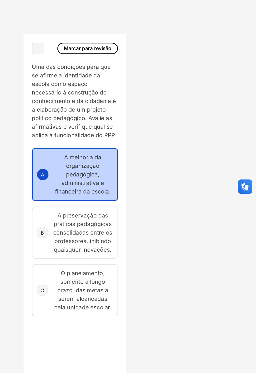 A B C 1 Marcar para revisão Uma das condições para que se afirme a identidade da escola como espaço necessário à construção do conhecimento e da cidadania é a elaboração de um projeto político pedagógico. Avalie as afirmativas e verifique qual se aplica à funcionalidade do PPP: A melhoria da organização pedagógica, administrativa e financeira da escola. A preservação das práticas pedagógicas consolidadas entre os professores, inibindo quaisquer inovações. O planejamento, somente a longo prazo, das metas a serem alcançadas pela unidade escolar. D E A B A reunião dos conteúdos a serem trabalhados nas diversas áreas de conhecimentos. O apagamento da memória histórica e institucional da unidade escolar. 2 Marcar para revisão A movimentação entre teoria e prática aconteceu de maneira diferente e de forma contínua nos campos do conhecimento. A orientação ao estagiário sobre os aspectos teóricos e metodológicos que devem nortear a experiência de observação do cotidiano escolar cabe: ao professor regente da unidade escolar em que se realiza o estágio. ao professor orientador do estágio. C D E à direção da instituição em que é matriculado o estagiário. à coordenação pedagógica da unidade escolar em que é realizado o estágio. à direção da unidade escolar em que se realiza o estágio. 3 Marcar para revisão A prática de estágio envolve a observação do ambiente escolar e da prática educativa para a contraposição do conhecimento teórico produzido no âmbito da IES e aquele que se desenvolve no cotidiano das unidades escolares. Trata-se, portanto, de uma observação ativa de elementos presentes no ambiente escolar que influenciam direta ou indiretamente no processo de ensino e aprendizagem. A observação do espaço e da dinâmica escolar envolve pelo menos quatro eixos, que são: A B C O ambiente físico. A interação entre os membros da comunidade escolar. A relação estabelecida entre a escola e a comunidade em seu entorno. As práticas pedagógicas. O ambiente físico. A interação entre os membros da comunidade escolar. A relação estabelecida entre a escola e os meios de comunicação. As práticas pedagógicas. O ambiente físico. A interação entre os membros da comunidade escolar. A relação estabelecida entre a escola e a comunidade em seu entorno. O desempenho esportivo da escola. D E O estilo arquitetônico do prédio. A interação entre os membros da comunidade escolar. A relação estabelecida entre a escola e a comunidade em seu entorno. As práticas pedagógicas. O desempenho esportivo da escola. A interação entre os membros da comunidade escolar. A relação estabelecida entre a escola e a comunidade em seu entorno. As práticas pedagógicas. 4 Marcar para revisão (Pedagogia - Processo de ensino-aprendizagem - Universidade Estadual do Ceará (UECE) - 2018 - Secretaria da Educação - CE (SEDUC/CE) (2ª edição) - Professor) Na construção e execução de uma proposta pedagógica, a "transposição didática" é considerada um instrumento através do qual o conhecimento científico pode ser transformado em A B C D E conhecimento escolar. Segundo teóricos da Educação, significa analisar, selecionar e inter-relacionar o conhecimento científico adequando-o às reais possibilidades cognitivas dos estudantes. Dentre os recursos metodológicos considerados mais importantes para instrumentalizar este processo estão: Interdisciplinaridade e contextualização. Interdisciplinaridade e cronologia. Transdisciplinaridade e a técnica. Contextualização e globalização. Escolha e a técnica. 5 Marcar para revisão O dia a dia de uma escola apresenta situações que deveriam acabar com preconceitos ou minimizá-los, rever atitudes e valores que estejam em desacordo com os direitos humanos. A respeito 00 hora : 46 min : 23 seg Ocultar Questão 10 de 10 1 2 3 4 5 SM2 Prática De Ensino Na Educação Básica A B C D E desse assunto, julgue os próximos itens. I - Princípios instrucionistas ou conteudistas contribuem para as práticas de cidadania no cotidiano escolar. II - Ordenamento e repetição geram fortalecimento da cognição e conhecimento dos alunos. III - O contexto dos alunos deve ser considerado no processo de construção da aprendizagem. Estão corretas as afirmativas: Apenas a I. Apenas a II. Apenas a III. Apenas I e II. Apenas II e III. 6 Marcar para revisão (Pedagogia - Processo de ensino-aprendizagem - Fundação Getúlio Vargas (FGV) - 2018 - Assembleia Legislativa - RO - Analista Legislativo) Respondidas (10) Em branco (0) Finalizar prova 6 7 8 9 10 A B C No processo de ensino e aprendizagem, o erro possui um papel fundamental, visto que pode ser encarado como uma ferramenta de aprendizado para o aluno, que identifica onde e porque errou, e para o professor, que pode identificar eventuais lacunas e oferecer ao aluno instrumentos para superá-las. Relacione os tipos de erro listados a seguir aos seus respectivos conceitos. 1. Erro conceitual 2. Erro construtivo 3. Erro de distração ( ) demonstra as hipóteses do aluno acerca de qualquer conhecimento, naquele momento. ( ) reflete a não compreensão de determinado conceito ensinado. ( ) ocorre quando o aluno possui a estrutura cognitiva necessária mas deixa de dar a resposta correta. Assinale a opção que indica a sequência correta, segundo a ordem apresentada: 1 - 2 - 3. 2 - 1 - 3. 3 - 2 - 1. D E A B C D E 2 - 3 - 1. 3 - 1 - 2. 7 Marcar para revisão O estágio é um espaço de construção de conhecimento e transformações. Nesse sentido, o olhar do estagiário deve estar voltado para observar o que segue, exceto: Registros que instrumentalizam. Sujeitos que interagem e refletem. A vocação do(a) docente titular. Situações vivenciadas. Histórias e competências construídas. 8 Marcar para revisão A B C D E O estágio supervisionado em Educação envolve os seguintes agentes: I - A instituição de educação em que o aluno é matricu