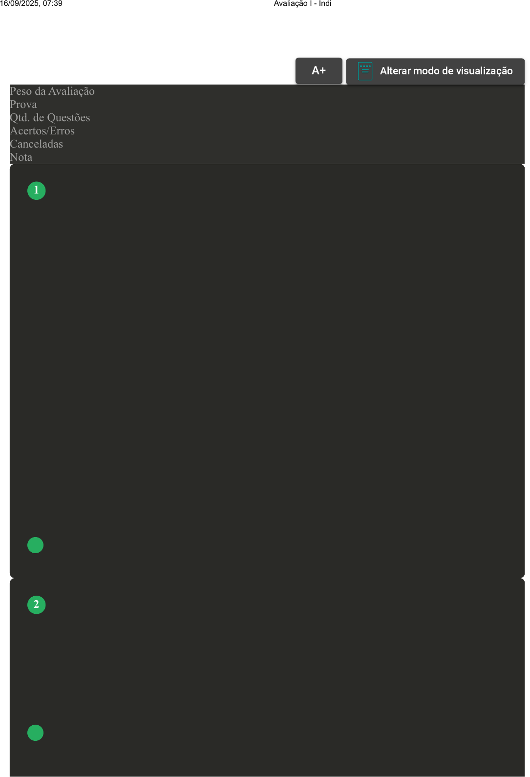 Prova Impressa GABARITO | Avaliação I - Individual (Cod.:955539) Peso da Avaliação 2,00 Prova 83077308 Qtd. de Questões 10 Acertos/Erros 9/0 Canceladas 1 Nota 10,00 Comer rápido pode ser prejudicial a sua saúde e causar indevidamente a sensação de estômago cheio. Se a pessoa comer muito rápido e não mastigar bem os alimentos, pode sobrecarregar a atividade do estômago. Assim, pode dificultar a digestão e a absorção dos alimentos. A mastigação deve acontecer de forma diferente para cada alimento, por exemplo, quanto mais duro, maior deve ser o processo de mastigação. De acordo com pesquisa realizada pela Faculdade de Medicina de Ribeirão Preto (FMRP) da USP, não mastigar bem os alimentos, também tem impactos nas atividades cerebrais, como a memória, e pode levar até a deficiência da musculatura da face. Sobre o processo de digestão, classifique V para as sentenças verdadeiras e F para as falsas: ( ) Na boca estão os dentes e a saliva, que trituram e umedecem os alimentos, respectivamente. ( ) No duodeno ocorre a inserção da bile e do suco pancreático, digerindo nutrientes. ( ) No estômago, o bolo alimentar entra em contato com o suco entérico, responsável por digerir as proteínas. ( ) No intestino grosso, a pepsina atua sobre as moléculas de amido, liberando glicose. Assinale a alternativa que apresente a sequência CORRETA: FONTE: https://jornal.usp.br/atualidades/comer-rapido-ou-mastigar-pouco-pode-ser-prejudicial/. Acesso em: 4 out. 2019. A F - F - V - V. B F - V - V - F. C V - F - F - V. D V - V - F - F. O sistema digestório exerce uma função importante no nosso corpo, pois aproveita os nutrientes dos alimentos para assegurar a nutrição das células, garantindo, dessa forma, o bom funcionamento do nosso organismo. Com base no exposto, assinale a alternativa CORRETA que apresenta a definição do processo de digestão: A É o processo mecânico que ocorre no estômago, e químico que ocorre na boca, graças à pepsina. B É a reabsorção de nutrientes que já foram rejeitados pelas células. C É a quebra das macromoléculas em partículas pequenas e absorvíveis que ocorre fora das células. D É a quebra dos alimentos em partículas menores que ocorre dentro das células. VOLTAR A+ Alterar modo de visualização 1 2 16/09/2025, 07:39 Avaliação I - Individual about:blank 1/5 Atenção: Esta questão foi cancelada, porém a pontuação foi considerada. Em sua anatomia, a vesícula apresenta um formato semelhante a uma pera, podendo medir entre sete e dez centímetros. A vesícula biliar fica localizada no abdômen, na parte superior direita, abaixo do fígado. Entre as refeições, a bile fica armazenada na vesícula biliar e a secreção só é ativada pela presença de alimentos no intestino, ou de forma psicológica pela lembrança de alimentos. Com relação à vesicular biliar e a bile, classifique V para as sentenças verdadeiras e F para as falsas: ( ) A bile é uma secreção produzida pelo fígado e armazenada na vesícula biliar, sendo gradualmente secretada no duodeno para auxiliar na digestão dos lipídios. ( ) O fígado comunica-se com o duodeno por meio do ducto colédoco ou biliar, que transporta a bile para ser armazenada na vesícula biliar. ( ) Além da emulsificação das partículas de gordura, presentes nos alimentos, a bile também tem a função de excretar produtos provenientes do sangue, além do excesso de colesterol circulante. ( ) O processo de emulsificação de gordura pela bile está diretamente relacionado com a presença do ácido clorídrico presente nesta secreção. Assinale a alternativa que apresente a sequência CORRETA: FONTE: https://jornal.usp.br/atualidades/calculos-biliares-geram-dores-intensas. Acesso em: 4 out. 2019 A V - V - V - F. B F - F - V - V. C V - F - F - V. D V - V - F - F. As principais camadas do trato digestório incluem a túnica mucosa, a tela submucosa, a túnica muscular e a túnica serosa. Variações na estrutura dessas quatro camadas ocorrem ao longo do trato digestório. Essas variações estão relacionadas a funções específicas de cada órgão e região. Sobre as diferenças histológicas entre o intestino delgado e o intestino grosso, assinale a alternativa CORRETA: A A túnica muscular do intestino delgado consiste em uma camada interna de músculo liso circular, formando três bandas bem definidas chamadas tênias do colo, que estão na maior parte do comprimento do intestino delgado. B A principal função do intestino grosso é a absorção dos nutrientes, para isso, esse órgão apresenta grandes projeções que aumentam a área de absorção: as vilosidades e as microvilosidades. C A camada epitelial do intestino grosso apresenta um conjunto de células especializadas, com papel importante na digestão dos alimentos, como as células mucosas do colo, as células parietais e células secretoras de gastrina. D A camada epitelial da túnica mucosa do intestino delgado é composta por epitélio colunar simples que contém diferentes tipos de células, como as absortivas, caliciformes, enteroendócrinas e as células de Paneth. 3 4 16/09/2025, 07:39 Avaliação I - Individual about:blank 2/5 [Laboratório Virtual – Sistema Digestório] Analise o texto a seguir: Corresponde à porção inicial do intestino delgado, sendo o trecho mais curto, mais largo e mais fixo de todo esse órgão. Encontra-se entre os níveis de L1 a L3, estendendo-se desde a extremidade distal do canal pilórico até a flexura duodenojejunal, apresentando, dessa maneira, um formato de “C” ao redor da cabeça do pâncreas. A partir da definição dada, assinale a alternativa CORRETA que apresenta o nome desta região do intestino delgado: A Colo Ascendente. B Íleo. C Jejuno. D Duodeno. [Laboratório Virtual – Sistema Digestório] O fígado é a maior glândula do nosso corpo e o segundo maior órgão. Na vida fetal, apresenta atividade hematopoiética, enquanto na vida adulta volta-se para