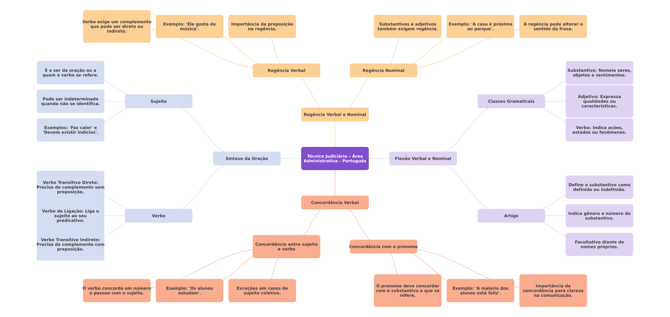 Verbo exige um complemento Exemplo: 'Ele gosta de Importância da preposição Substantivos e adjetivos Exemplo: 'A casa é próxima A regência pode alterar que pode ser direto ou música'. indireto. na regência. também exigem regência. ao parque'. sentido da frase. É ser da oração ou a Regência Verbal Regência Nominal Substantivo: Nomeia seres, quem verbo se refere. objetos e sentimentos. Pode ser indeterminado Adjetivo: Expressa quando não se identifica. Sujeito Classes Gramaticais qualidades ou características. Regência Verbal e Nominal Exemplos: 'Faz calor' e Verbo: Indica ações, existir indícios'. estados ou fenômenos. Técnico Judiciário Área Sintaxe da Oração Flexão Verbal e Nominal Administrativa Português Verbo Transitivo Direto: Define substantivo como Precisa de complemento sem definido ou indefinido. preposição. Concordância Verbal Verbo de Ligação: Liga sujeito ao seu Verbo Artigo Indica gênero e número do substantivo. predicativo. Verbo Transitivo Indireto: Facultativo diante de Precisa de complemento com Concordância entre sujeito e verbo Concordância com pronome preposição. nomes próprios. verbo concorda em número Exemplo: 'Os alunos Exceções em casos de pronome deve concordar com substantivo a que se Exemplo: 'A maioria dos Importância da e pessoa com sujeito. estudam'. sujeito coletivo. alunos está feliz'. concordância para clareza refere. na comunicação.