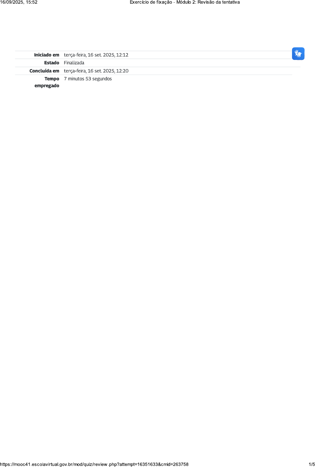 16/09/2025, 15:52 Exercício de fixação - Módulo 2: Revisão da tentativa Iniciado em terça-feira, 16 set. 2025, 12:12 Estado Finalizada Concluída em terça-feira, 16 set. 2025, 12:20 Tempo 7 minutos 53 segundos empregado 1/516/09/2025, 15:52 Exercício de fixação Módulo 2: Revisão da tentativa Questão 1 Correto Atingiu 20,00 de 20,00 Ainda sobre que você estudou em "habilidade de comunicação no atendimento", relacione os comentários abaixo de acordo com estas seis orientações: 1. Ouça seu interlocutor. 2. Seja poliglota de sua própria língua. 3. Assegure-se de que você está sendo entendido. 4. Explique os termos técnicos que utilizar. 5. Cuide quando for dar uma má notícia. 6. Lembre-se de que corpo fala. Procure justificar, com objetividade, não atendimento e demonstre que você também está chateado por não poder dar a resposta que usuário Cuide quando for dar uma má notícia. esperava. Essa demonstração de solidariedade e afetividade alivia a situação e ameniza eventual mal-estar. Respirar fundo, olhar para cima, abrir e fechar gavetas nervosamente, mexer corpo na cadeira, bater a caneta insistentemente na mesa denunciam Lembre-se de que 0 corpo fala. nosso mal-estar quando participamos de um diálogo inconveniente ou desconfortável. Não há problema em utilizar expressões técnicas, desde que você tenha certeza de que usuário sabe exatamente do que se trata. Se você não tem Explique os termos técnicos que utilizar. essa certeza, procure "traduzir" essas expressões. Quando vierem falar com você, pare que estiver fazendo e dê atenção a essa pessoa. É desagradável falar com alguém que está com 0 olhar fixado na tela do computador ou lendo mensagens no WhatsApp. Se você precisa, Ouça seu interlocutor. de fato, terminar algo que está fazendo no computador ou no smartphone, peça licença à pessoa e diga que vai atendê-la assim que concluir aquela atividade. Mesmo que seu interlocutor não diga, você poderá perceber pela expressão facial se ele não está acompanhando a sua explicação. Se necessário, repita Assegure-se de que você está sendo entendido. sua fala, procurando ser mais didático ao apresentar aqueles pontos que você percebeu que ficaram pouco claros em sua primeira exposição. Devemos desenvolver habilidade para compreender diversos dialetos ou diferentes falas dos cidadãos que nos procuram, e habilidade para traduzir, Seja poliglota de sua própria língua. com palavras que usuário entenda, que queremos lhe transmitir. Certa resposta! A resposta correta é: Procure justificar, com objetividade, não atendimento e demonstre que você também está chateado por não poder dar a resposta que usuário esperava. Essa demonstração de solidariedade e afetividade alivia a situação e ameniza eventual mal-estar. Cuide quando for dar uma má notícia., Respirar fundo, olhar para cima, abrir e fechar gavetas nervosamente, mexer corpo na cadeira, bater a caneta insistentemente na mesa denunciam nosso mal-estar quando participamos de um diálogo inconveniente ou desconfortável. Lembre-se de que corpo fala., Não há problema em utilizar expressões técnicas, desde que você tenha certeza de que 0 usuário sabe exatamente do que se trata. Se você não tem essa certeza, procure "traduzir" essas expressões. Explique os termos técnicos que utilizar., Quando vierem falar com você, pare que estiver fazendo e dê atenção a essa pessoa. É desagradável falar com alguém que está com olhar fixado na tela do computador ou lendo mensagens no WhatsApp. Se você precisa, de fato, terminar algo que está fazendo no computador ou no smartphone, peça licença à pessoa e diga que vai atendê-la assim que concluir aquela atividade. Ouça seu Mesmo que seu interlocutor não diga, você poderá perceber pela expressão facial se ele não está acompanhando a sua explicação. Se necessário, repita sua fala, procurando ser mais didático ao apresentar aqueles pontos que você percebeu que ficaram pouco claros em sua primeira exposição. Assegure-se de que você está sendo Devemos desenvolver habilidade para compreender diversos dialetos ou diferentes falas dos cidadãos que nos procuram, e habilidade para traduzir, com palavras que usuário entenda, que queremos lhe transmitir. Seja poliglota de sua própria língua.. 2/516/09/2025, 15:52 Exercício de fixação Módulo 2: Revisão da tentativa Questão 2 Parcialmente correto Atingiu 16,00 de 20,00 Faça a correspondência pertinente: Prontidão, Cortesia, Credibilidade, Responsabilidade Empatia. Não sonegue informação que seja do interesse do cidadão e à qual ele tenha direito. Responsabilidade Aceitar outro como ele é não significa concordar, mas reconhecer que outro pode pensar diferente de Empatia nós, tem direito de expressar seu ponto de vista, e não nos cabe julgá-lo por isso. Somente encaminhe a pessoa para outro atendente quando não puder resolver a situação. Nesse caso, sempre que possível, procure informar ao colega histórico do atendimento para que usuário não tenha Responsabilidade que repetir sua demanda. Evite expressões como estas: "Eu acho que..."; "Não sei Se for caso, vá atrás da informação ou Credibilidade encaminhe 0 usuário para onde possa ser orientado. fato de você cumprimentar cada um que chega para ser atendido pode ser a senha para a pessoa ficar Prontidão mais tranquila, pois sabe que sua presença já foi notada e que ninguém será atendido antes. Nos processos interacionais, devemos nos colocar em nosso devido lugar e respeitar outro no lugar dele. Empatia Credibilidade Não precisamos dizer tudo ao cidadão, mas tudo 0 que for dito tem que ser verdadeiro. Quando pedirem algo a você, responda sempre com um "sim" e só depois fale das impossibilidades, se Credibilidade porventura existirem. Assim, você já ganha inicialmente a simpatia do interlocutor, pois demonstrou boa vontade. Educação, respeito, polidez, consid