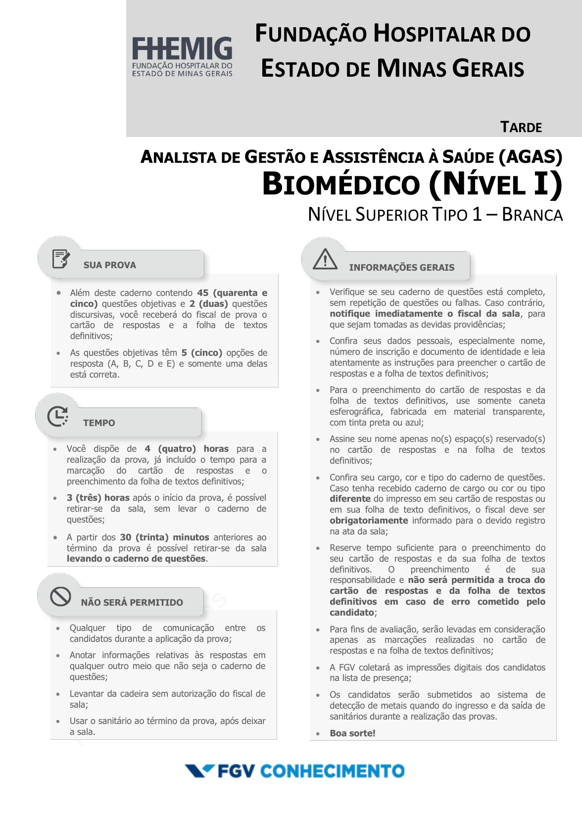 pcimarkpci MjgwNDowZDQ5OjQ4MDg6ZjcwMDoyMTE3OmVmNzA6YTJkZDpjNDg3:VHVlLCAxNiBTZXAgMjAyNSAxNjoyOToyOSAtMDMwMA== www.pciconcursos.com.br FUNDAÇÃO HOSPITALAR DO ESTADO DE MINAS GERAIS TARDE ANALISTA DE GESTÃO E ASSISTÊNCIA À SAÚDE (AGAS) BIOMÉDICO (NÍVEL I) NÍVEL SUPERIOR TIPO 1 – BRANCA Além deste caderno contendo 45 (quarenta e cinco) questões objetivas e 2 (duas) questões discursivas, você receberá do fiscal de prova o cartão de respostas e a folha de textos definitivos; As questões objetivas têm 5 (cinco) opções de resposta (A, B, C, D e E) e somente uma delas está correta. Verifique se seu caderno de questões está completo, sem repetição de questões ou falhas. Caso contrário, notifique imediatamente o fiscal da sala, para que sejam tomadas as devidas providências; Confira seus dados pessoais, especialmente nome, número de inscrição e documento de identidade e leia atentamente as instruções para preencher o cartão de respostas e a folha de textos definitivos; Para o preenchimento do cartão de respostas e da folha de textos definitivos, use somente caneta esferográfica, fabricada em material transparente, com tinta preta ou azul; Assine seu nome apenas no(s) espaço(s) reservado(s) no cartão de respostas e na folha de textos definitivos; Confira seu cargo, cor e tipo do caderno de questões. Caso tenha recebido caderno de cargo ou cor ou tipo diferente do impresso em seu cartão de respostas ou em sua folha de texto definitivos, o fiscal deve ser obrigatoriamente informado para o devido registro na ata da sala; Reserve tempo suficiente para o preenchimento do seu cartão de respostas e da sua folha de textos definitivos. O preenchimento é de sua responsabilidade e não será permitida a troca do cartão de respostas e da folha de textos definitivos em caso de erro cometido pelo candidato; Para fins de avaliação, serão levadas em consideração apenas as marcações realizadas no cartão de respostas e na folha de textos definitivos; A FGV coletará as impressões digitais dos candidatos na lista de presença; Os candidatos serão submetidos ao sistema de detecção de metais quando do ingresso e da saída de sanitários durante a realização das provas. Boa sorte! Você dispõe de 4 (quatro) horas para a realização da prova, já incluído o tempo para a marcação do cartão de respostas e o preenchimento da folha de textos definitivos; 3 (três) horas após o início da prova, é possível retirar-se da sala, sem levar o caderno de questões; A partir dos 30 (trinta) minutos anteriores ao término da prova é possível retirar-se da sala levando o caderno de questões. Qualquer tipo de comunicação entre os candidatos durante a aplicação da prova; Anotar informações relativas às respostas em qualquer outro meio que não seja o caderno de questões; Levantar da cadeira sem autorização do fiscal de sala; Usar o sanitário ao término da prova, após deixar a sala. SUA PROVA TEMPO NÃO SERÁ PERMITIDO INFORMAÇÕES GERAIS pcimarkpci MjgwNDowZDQ5OjQ4MDg6ZjcwMDoyMTE3OmVmNzA6YTJkZDpjNDg3:VHVlLCAxNiBTZXAgMjAyNSAxNjoyOToyOSAtMDMwMA== www.pciconcursos.com.br FUNDAÇÃO HOSPITALAR DO ESTADO DE MINAS GERAIS - FHEMIG FGV Analista de Gestão e Assistência à Saúde (AGAS) - Biomédico (Nível I) Tipo Branca – Página 2 MÓDULO I - CONHECIMENTOS BÁSICOS Língua Portuguesa 1 Nas opções a seguir, há a indicação de uma figura de linguagem com um exemplo correspondente. Assinale a opção em que a indicação do exemplo está correta. (A) Personificação: Por mim, teria evitado casar até mesmo com a sabedoria, caso ela me quisesse. (B) Antítese: A esposa diligente é a coroa do seu marido; e a que lhe causa problemas é o câncer dos seus ossos. (C) Eufemismo: Um marido nunca deve ser o primeiro a pegar no sono nem o último a acordar. (D) Paradoxo: Estou para realizar minha última viagem, um grande salto no escuro. (E) Hipérbole: O infinito é uma esfera infinita, cujo centro está em toda parte e a circunferência em nenhum lugar. 2 Biscoito significa “cozido duas vezes” (bis+ coctu), pois era, na verdade, o que acontecia: coziam a massa duas vezes para que, endurecida pela desidratação, pudesse durar mais tempo, o que era muito útil nas viagens demoradas pelo mar. BIS é um radical latino - também assume a forma BI (biforme) ou BA (balança) -, que entra como primeiro elemento na construção de novos vocábulos, com valor semântico de “dois ou duas vezes”. Assinale a opção em que, usando esse radical, o vocábulo indicado está correto. (A) Que tem dois pés: bipedestre. (B) Que ocorre de dois em dois meses: bimensal. (C) Que ocorre uma vez a cada dois anos: bianual. (D) Casado com duas esposas: bígamo. (E) Que fala duas línguas: biarticulado. 3 Assinale a opção em que todos os vocábulos grafados com e ou i estão escritos corretamente. (A) adiante / lampião / crâneo. (B) veado / pior / casimira. (C) palitó / Pireneus / arrepio. (D) irriquieto / digladiar / dilapidar. (E) crioulo / pátio / confissionário. 4 “Uns homens sobem por leves como os vapores e gazes, outros como os projetis pela força do engenho e dos talentos.” Marquês de Maricá. Sobre a estruturação dessa frase, assinale a observação incorreta. (A) O termo “Uns” corresponde estruturalmente a “outros”. (B) A forma verbal “sobem” está omitida na oração seguinte. (C) A preposição “por” tem o valor de “causa”. (D) O termo “como os vapores e gases” corresponde estruturalmente a “como os projetis”. (E) Os termos “por leves” e “pela força dos engenhos e dos talentos” correspondem-se estrutural e semanticamente. 5 O processo de reificação corresponde a tratar-se o ser humano como uma coisa, um objeto qualquer. Esse processo aparece nas opções a seguir, à exceção de uma. Assinale-a. (A) As garrafas de refrigerantes, quando retiradas da geladeira, ficam imediatamente suadas. (B) Nas grandes cidades, os