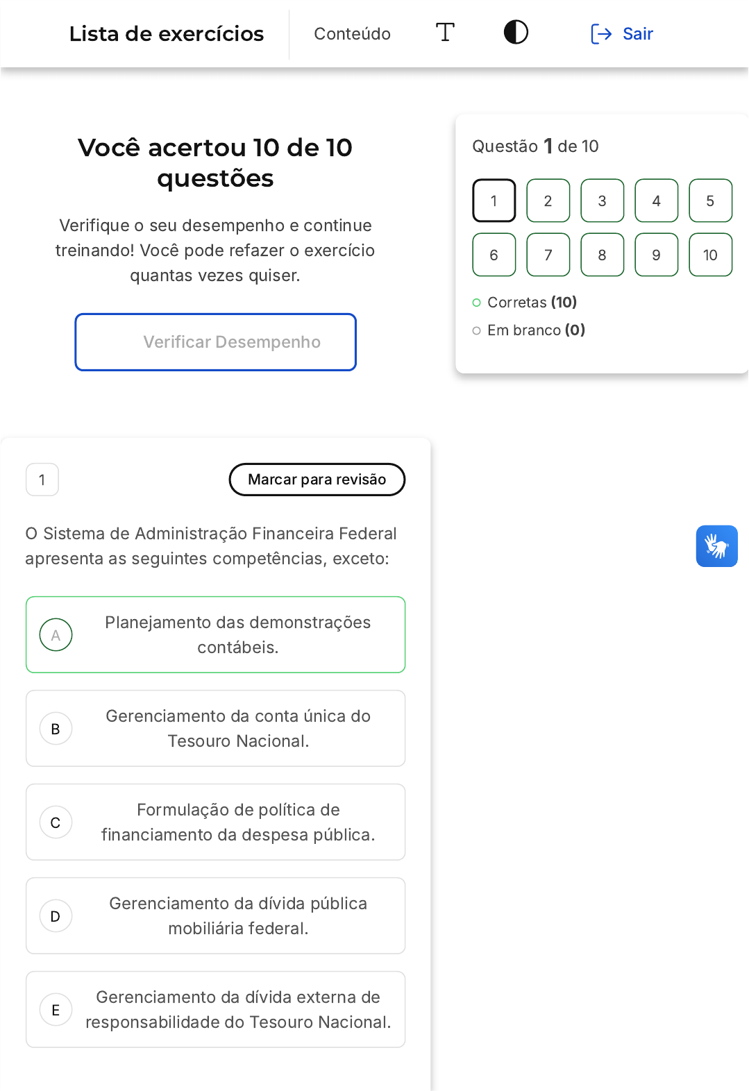 Você acertou 10 de 10 questões Verifique o seu desempenho e continue treinando! Você pode refazer o exercício quantas vezes quiser. Verificar Desempenho A B C D E 1 Marcar para revisão O Sistema de Administração Financeira Federal apresenta as seguintes competências, exceto: Planejamento das demonstrações contábeis. Gerenciamento da conta única do Tesouro Nacional. Formulação de política de financiamento da despesa pública. Gerenciamento da dívida pública mobiliária federal. Gerenciamento da dívida externa de responsabilidade do Tesouro Nacional. Questão 1 de 10 Corretas (10) Em branco (0) 1 2 3 4 5 6 7 8 9 10 Lista de exercícios Conteúdo Sair Resposta correta Parabéns, você selecionou a alternativa correta. Confira o gabarito comentado! Gabarito Comentado A alternativa correta é a letra A, que menciona o "Planejamento das demonstrações contábeis". Isso porque, embora o Sistema de Administração Financeira Federal seja responsável por diversas funções importantes, o planejamento das demonstrações contábeis não está entre suas competências. As demonstrações contábeis são geralmente preparadas e planejadas pelos contadores e auditores das entidades, e não pelo Sistema de Administração Financeira Federal. Portanto, essa alternativa é a única que não se enquadra nas competências do Sistema de Administração Financeira Federal. 2 Marcar para revisão O controle administrativo pode ser classificado quanto à sua origem de três formas: controle interno, controle externo e controle social. Sobre o controle externo na Administração Pública, podemos afirmar que: A B C D E O controle externo é feito por empresas terceirizadas. A terceirização contribui para maior eficácia do controle externo. É o controle exercido por um Poder, em relação a outro Poder. O controle externo é feito pelo controle interno, de forma remota. O Poder Executivo não tem controle externo por ser soberano. Resposta correta Parabéns, você selecionou a alternativa correta. Confira o gabarito comentado! Gabarito Comentado A alternativa correta é a letra C: "É o controle exercido por um Poder, em relação a outro Poder". Isso significa que o controle externo na Administração Pública é exercido por um Poder sobre outro, como uma forma de fiscalização e equilíbrio entre os Poderes. Por exemplo, o Poder Judiciário pode exercer controle externo sobre o Poder Executivo, verificando a legalidade de suas ações e decisões. Portanto, o controle externo não está relacionado com empresas terceirizadas, com a eficácia da terceirização, com o A B C D E controle interno ou com a soberania do Poder Executivo. 3 Marcar para revisão As Normas Brasileiras de Auditoria do Setor Público foram divididas em três níveis. Assinale a alternativa incorreta quanto aos pontos abordados nessas normas. Independência dos Tribunais de Contas. Transparência e accountability. Controle de qualidade das auditorias. Conjuntura econômica em tempos de crise. Princípios fundamentais de auditoria financeira. Resposta correta Parabéns, você selecionou a alternativa correta. Confira o gabarito comentado! Gabarito Comentado A alternativa D é a incorreta. As Normas Brasileiras de Auditoria do Setor Público não abordam a conjuntura econômica em tempos de crise. Elas focam em aspectos A B C D E como a independência dos Tribunais de Contas, a transparência e a accountability, o controle de qualidade das auditorias e os princípios fundamentais de auditoria financeira. A conjuntura econômica em tempos de crise é um tema que, embora importante, não é diretamente tratado nessas normas. 4 Marcar para revisão A norma NBASP 400 trata dos princípios fundamentais da auditoria de conformidade. Assinale a alternativa que não tenha correspondência com essa norma. Abordagem quantitativa. Abordagem qualitativa. Definição de princípios e normas. Foco no papel do gestor. Aderência às leis. Resposta correta Parabéns, você selecionou a alternativa correta. Confira o gabarito comentado! Gabarito Comentado A B C D E A norma NBASP 400 trata dos princípios fundamentais da auditoria de conformidade, que são: definição de princípios e normas, abordagem quantitativa e abordagem qualitativa. O foco no papel do gestor não é um princípio fundamental da auditoria de conformidade. 5 Marcar para revisão Das competências abarcadas pelo Sistema de Contabilidade Federal, assinale a alternativa que tenha correspondência a uma delas. Visão contábil, dependente das receitas do gestor. Visão Financeira, a partir da presidência. Elaboração de Balanços Gerais da União. Construção de indicadores ambientais. Visão holística da atuação de servidores públicos. Resposta correta Parabéns, você selecionou a alternativa correta. Confira o gabarito comentado! A B C Gabarito Comentado A alternativa correta é a letra C, que menciona a "Elaboração de Balanços Gerais da União". Esta é uma das competências do Sistema de Contabilidade Federal. O balanço geral é um relatório contábil que apresenta a posição financeira e patrimonial de uma entidade em um determinado período, neste caso, da União. As outras alternativas não correspondem às competências do Sistema de Contabilidade Federal. 6 Marcar para revisão A INTOSAI, organização de referência para definição de normas de auditoria na Administração Pública, define os principais objetivos de sua atuação. Sob este aspecto, assinale a alternativa que não corresponde a um de seus objetivos. Melhorias no processo de auditoria governamental. Gestão do conhecimento. Seleção de funcionários de alto escalão terceirizados. D E Promoção do desenvolvimento permanente. Organização norteadora das ações das entidades fiscalizadoras superiores. Resposta correta Parabéns, você selecionou a alternativa correta. Confira o gabarito comentado! Gabarito Comentado A INTOSAI não tem como objetivo a seleção de funcion
