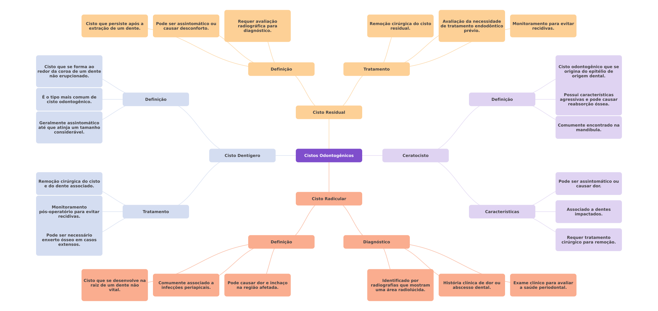 Pode ser assintomático ou Requer avaliação Avaliação da necessidade Cisto que persiste após a extração de um dente. causar desconforto. radiográfica para Remoção cirúrgica do cisto de tratamento endodôntico Monitoramento para evitar residual. recidivas. diagnóstico. prévio. Cisto que se forma ao Cisto odontogênico que se Definição Tratamento redor da coroa de um dente origina do epitélio de não erupcionado. origem dental. Possui características É tipo mais comum de cisto odontogênico. Definição Definição agressivas e pode causar reabsorção óssea. Cisto Residual Geralmente assintomático Comumente encontrado na até que atinja um tamanho mandíbula. considerável. Cisto Dentígero Cistos Odontogênicos Ceratocisto Remoção cirúrgica do cisto Pode ser assintomático ou e do dente associado. causar dor. Cisto Radicular Monitoramento Associado a dentes pós-operatório para evitar Tratamento Características recidivas. impactados. Pode ser necessário enxerto ósseo em casos Requer tratamento Definição Diagnóstico extensos. cirúrgico para remoção. Cisto que se desenvolve na Comumente associado a Identificado por Pode causar dor e inchaço História clínica de dor ou raiz de um dente não infecções periapicais. radiografias que mostram Exame clínico para avaliar vital. na região afetada. abscesso dental. uma área radiolúcida. a saúde periodontal.