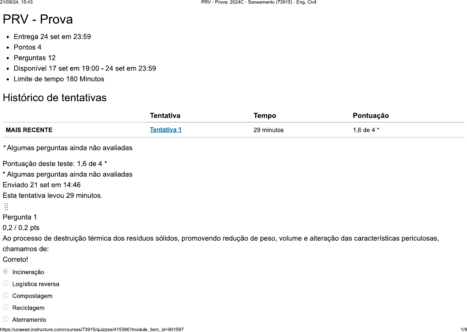 21/09/24, 15:43 PRV Prova: 2024C Saneamento (73915) Eng. Civil PRV - Prova Entrega 24 set em 23:59 Pontos 4 Perguntas 12 Disponível 17 set em 19:00 24 set em 23:59 Limite de tempo 180 Minutos Histórico de tentativas Tentativa Tempo Pontuação MAIS RECENTE Tentativa 1 29 minutos 1,6 de perguntas ainda não avaliadas Pontuação deste teste: 1,6 de * Algumas perguntas ainda não avaliadas Enviado 21 set em 14:46 Esta tentativa levou 29 minutos. Pergunta 1 0,2 / 0,2 pts Ao processo de destruição térmica dos resíduos sólidos, promovendo redução de peso, volume e alteração das características periculosas, chamamos de: Correto! Incineração Logística reversa Compostagem Reciclagem Aterramento 1/921/09/24, 15:43 PRV Prova: 2024C Saneamento (73915) Eng. Civil Pergunta 2 0,2 / 0,2 pts A drenagem e o manejo de águas pluviais busca reduzir os impactos sociais, econômicos e ambientais de eventos hidrológicos extremos. Sobre as infraestruturas de microdrenagem e de macrodrenagem, assinale a alternativa correta: Na microdrenagem há os corpos hídricos que recebem as águas pluviais Poços de visita são condutos usados no transporte da água captada pelas bocas-de-lobo às galerias Bacias de detenção são condutos abertos ou fechados usados para transporte da água em superfície livre Correto! Bocas-de-lobo são estruturas de microdrenagem, responsáveis pela captação da água pluvial que é conduzida pelas sarjetas As galerias são estruturas de macrodrenagem que possibilitam a inspeção e manutenção da rede Pergunta 3 0,2 / 0,2 pts No contexto da drenagem e manejo de águas pluviais, há as medidas de controle estruturais e não estruturais. Sobre essas medidas, leia as afirmações que seguem: I. Medidas não estruturais envolvem ações operacionais e educacionais II. Medidas não estruturais necessitam de legislação apropriada III.. Medidas estruturais envolvem obras de engenharia IV. Medidas estruturais proporcionam a infiltração localizada da água É correto o que se afirma: Apenas em I, e III Apenas em II, III e IV Correto! Em I, II, III e IV 2/921/09/24, 15:43 PRV Prova: 2024C Saneamento (73915) Eng. Civil Apenas em I e Apenas em e III Pergunta 4 0,2 / 0,2 pts As doenças de veiculação hídrica, na ótica do mecanismo de transmissão, são divididas em algumas categorias. Sobre essas categorias, assinale a alternativa correta: Transmissão relacionada com a higiene pessoal, transmissão relacionada ao tipo sanguíneo e transmissão hídrica Correto! Transmissão hídrica, transmissão relacionada com a higiene, transmissão baseada na água e transmissão por um inseto vetor Transmissão hídrica, transmissão por ciclo de vida do microrganismo e transmissão baseada na água Transmissão relacionada com a higiene, transmissão relacionada com ciclo de vida do microrganismo e transmissão baseada na água Transmissão baseada na água, transmissão por tipo de tratamento do doente, transmissão por inseto vetor Pergunta 5 0,2 / 0,2 pts As doenças relacionadas por contaminação de fezes podem ser causadas por bactérias, vírus, protozoários e helmintos. Sobre essas doenças, assinale a alternativa que indica uma provocada por vírus: Toxoplasmose Correto! Hepatite A Ascaridíase Cólera Cisticercose Pergunta 6 0,2 / 0,2 pts 3/921/09/24, 15:43 PRV Prova: 2024C Saneamento (73915) Eng. Civil Sobre o Sistema Alternativo de Tratamento de Água (SALTA-Z), leia as afirmações que seguem: I. Trata-se de uma solução alternativa simples, de baixo custo que engloba captação, tratamento e reservação da água PORQUE 1. É constituído de tubulação de recalque de água bruta, coagulação, desinfecção, filtração e de um reservatório de água É correto que se afirma em: A asserção I é uma proposição falsa e a II é uma proposição verdadeira. Correto! As asserções e são proposições verdadeiras e a é uma justificativa da I. As asserções e são proposições verdadeiras, mas a não é justificativa da I. A asserção é uma proposição verdadeira e a é uma proposição falsa. As asserções e são proposições falsas. Pergunta 7 0 / 0,2 pts De acordo com a lei n° 11.445 de 2007, esgotamento sanitário é "constituído pelas atividades, infraestruturas e instalações operacionais de coleta, transporte, tratamento e disposição final adequados dos esgotos sanitários, desde as ligações prediais até seu lançamento no meio ambiente". Sobre as partes constituintes do sistema público convencional de esgotamento sanitário, assinale a alternativa correta: Interceptor é uma tubulação que não recebe contribuições ao longo do percurso, ou seja, recebe o esgoto apenas na extremidade de montante Resposta correta Coletor-tronco é uma tubulação responsável pelo recebimento da contribuição de esgoto de outros coletores Você respondeu Rede coletora é a canalização que recebe os coletores ao longo do seu comprimento e não recebe ligações prediais diretas Estação elevatória é uma estrutura que permite ultrapassar obstáculos e depressões do terreno Sifão invertido é uma estação de recalque que bombeia os esgotos para uma cota superior https://ucaead.instructure.com/courses/73915/quizzes/415386?module_iten_id=901587 4/921/09/24, 15:43 PRV Prova: 2024C Saneamento (73915) Eng. Civil Pergunta 8 0,2 / 0,2 pts A concepção do sistema de esgotamento sanitário envolve uma série de estudos, das diferentes partes constitutivas do sistema, para a escolha do melhor arranjo. Sobre a concepção do sistema de esgotamento sanitário, leia as afirmações que seguem e assinale V para as verdadeiras e F para as falsas: É preciso analisar dados censitários É preciso conhecer as condições atuais sanitárias É preciso caracterizar os corpos hídricos receptores É preciso fazer uma estimativa das alternativas estudadas Assinale a alternativa com a correta associação: F,V,V,F F,F,F,F , Correto! V,V,V,V V,F,V,F F,V,V,V Pergunta 9 0,2 