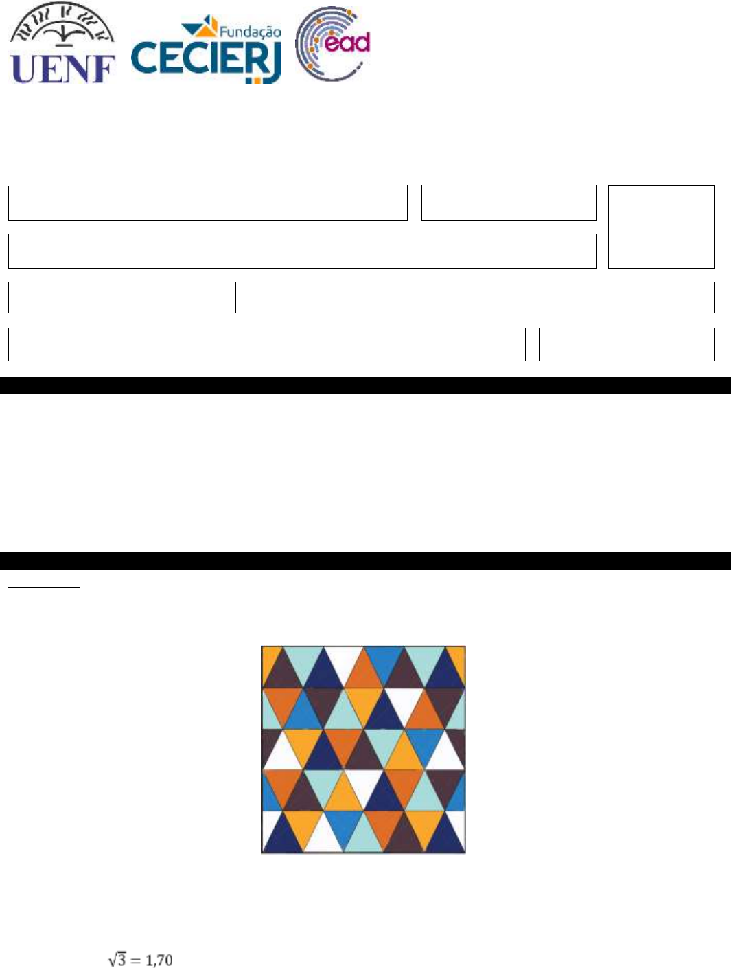 AP2 - MATEMÁTICA NA EDUCAÇÃO II - EAD08217 – 1/2024 -Resolução CURSO LICENCIATURA EM PEDAGOGIA PERÍODO 4º NOTA NOME MATRÍCULA POLO ASSINATURA DATA 19/05/2024 INSTRUÇÕES Chegamos o dia em que ocorrerá nossa segunda avaliação presencial. A AP2 avaliará a compreensão dos principais conceitos abordados nas aulas 15 a 28 dos módulos 2 e 3 do nosso livro Matemática na Educação 2, bem como suas inter-relações e aplicações. A AP2 valerá 10 pontos, equivalentes a 40% do total de pontos distribuídos na disciplina. Esperamos disponibilizar as notas no sistema acadêmico em no máximo 15 dias após a realização das provas. Na ocasião, caso julgar necessário, você poderá solicitar a revisão da prova, acessando o link na plataforma. Todas as questões deverão ser respondidas à caneta. Não serão permitidas rasuras, caso ocorram, a questão poderá será anulada. Não será permitido a utilização de calculadora. QUESTÕES Questão 1 (valor 1,5 pt) A Figura abaixo é um Mosaico retangular formado por triângulos equiláteros e triângulos retângulos. Os triângulos equiláteros são os triângulos que possuem os três lados iguais e os triângulos retângulos são os triângulos que possuem um dos seus ângulos internos reto, ou seja, de 90º. Analisando este mosaico, responda: a) Quantos triângulos foram utilizados nesta construção? Informe quantos triângulos são equiláteros? Foram utilizados 55 triângulos. São 10 triângulos retângulos e 45 triângulos equiláteros. b) Sabendo que o lado do triângulo equilátero é igual a L = 2 cm e que, nesse mosaico, a área do triângulo retângulo é a metade da área do triângulo equilátero, calcule a área total desse mosaico. Utilize . Como temos 45 triângulos equiláteros, então a área total dos triângulos equiláteros (A1) é: 45 x (2/2) x 1,7 = 76,5 cm2. A área total dos triângulos retângulos (A2) é: (10 x (2/2) x 1,7) /2 = 8,5 cm2. Sendo assim, a área total desse mosaico é dada por: AT = A1 + A2 = 85 cm2. Universidade Estadual do Norte Fluminense Consórcio CEDERJ Coordenador: Prof. Nelson Barbosa Sugestão: Para calcular a altura do triângulo equilátero (H), utilize a fórmula abaixo, onde L é o lado do triângulo equilátero. Questão 2 (valor 1,5 pt) Complete a Tabela abaixo, relacionando unidades de medida de tempo, massa e comprimento. Dez horas .... 60...........minutos Três quilômetros ...... 3000.........metros Três semestres ...... 18..........meses Cinco quilogramas ........ 5000........gramas Quatro décadas ....... 40.........anos Vinte metros ...... 2000.........centímetros Questão 3 (valor 1,5 pt) Se é escolhido aleatoriamente um número da sequência (16, 8, 4, 2, 1, 1/2, 1/4, 1/8) qual a probabilidade de: a) Escolher um número inteiro? P1=5/8. b) Escolher um número racional (fração unitária)? P2=3/8. Questão 4 (valor 2,0 pontos) As vistas de uma mesma pilha de cubos são as seguintes: a) Informe a quantidade de cubos nessa pilha; São 14 cubos no total. b) Sabendo que todos os cubos são iguais, com aresta medindo 3 cm, calcule o volume dessa pilha. V= (3 x 3 x 3) x 14 = 378 cm3. Questão 5 (valor 2,0 pts) Caio é estudante do Curso de Biologia do Cederj. Ele e o restante da sua turma (Sônia, Beatriz, Ricardo e Laura) realizaram uma pesquisa para saber a opinião das pessoas sobre a preservação do meio ambiente. Veja os dados que eles coletaram. Fonte: (Matemática Essencial, Pataro & Balestri) Em vista das informações acima, faça o que se pede: a) Organize em uma tabela os dados coletados pelos estudantes. Fonte: (Matemática Essencial, Pataro & Balestri) b) Sabendo que cada entrevistado escolheu apenas uma atitude, informe quantas pessoas foram entrevistadas. 75 pessoas. c) De acordo com as informações da tabela organizada por você no item a, construa um gráfico de colunas. d) Escreva um texto contendo as suas conclusões em relação a essa pesquisa. Pessoal. Questão 6 (valor 1,5 pontos) A Pesquisa Nacional de Saúde do Escolar, gerenciado pelo Instituto Brasileiro de Geografia e Estatística (IBGE), apresentou uma pesquisa em 2019, que 53,1% dos escolares de 13 a 17 anos no Brasil tinham o hábito de permanecer sentados por mais de três horas diárias, dedicando esse tempo à exposição a diversos tipos de telas (televisão, videogame, tablet, computador, celular etc). O tempo dedicado a assistir à televisão é levemente superior entre as meninas (54,3%) quando comparado aos meninos (51,9%). Também é relativamente mais frequente entre os alunos de escolas públicas (37,2%) o tempo de televisão superior a duas horas quando comparados aos da rede privada (28,7%). O gráfico adiante apresenta o percentual de escolares de 13 a 17 anos com tempo de tela secundária nas regiões brasileiras. Considerando o texto e as informações apresentadas no gráfico acima, podemos afirmar que: a) 35,20% dos escolares de 13 a 17 anos da Região Centro Oeste possuem menos de duas horas diárias de televisão. b) Mais de 50% dos escolares de 13 a 17 anos da Região Nordeste possuem mais de três horas diárias realizando atividades sentado. c) Em termos percentuais, a Região Sul possui a maior proporção de escolares de 13 a 17 anos no Brasil, que possuem mais de duas horas diárias de televisão. d) Menos de 30% dos escolares de 13 a 17 anos da Região Norte possuem mais de três horas diárias realizando atividades sentado. e) Mais de 50% dos escolares de 13 a 17 anos da Região Sudeste possuem mais de três horas diárias realizando atividades sentado.