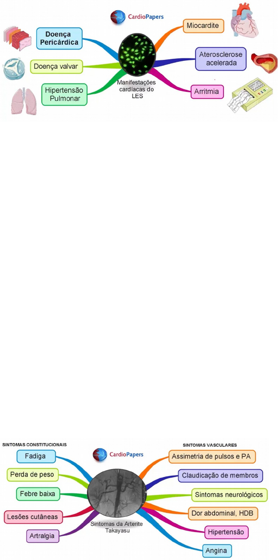 DOENÇAS CARDIOVASCULARES SISTÊMICAS LUPUS ERITEMATOSO SISTÊMICO DIAGNÓSTICO = CRITÉRIO EULAR = FAN > 1:80 + 10 PONTOS ACOMETIMENTO CARDIOVASCULAR MAIS COMUM = PERICARDITE ENDOCARDITE DE LIBMAN-SACKS = VEGETAÇÕES VERRUCOSAS ESTÉREIS (DEPÓSITO DE IMUNOCOMPLEXOS) = MAIS COMUM EM LES + SAAF PODE HAVER MIOCARDITE POR HIDROXICLOROQUINA BAVT CONGÊNITO = MÃE ANTI-RO + SÍNDROME ANTICORPO ANTIFOSFOLÍPIDE (SAAF) TROMBOSE ARTERIAL E VENOSA HISTÓRIA DE PERDA FETAL 1° TRIMESTRE DE REPETIÇÃO LABORATÓRIO = ANTICARDIOLIPINA (IGG/IGM), ANTICOGULANTE LÚPICO E ANTI-B2-GLICOPRETEÍNA = SE TRIPLO POSITIVO, MAIOR RISCO DE EVENTO TROMBÓTICO ASSOCIADO A LES ACHADO CARDIOVASCULAR MAIS COMUM = ENDOCARDITE DE LIBMAN-SACKS ANTICOAGULAÇÃO = NÃO PODE DOAC (ESTUDO TRAPS) LÚPUS INDUZIDO POR FÁRMACOS REAÇÃO ADVERSA AUTOIMUNE LABORATÓRIO = ANTI-HISTONA PSOITIVO EM 90-95% DOS CASOS FÁRMACOS MAIS COMUNS = HIDRALAZINA, DILTIAZEM, PROCAINAMIDA, ISONIAZIDA, METILDOPA, CLORPROMAZINA ARTERITE DE TAKAYASU PROCESSO INFLAMATÓRIO GARBDES VASOS = PODE LEVAR A ESTENOSE, OCLUSÃO E DILATAÇÃO MULHERES, ENTRE 10-40 ANOS, ASIÁTICA ACOMETIMENTO = 50% ACOMETIMENTO AORTA ABDOMIAL E ARTÉRIAS PULMONARES ALTERAÇÃO COSTUMA INICIAR EM A. SUBCLÁVIA ESQUERDA = CAUSANDO CLAUDICAÇÃO EM MMSS ARTERITE TEMPORAL OU ARTERITE DE CÉLULAS GIGANTES ACOMETE MÉDIOS E GRANDES VASOS ASSOCIADO A POLIMIALGIA REUMÁTICA PRINCIPAL CAUSA = CEFALEIA PODE OCASIONAR AMAUROSE FUGAZ E CLAUDICAÇÃO DE MANDÍBULA ACOMETIMENTO CARDIOVASCULAR = ANEURISMA AORTA TORÁCICA DIAGNÓSTICO = BIÓPSIA DE A. TEMPORAL DOENÇA DE KAWASAKI VASCULITE MAIS COMUM NA INFÂNCIA ( REMODELAMENTO E DANO VASCULAR = FIBROSE MIOCÁRDICA COM PADRÃO EM MOSAICO (PEQUENAS ISQUEMIAS) PODE HAVER FIBROSE SISTEMA DE CONDUÇÃO HIPERTENSÃO PULMONAR OCORRE EM ATÉ 25% DOS PACIENTES, PODENDO EVOLUIR COM IC DIREITA (GRUPO I OU GRUPO III) CRISE RENAL ESCLERODÉRMICA = HAS SEVERA E SINTOMAS DE IC = RESPONDE BEM A IECA HIPERURICEMIA DROGAS QUE AUMENTAM = DIURÉTICOS TIAZÍDICOS E D EALÇA, BBLOQ, ASPIRINA DROGAS QUE REDUZEM = LOSARTANA, IECA, ATORVASTATINA, FIBRATOS SE ASSINTOMÁTICO = BENEFÍFIO DE TRATAR NÁO É BEM DEFINIDO = NÃO RECOMENDADO TRATAR SE GOTA, NEFROPATIA OU CÁLCULOS POR ÁCIDO ÚRICO OBESIDADE RISCO DE DM AUMENTA EM 4,5% A CADA KG DE AUMENTO DE PESO ALTERAÇÕES CARDIOVASCULARES = AUMENTO VOLUME SANGUPINEO, AUMENTO DO DÉBITO CARDÍACO, AUMENTO DE PRESSÕES DE ENCHIMENTO DO VE ESSAS ALTERAÇÕES DE FORMA CRÔNICA PODEM LEVAR A HIPERTROFIA EXCÊNTRICA POR SOBRECARGA DE VOLUME GORDURA ABDOMINAL = EXCESSO DE GORDURA VISCERAL = ACOMPANHADO POR ACÚMULO EM OUTROS TECIDOS, COMO CORAÇÃO, FÍGADO, RINS, PÂNCREAS E MPUCULO ESQUELÉTICO CIRCUNFERÊNCIA ABDOMINAL = MAIS RELACIONADA COM RISCO CV INDEPENDENTE DO IMC PREDITIVO DE OBESIDADE VISCERAL = CIRCUNFERÊNCIA ABDOMINAL ≥ 90CM HOMEM OU ≥ 85CM MULHER MAIS TRIGLICERÍDEOS ≥ 177 MG/DL HOMEM OU ≥ 133 MG/DL EM MULHER DIABETES MELLITUS FATOR DE RISCO INDEPENDENTE PARA DOENÇA ATEROSCLERÓTICA/DAC DAC NA DM = COSTUMA TER MAIS SINTOMAS ATÍPICOS, INFARTOS MAIORES E MAIS COMPLICAÇÃO PÓS-IAM PODE HAVER ALTERAÇÃO DE FUNÇÃO SISTÓLICA E DIASTÓLICA E DOENÇA MICROVASCULAR CARDIOMIOPATIA RESTRITIVA ASSOCIADO A DM = ALTERAÇÃO DE RELAXAMENTO VENTRICULAR, AUMENTO DE PRESSÕES DE ENCHIMENTO, BIÓPSIA COM FIBROSE INTERSTICIAL E ESPESSAMENTO INTRAMURAL ARTERIAL HIPOTIREOIDISMO REDUÇÃO DE DC, VS, FC E PRESSÃO DE PULSO (PP) AUMENTO DE PERFIL LIPÍDICO (CT, LDL, TG) E CPK (EM ATÉ 10X) ALTERAÇÃO CARDIOVASCULAR = BRADICARDIA SINUSAL, BAIXA VOLTAGEM, DERRAME PERICÁRDICO (EM ATÉ 1/3 DOS CASOS) TAMPONAMENTO CARDÍACO É RARO (POIS A FORMAÇÃO É LENTA) HIPERTIREIDISMO APRESENTAÇÃO = PALPITAÇÕES, FADIGA, HIPERTENSÃO SISTÓLICA, AUMENTO PP, IC ARRTIMIAS = TAQUICARDIA SINUSAL (40%) E FA EM ATÉ 15% ASSOCIAÇÃO COM PVM TRATAMENTO = ANTI-TIREOIDEANOS (METIMAZOL, PTU), IODO, TIREOIDECTOMIA, BBLOQ EFEITOS ADVERSOS MAIORES DA VACINA CONTRA COVID-19 TROMBOCITOPENIA TROMBÓTICA INDUZDA POR VACINA - VACINAS COM VETOR ADENOVIRUS (ASTRAZENECA/OXFORD, JANSSEN, J&J) - OCORRÊNCIA É RARA = 1 EM 263.000 PESSOAS VACINADAS - PREVALÊNCIA DE EVENTOS TROMBÓTICOS EM PACIENTES COM COVID É MUITO MAIOR EM PACIENTES NÃO VACINADOS - TRATAMENTO = IMUNOGLOBULINA E SUSPENDER HEPRINA (MESMA LÓGICA DO HIT) - TROCA DE PLATAFORMA DE VACINA MIOCARDITE INDUZIDA PLEA VACINA - VACINAS DE RNAm (PFIZER, MODERNA) - OCORRÊNCIA 1,4 EM 100.000 VACINADOS NOS PRIMEIROS 28 DIAS - TRATAMENTO DE MIOCARDITE - TROCA DE PLATAFORMA DE VACINA image7.png image1.png image2.png image3.png image4.png image5.png image6.png
