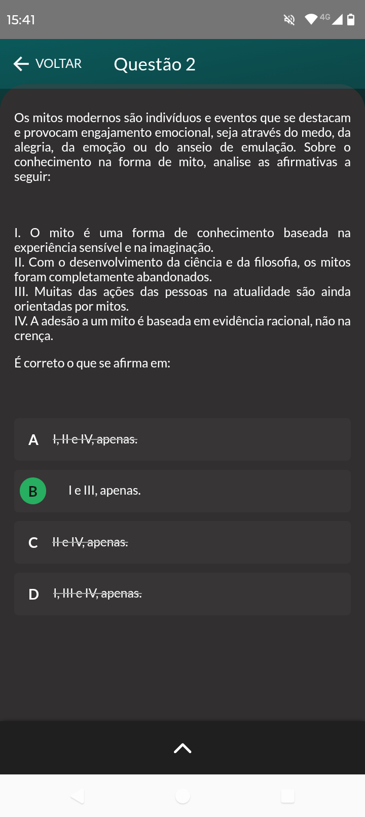 15:41 4G VOLTAR Questão 2 Os mitos modernos são indivíduos e eventos que se destacam e provocam engajamento emocional, seja através do medo, da alegria, da emoção ou do anseio de emulação. Sobre conhecimento na forma de mito, analise as afirmativas a seguir: I. mito é uma forma de conhecimento baseada na experiência sensível e na imaginação. II. Com o desenvolvimento da ciência e da filosofia, os mitos foram completamente abandonados. III. Muitas das ações das pessoas na atualidade são ainda orientadas por mitos. IV. A adesão a um mito é baseada em evidência racional, não na crença. É correto o que se afirma em: A le III, apenas. c D