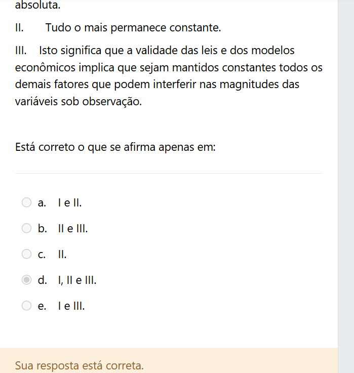 absoluta. II. Tudo mais permanece constante. III. Isto significa que a validade das leis e dos modelos econômicos implica que sejam mantidos constantes todos demais fatores que podem interferir nas magnitudes das variáveis sob observação. Está correto O que se afirma apenas em: a. I e II. b. II e III. C. II. d. I, e III. e. I e III. Sua resposta está correta.