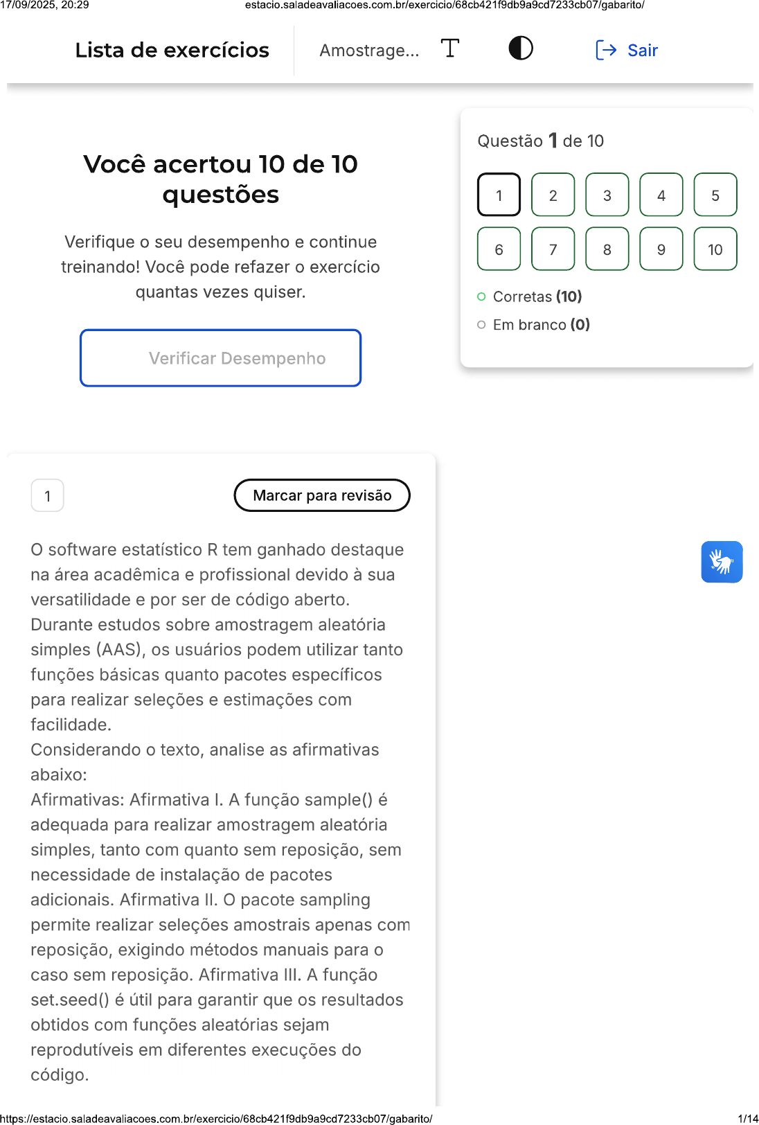17/09/2025, 20:29 estacio.saladeavaliacoes.com.br/exercicio/68cb421f9db9a9cd7233cb07/gabarito/ Lista de exercícios Amostrage... T Sair Questão 1 de 10 Você acertou 10 de 10 questões 1 2 3 4 5 Verifique seu desempenho e continue 6 7 8 9 10 treinando! Você pode refazer exercício quantas vezes quiser. Corretas (10) Em branco (0) Verificar Desempenho 1 Marcar para revisão software estatístico R tem ganhado destaque na área acadêmica e profissional devido à sua versatilidade e por ser de código aberto. Durante estudos sobre amostragem aleatória simples (AAS), os usuários podem utilizar tanto funções básicas quanto pacotes específicos para realizar seleções e estimações com facilidade. Considerando o texto, analise as afirmativas abaixo: Afirmativas: Afirmativa I. A função sample() é adequada para realizar amostragem aleatória simples, tanto com quanto sem reposição, sem necessidade de instalação de pacotes adicionais. Afirmativa II. pacote sampling permite realizar seleções amostrais apenas com reposição, exigindo métodos manuais para caso sem reposição. Afirmativa III. A função set.seed() é útil para garantir que os resultados obtidos com funções aleatórias sejam reprodutíveis em diferentes execuções do código. 1/1417/09/2025, 20:29 estacio.saladeavaliacoes.com.br/exercicio/68cb421f9db9a9cd7233cb07/gabarito/ Marque a alternativa que apresenta a(s) afirmativa(s) correta(s): A I e III c e III D I, e III. E Resposta correta Parabéns, você selecionou a alternativa correta. Confira gabarito comentado! Gabarito Comentado A Afirmativa I está correta porque a função sample() permite realizar amostragens simples com ou sem reposição e já vem carregada no R, dispensando instalação de pacotes. A Afirmativa está incorreta, pois pacote sampling também permite amostragem sem reposição, por meio da função srswor(). A Afirmativa III está correta, pois a função set.seed() define uma semente que garante a reprodutibilidade dos resultados. 2/1417/09/2025, 20:29 estacio.saladeavaliacoes.com.br/exercicio/68cb421f9db9a9cd7233cb07/gabarito/ 2 Marcar para revisão Para analisar a distribuição de uma doença rara em diferentes regiões, um pesquisador opta pela amostragem estratificada no R, dividindo a população em grupos com características similares. Qual pacote do R facilita a implementação de amostragem estratificada? A dplyr. ggplot2. c survey. D lattice. E MASS. Resposta correta Parabéns, você selecionou a alternativa correta. Confira o gabarito comentado! Gabarito Comentado pacote survey no R é mais adequado para implementar a amostragem estratificada. Este pacote oferece funções específicas para o design e análise de amostras complexas, como as estratificadas, permitindo que pesquisador trate adequadamente as 3/1417/09/2025, 20:29 estacio.saladeavaliacoes.com.br/exercicio/68cb421f9db9a9cd7233cb07/gabarito/ diferentes camadas ou estratos da população. 3 Marcar para revisão Você foi contratado para fazer a seleção de 3 vencedores de um prêmio fornecido por uma revista. Foram 5780 cupons preenchidos e adicionados na urna. Após receber a tarefa, você decide usar a função sample no RStudio com uma semente igual a 4. Quais os números obtidos dos vencedores? Está correto que se afirma em: A Cupons: 5624, 587, 2867 Cupons: 1795, 4167, 684 c Cupons: 2038, 4853, 4794 D Cupons: 307, 2360, 5182 E Cupons: 2662, 5250, 5505 Resposta correta Parabéns, você selecionou a alternativa correta. Confira gabarito comentado! Gabarito Comentado Ao utilizar a função sample no RStudio com uma semente igual a 4, os números obtidos 4/1417/09/2025, 20:29 estacio.saladeavaliacoes.com.br/exercicio/68cb421f9db9a9cd7233cb07/gabarito/ para os vencedores são: 5624, 587, 2867. Portanto, a alternativa correta é a "A", que afirma que os cupons vencedores são os de números 5624, 587 e 2867. 4 Marcar para revisão Um estudo sobre a flora de uma floresta utiliza amostragem sistemática no R para coletar dados de diferentes áreas, seguindo um padrão regular de seleção. Qual característica é crucial para realizar uma amostragem sistemática efetiva no R? A Intervalo constante. Diversidade máxima. c Aleatoriedade absoluta. D Estratificação. E Agrupamento. Resposta correta Parabéns, você selecionou a alternativa correta. Confira gabarito comentado! Gabarito Comentado Para realizar uma amostragem sistemática eficaz no R, é essencial ter um intervalo 5/1417/09/2025, 20:29 estaciosaladeavaliacoes.com.br/exercicio/68cb421f9db9a9cd7233cb07/gabarito/ constante. Isso significa selecionar um elemento a cada 'n' intervalos de forma regular, assegurando uma distribuição uniforme e representativa da amostra ao longo da população total. 5 Marcar para revisão Em um estudo para estimar a variação do rendimento escolar, um pesquisador usa R para calcular a variância numa amostra aleatória simples de estudantes. Qual função no R é usada para calcular a variância em uma amostra? A var(). sd(). c mean(). D median(). E range(). Resposta correta Parabéns, você selecionou a alternativa correta. Confira gabarito comentado! Gabarito Comentado 6/1417/09/2025, 20:29 A função var() no R é utilizada para calcular a variância em uma amostra. Esta função é específica para determinar a variância, que é uma medida da dispersão dos dados em torno da média, essencial para entender a variação do rendimento escolar no contexto do estudo. 6 Marcar para revisão Ao trabalhar com amostragem estratificada no R, é possível obter estimativas mais precisas para médias e totais populacionais ao considerar as características da população, como estratos geográficos. pacote survey em conjunto com sampling permite essa abordagem ao especificar adequadamente plano amostral, os pesos e a estrutura dos dados. Considere a aplicação prática de uma amostragem estratificada com alocação proporcional em uma base de municípios, em que a variável REG 
