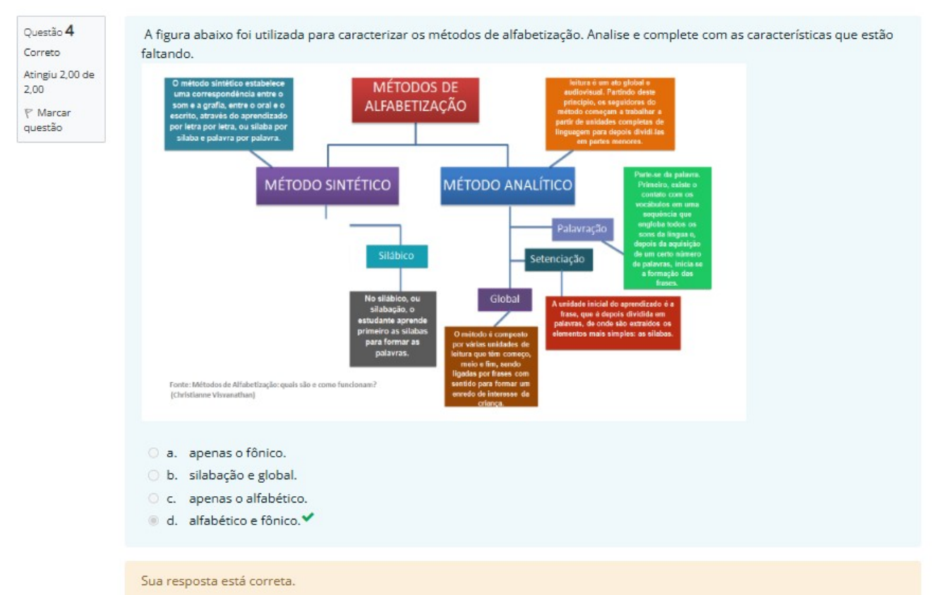 Questão 4 A figura abaixo foi utilizada para caracterizar os métodos de alfabetização. Analise e complete com as características que estão Correto faltando. Atingiu 2,00 de método sintético estabelece 2,00 MÉTODOS DE leitura um ato global uma correspondência entre o Partindo deste som entre oral ALFABETIZAÇÃO principio, seguidores do P Marcar escrito, através do aprendizado método começam trabalher questão por letra por ou silaba por partir de unidades completas de linguagem para depois silaba e palavra por palavra. em partes menores. Parte-se da MÉTODO SINTÉTICO MÉTODO ANALÍTICO existe o contato com os vocábulos em uma que Palavração todos as sons da dapois da aquisição Silábico de um certo Setenciação de palavras, a formação No silábico, ou Global A unidade inicial do é silabação, frase, que é depois em estudante aprende palavras, de onde são primeiro as silabas 0 É composto elementos mais simples: as para formar as por várias unidades de leitura que começo, meio sendo ligadas por frases com Fonte: Métodos de são e como funcionam? sentido para formar um enredo de interesse de a. apenas o b. silabação e global. apenas o alfabético. d. alfabético e fônico. Sua resposta está correta.
