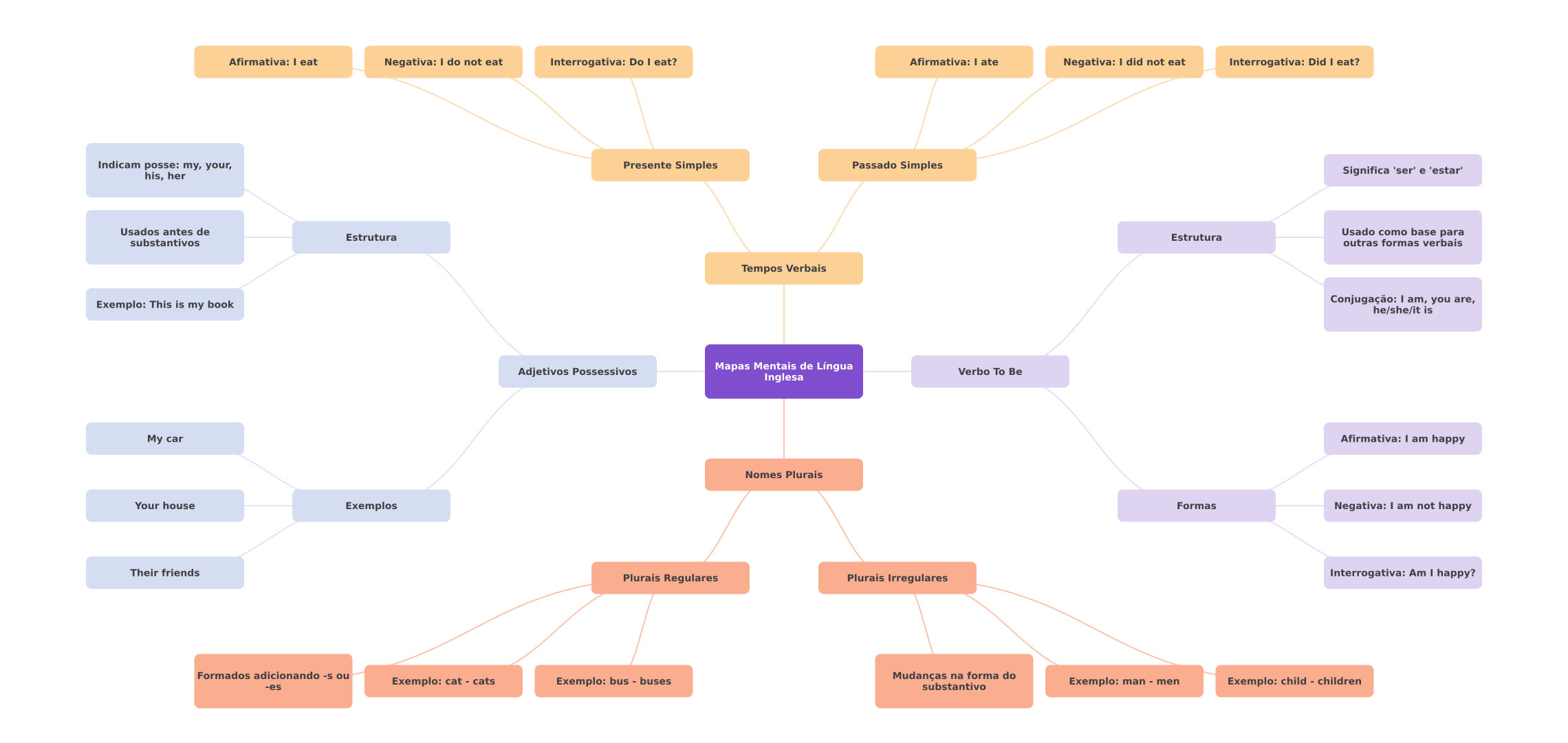 Afirmativa: eat Negativa: I do not eat Interrogativa: Do eat? Afirmativa: ate Negativa: did not eat Interrogativa: Did eat? Indicam posse: my, your, Presente Simples Passado Simples Significa 'ser' e 'estar' his, her Usados antes de Estrutura Estrutura Usado como base para substantivos outras formas verbais Tempos Verbais Exemplo: This is my book Conjugação: I am, you are, he/she/it is Adjetivos Possessivos Mapas Mentais de Língua Verbo To Be Inglesa My car Afirmativa: I am happy Nomes Plurais Your house Exemplos Formas Negativa: I am not happy Their friends Plurais Regulares Plurais Irregulares Interrogativa: Am I happy? Formados adicionando ou Mudanças na forma do Exemplo: cat cats Exemplo: bus buses substantivo Exemplo: man men Exemplo: child children -es