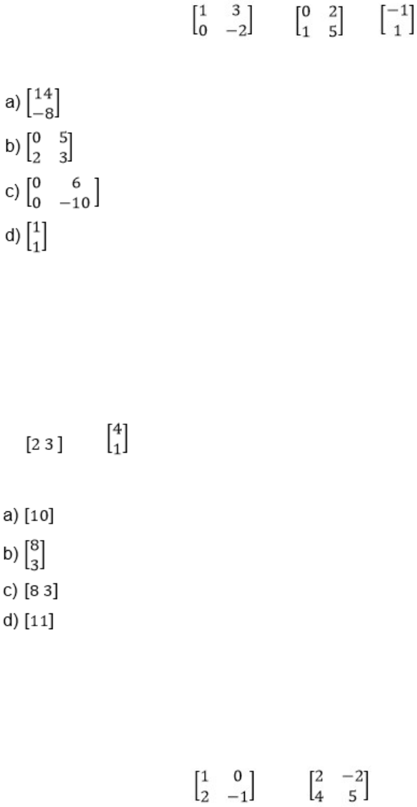 QUESTIONÁRIO I – ÁLGEBRA LINEAR · Dadas as matrizes: A= , B= C= Calcule o produto matricial ABC. Resposta Marcada : Alternativa a). PONTUAÇÃO TOTAL: 2PONTUAÇÃO OBTIDA 2 · Considere a matriz linha Ae a matriz coluna B dadas abaixo: A= B= O produto matricial AB é igual a: Resposta Marcada : Alternativa d). PONTUAÇÃO TOTAL: 2PONTUAÇÃO OBTIDA 2 · Dadas as matrizes: A= e B= Determine os elementos da matriz C, de modo que a equação matricial C + 2A – B = 0 seja satisfeita. Resposta Marcada : Alternativa a). PONTUAÇÃO TOTAL: 2PONTUAÇÃO OBTIDA 2 · Dadas as matrizes A= , B= e C =Quais os valores das incógnitas x, y, z e t que satisfazem a equação matricial 2A = B + C? Resposta Marcada : x= 2, y= 5, z= –1, t= 3. PONTUAÇÃO TOTAL: 2PONTUAÇÃO OBTIDA 2 · Sabendo-se que as matrizes A, X e B são definidas como: A= , X = , B= Encontre os valores das variáveis x e y, de modo que a equação matricial A X = B seja satisfeita. Resposta Marcada : x= 3/2 e y= –1. PONTUAÇÃO TOTAL: 2PONTUAÇÃO OBTIDA 2 · Considere o seguinte conjunto de equações nas variáveis x, y e z: Equação 1: + += 2. Equação 2: + 2y-z =. Equação 3: 4 – y + 3z=. Equação 4: +3y- 2z=. Equação 5: = 2+ 2. Qual dessas equações é linear? Resposta Marcada : A equação 4. PONTUAÇÃO TOTAL: 2PONTUAÇÃO OBTIDA 2 · Resolva o seguinte sistema de equações lineares: Resposta Marcada : x = 4 e y = 3. PONTUAÇÃO TOTAL: 2PONTUAÇÃO OBTIDA 2 · Obtenha a solução do seguinte sistema de equações lineares do tipo 2 x 2: Resposta Marcada : x = 2 e y = 1. PONTUAÇÃO TOTAL: 2PONTUAÇÃO OBTIDA 2 · Encontre a solução do sistema de equações lineares a seguir: Resposta Marcada : x = 2, y = –5 e z = 3. PONTUAÇÃO TOTAL: 2PONTUAÇÃO OBTIDA 2 · Indique quais são os valores das variáveis x, y e z que resolvem o seguinte sistema de equações lineares: Resposta Marcada : x = 1, y = 2 e z = 3. PONTUAÇÃO TOTAL: 2PONTUAÇÃO OBTIDA 2 Total20 / 20 image6.png image7.png image8.png image9.png image10.png image11.png image12.png image13.png image14.png image15.png image16.png image17.png image18.png image19.png image20.png image21.png image22.png image23.png image24.png image25.png image26.png image27.png image28.png image29.png image30.png image31.png image32.png image1.png image2.png image3.png image4.png image5.png