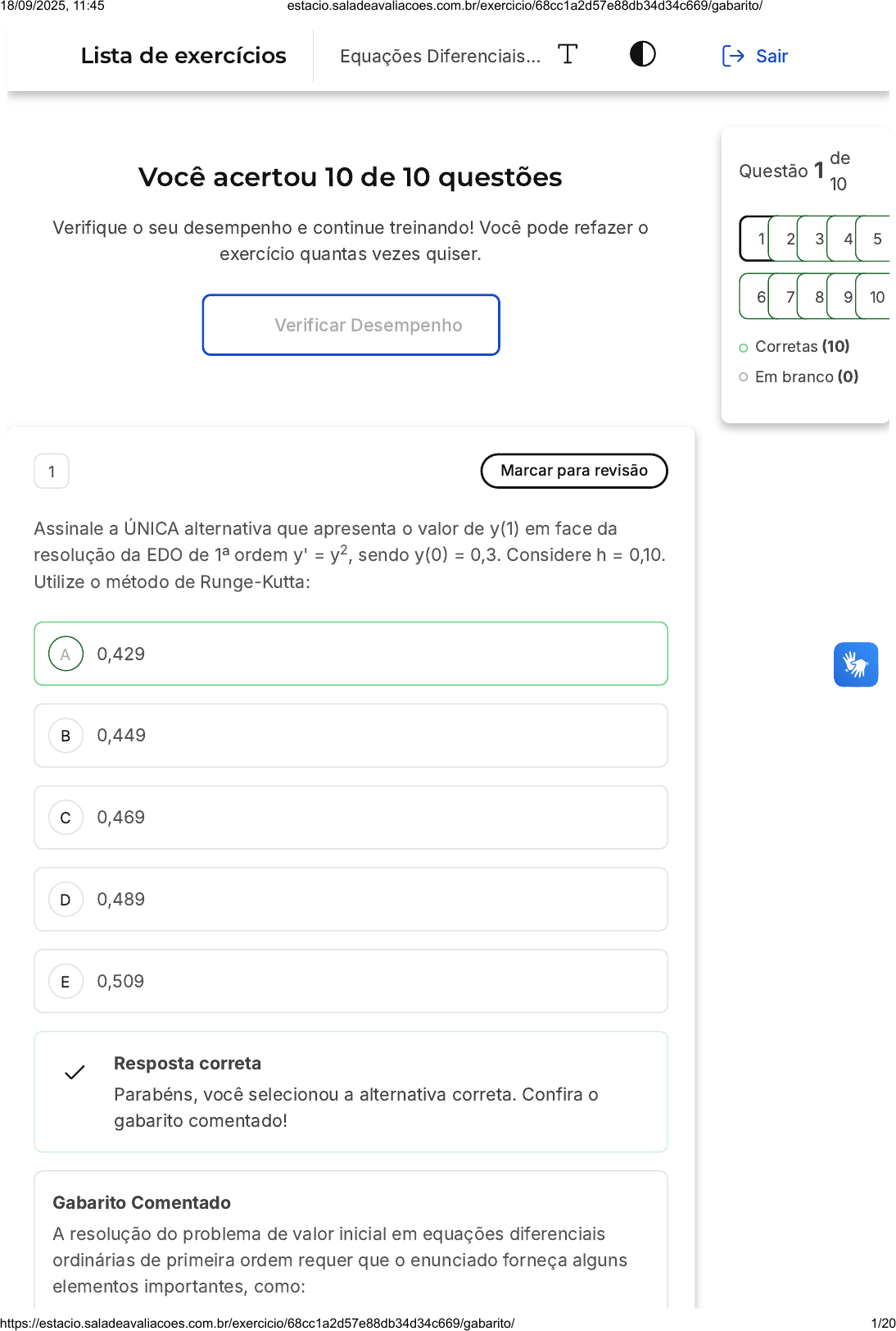 Você acertou 10 de 10 questões Verifique o seu desempenho e continue treinando! Você pode refazer o exercício quantas vezes quiser. Verificar Desempenho A B C D E 1 Marcar para revisão Assinale a ÚNICA alternativa que apresenta o valor de y(1) em face da resolução da EDO de 1ª ordem y' = y , sendo y(0) = 0,3. Considere h = 0,10. Utilize o método de Runge-Kutta: 2 0,429 0,449 0,469 0,489 0,509 Resposta correta Parabéns, você selecionou a alternativa correta. Confira o gabarito comentado! Gabarito Comentado A resolução do problema de valor inicial em equações diferenciais ordinárias de primeira ordem requer que o enunciado forneça alguns elementos importantes, como: Questão 1 de 10 Corretas (10) Em branco (0) 1 2 3 4 5 6 7 8 9 10 Lista de exercícios Equações Diferenciais… Sair 18/09/2025, 11:45 estacio.saladeavaliacoes.com.br/exercicio/68cc1a2d57e88db34d34c669/gabarito/ https://estacio.saladeavaliacoes.com.br/exercicio/68cc1a2d57e88db34d34c669/gabarito/ 1/20 - A equação diferencial ordinária de primeira ordem propriamente dita; - O ponto inicial; - O ponto final; - A quantidade de intervalos (ou o tamanho de cada intervalo); e - O valor da função no ponto inicial. Neste exemplo, temos que: - A equação diferencial ordinária de primeira ordem propriamente dita é y' = y ; - O ponto inicial é 0; - O ponto final é 1; - O tamanho de cada intervalo é 0,1; e - O valor da função no ponto inicial é 0,3. Isso posto, utilize o método indicado a seguir: Executando o código indicado, você obterá a resposta 0.428 . 2 2 Marcar para revisão Assinale a ÚNICA alternativa que apresenta o valor de y(3) em face da resolução da EDO de 1ª ordem y'= y , sendo y(0) = 0,3. Considere h = 0,30. Utilize o método de Runge-Kutta: 2 18/09/2025, 11:45 estacio.saladeavaliacoes.com.br/exercicio/68cc1a2d57e88db34d34c669/gabarito/ https://estacio.saladeavaliacoes.com.br/exercicio/68cc1a2d57e88db34d34c669/gabarito/ 2/20 A B C D E 2,985 2,885 2,785 2,685 2,585 Resposta correta Parabéns, você selecionou a alternativa correta. Confira o gabarito comentado! Gabarito Comentado A resolução do problema de valor inicial em equações diferenciais ordinárias de primeira ordem requer que o enunciado forneça alguns elementos importantes, como: - A equação diferencial ordinária de primeira ordem propriamente dita; - O ponto inicial; - O ponto final; - A quantidade de intervalos (ou o tamanho de cada intervalo); e - O valor da função no ponto inicial. Neste exemplo, temos que: - A equação diferencial ordinária de primeira ordem propriamente dita é y'= y ; - O ponto inicial é 0; - O ponto final é 3; - O tamanho de cada intervalo é 0,3; e - O valor da função no ponto inicial é 0,3. Isso posto, utilize o método indicado a seguir: 2 18/09/2025, 11:45 estacio.saladeavaliacoes.com.br/exercicio/68cc1a2d57e88db34d34c669/gabarito/ https://estacio.saladeavaliacoes.com.br/exercicio/68cc1a2d57e88db34d34c669/gabarito/ 3/20 A B C Executando o código indicado, você obterá a resposta 2.98. 3 Marcar para revisão Assinale a ÚNICA alternativa que apresenta o valor de y(0,4) em face da resolução da EDO de 1ª ordem y' = 2.cos(y), sendo y(0) = 3. Considere h = 0,1. Utilize o método de Euler: 2,288 2,388 2,488 18/09/2025, 11:45 estacio.saladeavaliacoes.com.br/exercicio/68cc1a2d57e88db34d34c669/gabarito/ https://estacio.saladeavaliacoes.com.br/exercicio/68cc1a2d57e88db34d34c669/gabarito/ 4/20 D E 2,588 2,688 Resposta correta Parabéns, você selecionou a alternativa correta. Confira o gabarito comentado! Gabarito Comentado Como vimos neste tema, a resolução do problema de valor inicial em equações diferenciais ordinárias de primeira ordem requer que o enunciado forneça alguns elementos importantes, como: - A equação diferencial ordinária de primeira ordem propriamente dita; O ponto inicial; O ponto final; A quantidade de intervalos (ou o tamanho de cada intervalo); e O valor da função no ponto inicial. Neste exemplo, temos que: - A equação diferencial ordinária de primeira ordem propriamente dita é y' = 2.cos(y); O ponto inicial é 0; O ponto final é 0,4; O tamanho de cada intervalo é 0,1; e O valor da função no ponto inicial é 3. Isso posto, utilize o método indicado a seguir: 18/09/2025, 11:45 estacio.saladeavaliacoes.com.br/exercicio/68cc1a2d57e88db34d34c669/gabarito/ https://estacio.saladeavaliacoes.com.br/exercicio/68cc1a2d57e88db34d34c669/gabarito/ 5/20 18/09/2025, 11:45 estacio.saladeavaliacoes.com.br/exercicio/68cc1a2d57e88db34d34c669/gabarito/ https://estacio.saladeavaliacoes.com.br/exercicio/68cc1a2d57e88db34d34c669/gabarito/ 6/20 A B C D E 4 Marcar para revisão Assinale a ÚNICA alternativa que apresenta o valor de y(1) em face da resolução da EDO de 1ª ordem y' = y , sendo y(0) = 0,2. Considere h = 0,10. Utilize o método de Runge-Kutta: 2 0,25 0,27 0,29 0,31 0,33 Resposta correta Parabéns, você selecionou a alternativa correta. Confira o gabarito comentado! Gabarito Comentado Aa resolução do problema de valor inicial em equações diferenciais ordinárias de primeira ordem requer que o enunciado forneça alguns elementos importantes, como: - A equação diferencial ordinária de primeira ordem propriamente dita; - O ponto inicial; - O ponto final; - A quantidade de intervalos (ou o tamanho de cada intervalo); e - O valor da função no ponto inicial. Neste exemplo, temos que: - A equação diferencial ordinária de primeira ordem propriamente dita é y' = y ; - O ponto inicial é 0; - O ponto final é 1; - O tamanho de cada intervalo é 0,1; e - O valor da função no ponto inicial é 0,2. Isso posto, utilize o método indicado a seguir: 2 18/09/2025, 11:45 estacio.saladeavaliacoes.com.br/exercicio/68cc1a2d57e88db34d34c669/gabarito/ https://estacio.saladeavaliacoes.com.br/exercicio/68cc1a2d57e88db34d34c669/gabarito/ 7/20 A B C Executando o código indicado, você obterá a resposta 0.249 5 Marcar para revisão Assinale a ÚNICA alternativa que 