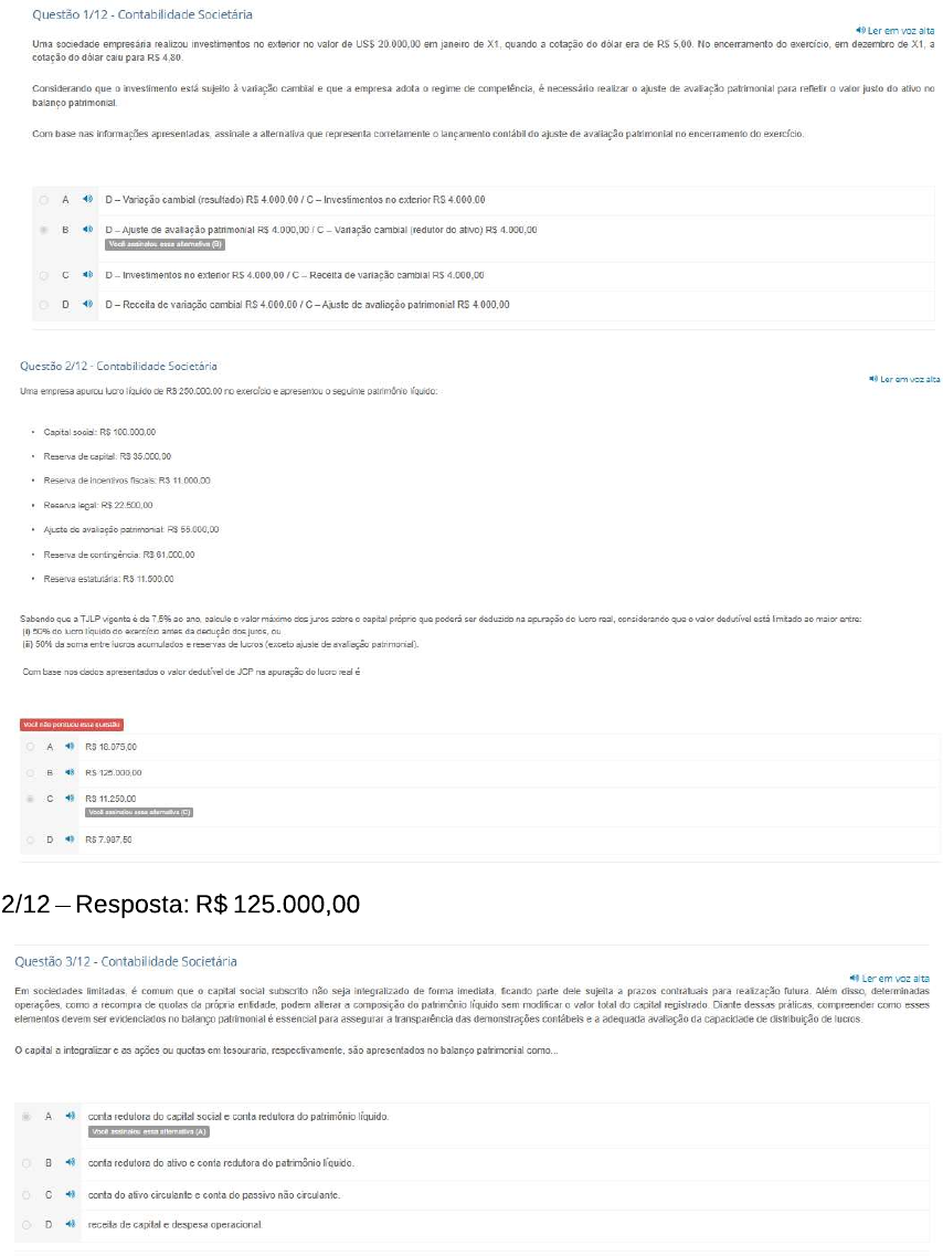 Questão 1/12 Contabilidade Societária Ler em voz alta Uma sociedade empresária realizou investimentos no exterior no valor de em janeiro de X1, quando a cotação do dólar era de No encerramento do exercício, em dezembro de X1, a cotação do dólar caiu para Considerando que 0 investimento está sujeito à variação cambial e que a empresa adota 0 regime de competência, é necessário realizar 0 ajuste de avaliação patrimonial para refletir 0 valor justo do ativo no balanço Com base nas informações assinale a alternativa que representa corretamente lançamento contábil do ajuste de avaliação patrimonial no encerramento do exercício. A D Variação cambial (resultado) - Investimentos no exterior R$ D Ajuste de avaliação patrimonial R$ Variação cambial (redutor do ativo) C D Investimentos no exterior R$ 4.000,00 Receita de variação cambial R$ 4.000,00 D D Receita de variação cambial Ajuste de avaliação patrimonial Questão 2/12 Contabilidade Societária Ler em voz alta Uma empresa apurou lucro líquido de no exercício e apresentou seguinte patrimônio líquido: Capital social: R$ 100.000,00 Reserva de capital: R$ 35.000,00 Reserva de incentivos R$ 11.000,00 Reserva legal: Ajuste de avaliação patrimonial: R$ Reserva de contingência: R$ 61,000,00 Reserva estatutária: R$ 11.500,00 Sabendo que TJLP vigente de 7.5% ao ano, calcule 0 valor máximo dos juros sobre capital próprio que poderá ser deduzido na apuração do lucro real, considerando que valor dedutivel está limitado ao maior entre: (i) 50% do lucro líquido do exercício antes da dedução dos juros, ou (ii) 50% da soma entre lucros acumulados e reservas de lucros (exceto ajuste de avaliação Com base nos dados apresentados valor dedutivel de JCP na apuração do lucro real é A 18.075,00 B C D 2/12 Resposta: Questão 3/12 - Contabilidade Societária Ler em voz alta Em sociedades limitadas, é comum que 0 capital social subscrito não seja integralizado de forma ficando parte dele sujeita a prazos contratuais para realização Além disso, determinadas operações, como a recompra de quotas da própria entidade, podem alterar a composição do patrimônio líquido sem modificar valor total do capital registrado. Diante dessas práticas, compreender como esses elementos devem ser evidenciados no balanço patrimonial é essencial para assegurar a transparência das demonstrações contábeis e a adequada avaliação da capacidade de distribuição de lucros. capital a integralizar e as ações ou quotas em respectivamente, são apresentados no balanço patrimonial A conta redutora do capital social e conta redutora do patrimônio líquido Você essa conta redutora do ativo e conta redutora do patrimônio líquido C conta do ativo circulante e conta do passivo não circulante D receita de capital e despesa operacionalQuestão 4/12 Contabilidade Societária Ler em voz alta A empresa Horizonte S.A., sediada no Brasil, obteve em 01/09/2024 um empréstimo de junto a uma instituição financeira com vencimento em 5 anos Os juros trimestrais de 6% são capitalizados ao A taxa de câmbio na data do empréstimo era de por dólar No encerramento do exercício social, em a taxa de câmbio de fechamento era de A taxa média do foi de Considerando que CPC 02 determina uso da taxa de fechamento para conversão de passivos monetários, e que juros devem ser reconhecidos no a empresa precisa registrar contabilmente os efeitos da variação cambial dos encargos financeiros registro contábil da variação cambial e dos juros em 31/12/2024 deve resultar em Você não pontuou A débito em despesa financeira de crédito em empréstimos de débito em despesa com variação cambial de e débito em juros passivos de R$ 39.600,00 C crédito em receita cambial de e débito em juros acumulados de Você alternativa débito em despesa com variação cambial de e crédito em empréstimos de R$ 4/12 Resposta: não localizado Questão 5/12 Contabilidade Societária Ler em voz alta Evento subsequente aquele que ocorre entre a data final do período contábil e a data em que é autorizada a emissão das Segundo 0 CPC esses eventos podem ser classificados em dois tipos: os que evidenciam condições existentes na data do balanço e que evidenciam condições surgidas após essa data Essa distinção essencial para definir se haverá ajustes nas demonstrações ou apenas divulgação em notas Por a falência de um cliente após encerramento do pode confirmar uma perda já existente, exigindo ajuste. Já a queda no valor de mercado de um investimento após balanço não exige pois decorre de condição nova Com base no CPC 24 assinale a alternativa que apresenta corretamente os dois tipos de eventos subsequentes previstos na norma Você pontuou essa A Os que evidenciam condição existente na data do balanço e que evidenciam condição surgida após essa Os que afetam diretamente 0 resultado do exercício e que afetam diretamente 0 patrimônio Os que são internos à estrutura da entidade e os que são externos ao ambiente Os que são operacionais da empresa no exercício e que são financeiros da empresa no exercício 5/12 Resposta: A) Os que evidenciam condição existente na data do balanço e os que evidenciam condição surgida após essa data Questão 6/12 Contabilidade Societária Ler em voz alta Uma sociedade empresária recebeu da administração pública um galpão industrial avaliado em 850.000,00 como incentivo para instalação de sua unidade fabril em uma região de baixo A transferência da propriedade está condicionada à permanência da empresa por sete anos no local e à geração de pelo menos 300 empregos A empresa optou por registrar a subvenção como passivo, conforme previsto no CPC Considerando que 0 galpão já está sob controle da entidade e que as condições ainda não foram cumpridas, a contabilização deve refletir reconhecimento do ativo e da obrigação associada à subvenção Assinale a alternativa