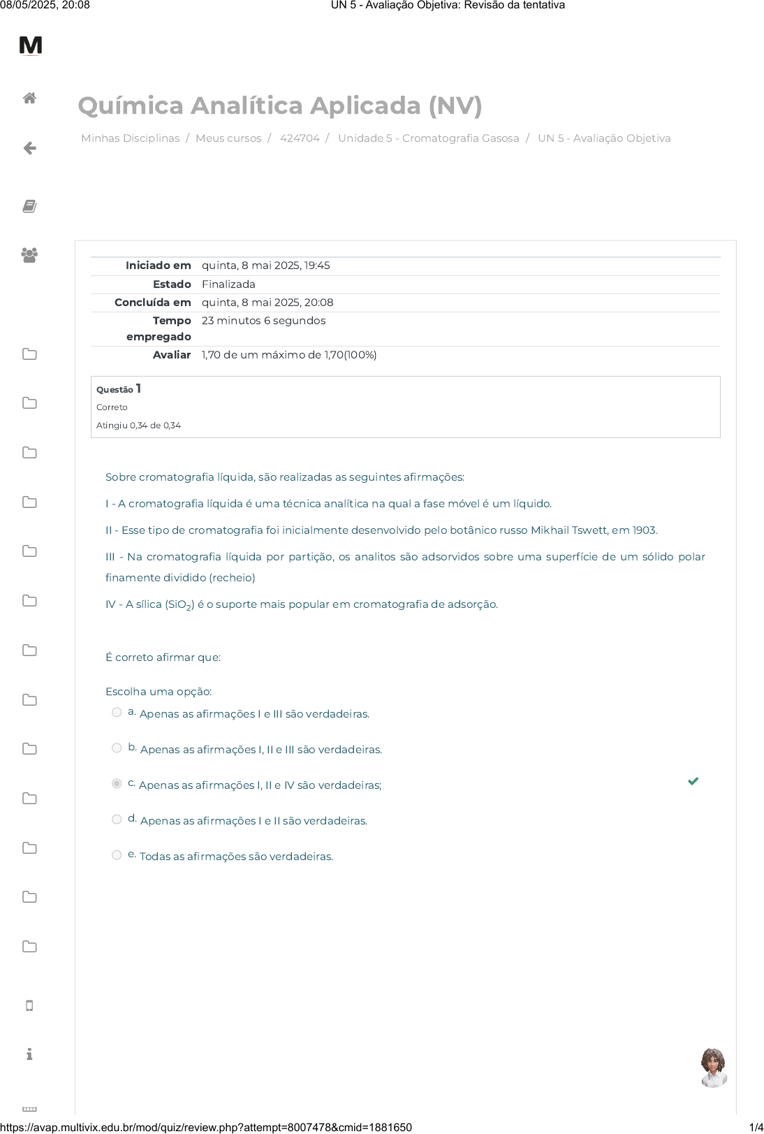 Minhas Disciplinas / Meus cursos / 424704 / Unidade 5 - Cromatografia Gasosa / UN 5 - Avaliação Objetiva Química Analítica Aplicada (NV) Iniciado em quinta, 8 mai 2025, 19:45 Estado Finalizada Concluída em quinta, 8 mai 2025, 20:08 Tempo empregado 23 minutos 6 segundos Avaliar 1,70 de um máximo de 1,70(100%) Questão 1 Correto Atingiu 0,34 de 0,34 Sobre cromatografia líquida, são realizadas as seguintes afirmações: I - A cromatografia líquida é uma técnica analítica na qual a fase móvel é um líquido. II - Esse tipo de cromatografia foi inicialmente desenvolvido pelo botânico russo Mikhail Tswett, em 1903. III - Na cromatografia líquida por partição, os analitos são adsorvidos sobre uma superfície de um sólido polar finamente dividido (recheio) IV - A sílica (SiO ) é o suporte mais popular em cromatografia de adsorção. É correto afirmar que: Escolha uma opção: a. Apenas as afirmações I e III são verdadeiras. b. Apenas as afirmações I, II e III são verdadeiras. c. Apenas as afirmações I, II e IV são verdadeiras; d. Apenas as afirmações I e II são verdadeiras. e. Todas as afirmações são verdadeiras. 2 08/05/2025, 20:08 UN 5 - Avaliação Objetiva: Revisão da tentativa https://avap.multivix.edu.br/mod/quiz/review.php?attempt=8007478&cmid=1881650 1/4 https://avap.multivix.edu.br/my/ https://avap.multivix.edu.br/course/view.php?id=33295 https://avap.multivix.edu.br/course/view.php?id=33295§ion=6 https://avap.multivix.edu.br/mod/quiz/view.php?id=1881650 https://avap.multivix.edu.br/my/ https://avap.multivix.edu.br/course/view.php?id=33295 https://avap.multivix.edu.br/user/index.php?id=33295 https://avap.multivix.edu.br/course/view.php?id=33295§ion=1 https://avap.multivix.edu.br/course/view.php?id=33295§ion=2 https://avap.multivix.edu.br/course/view.php?id=33295§ion=3 https://avap.multivix.edu.br/course/view.php?id=33295§ion=4 https://avap.multivix.edu.br/course/view.php?id=33295§ion=5 https://avap.multivix.edu.br/course/view.php?id=33295§ion=6 https://avap.multivix.edu.br/course/view.php?id=33295§ion=7 https://avap.multivix.edu.br/course/view.php?id=33295§ion=8 https://avap.multivix.edu.br/course/view.php?id=33295§ion=9 https://avap.multivix.edu.br/course/view.php?id=33295§ion=10 https://avap.multivix.edu.br/course/view.php?id=33295§ion=11 https://avap.multivix.edu.br/course/view.php?id=33295§ion=12 https://avap.multivix.edu.br/course/view.php?id=33295§ion=13 https://avap.multivix.edu.br/hooks/portal/ https://avap.multivix.edu.br/mod/page/view.php?id=1252%2F%22%20target%3D%22_blank https://avap.multivix.edu.br/calendar/view.php/ https://avap.multivix.edu.br/ https://avap.multivix.edu.br/ https://avap.multivix.edu.br/ https://avap.multivix.edu.br/ https://avap.multivix.edu.br/ Questão 2 Correto Atingiu 0,34 de 0,34 De acordo com os métodos de separação analítica, relacione a primeira coluna com a segunda de acordo com a base de método de cada um, respectivamente: I – Precipitação e Filtração II – Destilação III – Extração IV – Cromatografia A – Diferenças na velocidade de movimentação de solutos passando por uma fase estacionária. B – Diferenças na solubilidade dos compostos formados. C – Diferenças na volatilidade dos compostos. D - Diferenças na solubilidade em dois líquidos imiscíveis. Assinale a opção que corresponde à relação método de separação – base de método corretamente: Escolha uma opção: a. I – B, II – C, III – D e IV – A. b. I – A, II – C, III – D e IV – B. c. I – A, II – B, III – C e IV – D. d. I – C, II – D, III – A e IV – B. e. I – D, II – A, III – B e IV – C. 08/05/2025, 20:08 UN 5 - Avaliação Objetiva: Revisão da tentativa https://avap.multivix.edu.br/mod/quiz/review.php?attempt=8007478&cmid=1881650 2/4 https://avap.multivix.edu.br/my/ https://avap.multivix.edu.br/course/view.php?id=33295 https://avap.multivix.edu.br/user/index.php?id=33295 https://avap.multivix.edu.br/course/view.php?id=33295§ion=1 https://avap.multivix.edu.br/course/view.php?id=33295§ion=2 https://avap.multivix.edu.br/course/view.php?id=33295§ion=3 https://avap.multivix.edu.br/course/view.php?id=33295§ion=4 https://avap.multivix.edu.br/course/view.php?id=33295§ion=5 https://avap.multivix.edu.br/course/view.php?id=33295§ion=6 https://avap.multivix.edu.br/course/view.php?id=33295§ion=7 https://avap.multivix.edu.br/course/view.php?id=33295§ion=8 https://avap.multivix.edu.br/course/view.php?id=33295§ion=9 https://avap.multivix.edu.br/course/view.php?id=33295§ion=10 https://avap.multivix.edu.br/course/view.php?id=33295§ion=11 https://avap.multivix.edu.br/course/view.php?id=33295§ion=12 https://avap.multivix.edu.br/course/view.php?id=33295§ion=13 https://avap.multivix.edu.br/hooks/portal/ https://avap.multivix.edu.br/mod/page/view.php?id=1252%2F%22%20target%3D%22_blank https://avap.multivix.edu.br/calendar/view.php/ https://avap.multivix.edu.br/ https://avap.multivix.edu.br/ https://avap.multivix.edu.br/ https://avap.multivix.edu.br/ https://avap.multivix.edu.br/ Questão 3 Correto Atingiu 0,34 de 0,34 Questão 4 Correto Atingiu 0,34 de 0,34 Cromatografia é a técnica de separação (física/química) na qual os componentes a serem separados são distribuídos entre 2 fases: sendo uma fixa e de grande área superficial, denominada “fase estacionária”, e outra, denominada fase móvel, um fluido que percola através da fase estacionária. Em qualquer tipo de cromatografia, a escolha da fase estacionária é fundamental para uma análise adequada. Para a cromatografia líquida de alta eficiência (CLAE), existem diversas substâncias que podem ser utilizadas como fase móvel. Com relação a CLAE, assinale a opção correta: Escolha uma opção: a. A fase estacionária é um líquido em estado supercrítico, o que facilita a separação das substâncias em análise. b. A fase móvel líquida demanda uma fase estacionária também líquida para favo