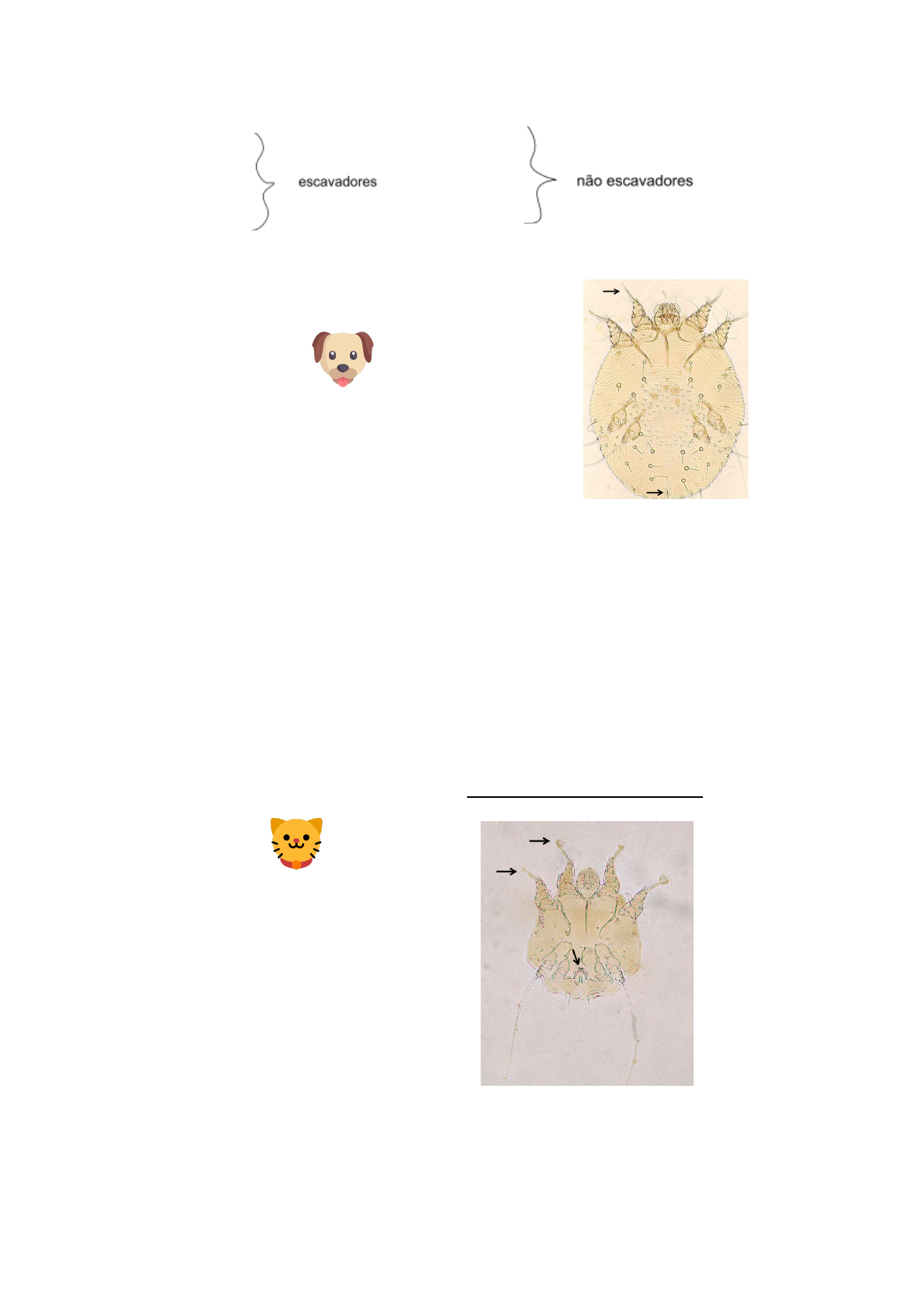 ÁCAROS sarcoptidae psoroptidae knemidocoptidae Sarcoptes scabiei – gnatossoma cônico – idiossoma grande, volumoso e arredondado – várias escamas triangulares pelo corpo – ventosas nas extremidades - fêmeas: nas patas I e II - machos: patas I, II e IV – ânus terminal Ciclo: Escava a pele do animal para se alimentar → deposita ovos nas galerias → larvas → ninfas → adultos (diferenciação em macho e fêmea) → descem do solo para copular → sobe no animal IMV – Escabiose/sarna sarcóptica – zoonose – causador de prurido primário ● Características da doença: coceira constante, áreas inflamadas, pus, alopecia, magreza, mal-estar. – escavação do ácaro = porta de entrada para infecção bacteriana secundária (IBS) Notoedres spp. **cati = gatos – corpo globoso (semelhante ao sarcoptes) – ciclo = S.scabiei – ânus dorsal – ventosas = sarcoptes IMV – Sarna notoédrica – principal ácaro relacionado a felinos – coceira que leva ao aparecimento de pus – dermatite e formação de crostas – altamente contagiosa – afeta principalmente cabeça e orelhas – visualmente não se diferencia da esporotricose – IBS Knemidocoptes – + comum em aves – corpo globoso (maior quando comparado aos outros) – várias estrias pelo corpo – gnatossoma mais largo e robusto – patas menores – machos: ventosas e cerdas longas nas patas – fêmeas ovovivíparas – ânus terminal – não escavam galerias Ciclo: - Eliminam larvas (ovos se desenvolvem dentro do ácaro) - patas são o principal local de deposição de larvas, mas o bico também pode ser afetado - 17 – 21 dias fêmea adulta → deposita larva nas patas das aves → ninfas → adultos → superfície para cópula IMV: – Sarna da para das aves – dificuldade para andar – descamação – mutilação Principais gêneros de IMV: Psoroptes, Otodectes, Chorioptes Psoroptes ovis: ovinos, caprinos, bovinos e coelhos ovis var. canis: cães de pelos longos equi: equinos – corpo ovóide – gnatossoma triangular, mais longo – patas grossas e longas – machos: 1 par de patas bem menor que as outras; ventosas nas patas I, II e III + 2 copulatórias ao lado do ânus – fêmeas: ventosas nas patas I, II e IV – ânus terminal IMV – prurido intenso (🐂🐐🐑🐎) – prejuízo da qualidade do couro (🐐🐑) – crostas e prurido na orelha (🐰) Otodectes cynotis – corpo + globoso (ovóide) – gnatossoma de cone (- pontudo) – macho: 1 par de patas menor, ❌ tubérculos abdominais, ventosas nas patas I, II, III e IV – fêmeas: ventosas nas patas I e II, 4° par de patas muito pequeno IMV – Sarna auricular de cães e gatos → causa otite – ❌ galerias - se alimentam de líquidos teciduais – IBS – cerumen + escuro e com ↑ produção - odor + forte – otohematoma: inflamação que ocorre e pelo animal coçar com muita frequência, causa o rompimento de um vaso sanguíneo ORDEM TROMBIDIFORMES Demodex spp. **canis: não infecta humanos – bem pequenos – corpo vermiforme – patas curtas – comum na microbiota → está presente no animal, mas o problema (manifestação da doença) começa quando há uma queda de imunidade que facilita a proliferação dos ácaros. CICLO: cadela (Demodex naturalmente presente no seu corpo) → parto → baixa imunidade → ↑n° de Demodex → passa para o filhote IMV – Sarna demodécica/sarna negra/demodicose – parasitam bulbo do pelo – ❌ transmissão horizontal (animal - animal) – ❌ prurido primário (mas pode ocorrer em decorrência de IBS) – alopecia – maioria dos animais é assintomática – afeta mais animais filhotes ou com baixa imunidade PULGAS → ordem Siphonaptera, família Pulicidae – holometábolos (metamorfose completa) – ❌asas – corpo achatado – aparelho bucal sugador/picador – cabeça, tórax e abdômen – patas alongadas – cerdas voltadas para trás CICLO (21 dias): ovos (solo ou já em um animal) → larva (se alimenta de matéria orgânica) → L1, L2, L3 → pupa → adulto Ctenocephalides spp. felis felis canis > canis: cabeça + achatada; primeiras cerdas menores; mais alta que a C.felis. > felis: cabeça + alongada; cerdas todas do mesmo tamanho IMV: – altas infestações – intenso prurido – controle difícil – reação alérgica à saliva (DAPP) – vetor: Dipylidium caninum (tênia do cão), dirofilaria (↓ comum), dipetalonema, Rickettsia spp. Pulex irritans: – ❌cerdas (somente uma anterior ao olho e uma occipital) Xenopsylla cheopis – roedores domésticos e silvestres – ❌ ctenídeos – cerdas dispostas em V no abdômen IMV – com fome, pica vorazmente vários hospedeiros Tunga penetrans