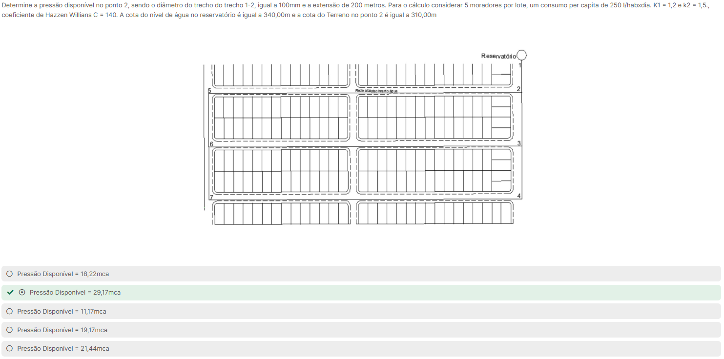 Determine a pressão disponível no ponto 2, sendo 0 diâmetro do trecho do trecho 1-2, igual a 100mm e a extensão de 200 metros. Para 0 cálculo considerar 5 moradores por lote, um consumo per capita de 250 I/habxdia. K1 = 1,2 e k2 = 1,5., coeficiente de Hazzen Willians C = 140. A cota do de água no reservatório é igual a 340,00m e a cota do Terreno no ponto 2 é igual a 310,00m Reservatório 1 5 Rade 2 6 3 7 4 Pressão Disponível = 18,22mca Pressão Disponível = 29,17mca Pressão Disponível = 11,17mca Pressão Disponível = 19,17mca Pressão Disponível = 21,44mca