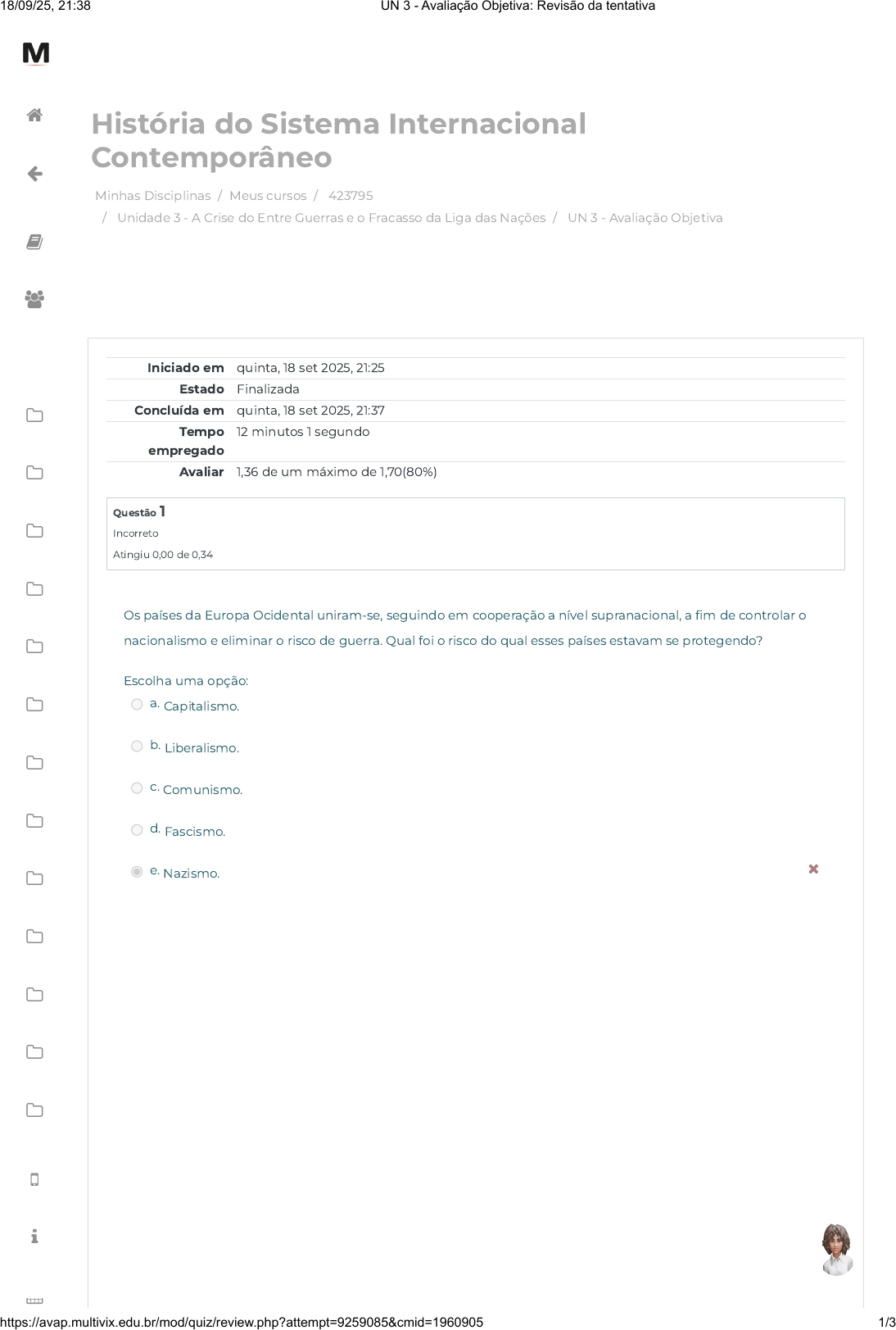 Minhas Disciplinas / Meus cursos / 423795 / Unidade 3 - A Crise do Entre Guerras e o Fracasso da Liga das Nações / UN 3 - Avaliação Objetiva História do Sistema Internacional Contemporâneo Iniciado em quinta, 18 set 2025, 21:25 Estado Finalizada Concluída em quinta, 18 set 2025, 21:37 Tempo empregado 12 minutos 1 segundo Avaliar 1,36 de um máximo de 1,70(80%) Questão 1 Incorreto Atingiu 0,00 de 0,34 Os países da Europa Ocidental uniram-se, seguindo em cooperação a nível supranacional, a fim de controlar o nacionalismo e eliminar o risco de guerra. Qual foi o risco do qual esses países estavam se protegendo? Escolha uma opção: a. Capitalismo. b. Liberalismo. c. Comunismo. d. Fascismo. e. Nazismo. 18/09/25, 21:38 UN 3 - Avaliação Objetiva: Revisão da tentativa https://avap.multivix.edu.br/mod/quiz/review.php?attempt=9259085&cmid=1960905 1/3 https://avap.multivix.edu.br/my/ https://avap.multivix.edu.br/course/view.php?id=36299 https://avap.multivix.edu.br/course/view.php?id=36299§ion=4 https://avap.multivix.edu.br/mod/quiz/view.php?id=1960905 https://avap.multivix.edu.br/my/ https://avap.multivix.edu.br/course/view.php?id=36299 https://avap.multivix.edu.br/user/index.php?id=36299 https://avap.multivix.edu.br/course/view.php?id=36299§ion=1 https://avap.multivix.edu.br/course/view.php?id=36299§ion=2 https://avap.multivix.edu.br/course/view.php?id=36299§ion=3 https://avap.multivix.edu.br/course/view.php?id=36299§ion=4 https://avap.multivix.edu.br/course/view.php?id=36299§ion=5 https://avap.multivix.edu.br/course/view.php?id=36299§ion=6 https://avap.multivix.edu.br/course/view.php?id=36299§ion=7 https://avap.multivix.edu.br/course/view.php?id=36299§ion=8 https://avap.multivix.edu.br/course/view.php?id=36299§ion=9 https://avap.multivix.edu.br/course/view.php?id=36299§ion=10 https://avap.multivix.edu.br/course/view.php?id=36299§ion=11 https://avap.multivix.edu.br/course/view.php?id=36299§ion=12 https://avap.multivix.edu.br/course/view.php?id=36299§ion=13 https://avap.multivix.edu.br/hooks/portal/ https://avap.multivix.edu.br/mod/page/view.php?id=1252%2F%22%20target%3D%22_blank https://avap.multivix.edu.br/calendar/view.php/ https://avap.multivix.edu.br/ https://avap.multivix.edu.br/ https://avap.multivix.edu.br/ https://avap.multivix.edu.br/ Questão 2 Correto Atingiu 0,34 de 0,34 Questão 3 Correto Atingiu 0,34 de 0,34 Uma jogada dos Estados Unidos, como ajuda financeira, visou a reconstrução da Europa após o final da Segunda Guerra Mundial. Um dos objetivos dessa ajuda foi garantir o apoio dos países da Europa Ocidental para si, coibindo o avanço da União Soviética sobre o Ocidente. Qual alternativa descreve a ajuda financeira americana? Escolha uma opção: a. Fundo Monetário Internacional. b. Acordo de Bretton Woods. c. Organização das Nações Unidas. d. Banco Mundial. e. Plano Marshall. Segundo Joaquín Herrera Flores, professor e escritor falecido da “Teoria Crítica dos Direitos Humanos”, o mundo pós-guerra foi exposto à rapina das potências na divisão de Estados. A História nos conta que alguns países europeus tiveram suas fronteiras retraçadas, sendo que povos foram separados e isso implicou em conflitos nas nacionalidades e nas cidadanias, causando caos nas relações internacionais. Nas alternativas a seguir, qual descreve países que tiveram suas fronteiras refeitas? Escolha uma opção: a. Itália, Bulgária, Romênia, Hungria, Alemanha, entre outros. b. Itália, Bulgária, França, Romênia, Alemanha, entre outros. c. Islândia, França, Romênia, Hungria, Espanha, entre outros. d. Inglaterra, Hungria, Espanha, Alemanha, Bulgária, entre outros. e. Inglaterra, França, Alemanha, Portugal, Espanha, entre outros. 18/09/25, 21:38 UN 3 - Avaliação Objetiva: Revisão da tentativa https://avap.multivix.edu.br/mod/quiz/review.php?attempt=9259085&cmid=1960905 2/3 https://avap.multivix.edu.br/my/ https://avap.multivix.edu.br/course/view.php?id=36299 https://avap.multivix.edu.br/user/index.php?id=36299 https://avap.multivix.edu.br/course/view.php?id=36299§ion=1 https://avap.multivix.edu.br/course/view.php?id=36299§ion=2 https://avap.multivix.edu.br/course/view.php?id=36299§ion=3 https://avap.multivix.edu.br/course/view.php?id=36299§ion=4 https://avap.multivix.edu.br/course/view.php?id=36299§ion=5 https://avap.multivix.edu.br/course/view.php?id=36299§ion=6 https://avap.multivix.edu.br/course/view.php?id=36299§ion=7 https://avap.multivix.edu.br/course/view.php?id=36299§ion=8 https://avap.multivix.edu.br/course/view.php?id=36299§ion=9 https://avap.multivix.edu.br/course/view.php?id=36299§ion=10 https://avap.multivix.edu.br/course/view.php?id=36299§ion=11 https://avap.multivix.edu.br/course/view.php?id=36299§ion=12 https://avap.multivix.edu.br/course/view.php?id=36299§ion=13 https://avap.multivix.edu.br/hooks/portal/ https://avap.multivix.edu.br/mod/page/view.php?id=1252%2F%22%20target%3D%22_blank https://avap.multivix.edu.br/calendar/view.php/ https://avap.multivix.edu.br/ https://avap.multivix.edu.br/ https://avap.multivix.edu.br/ https://avap.multivix.edu.br/ Questão 4 Correto Atingiu 0,34 de 0,34 Questão 5 Correto Atingiu 0,34 de 0,34 A Segunda Guerra Mundial findou, e no período após o ano de 1945, a Europa encontrava-se em ruínas, como também dividida entre duas potências mundiais antagônicas. Nas alternativas a seguir, qual representa esses Estados? Escolha uma opção: a. França e Japão. b. China e Inglaterra. c. China e Japão. d. Estados Unidos e União Soviética. e. Alemanha Oriental e Alemanha Ocidental. Após a Segunda Guerra Mundial, os acordos de Bretton Woods foram elaborados visando, por exemplo, negociações para as maiores potências mundiais da época, a saber, os Estados Unidos, o Canadá, a Europa Ocidental, entre outros. Esse foi um dos fundamentos desses acordos. Com base na afirmação, qual alternativa diz respeito aos acordos de Bretton Woods? Escolha uma opção: a. A Organização das Na