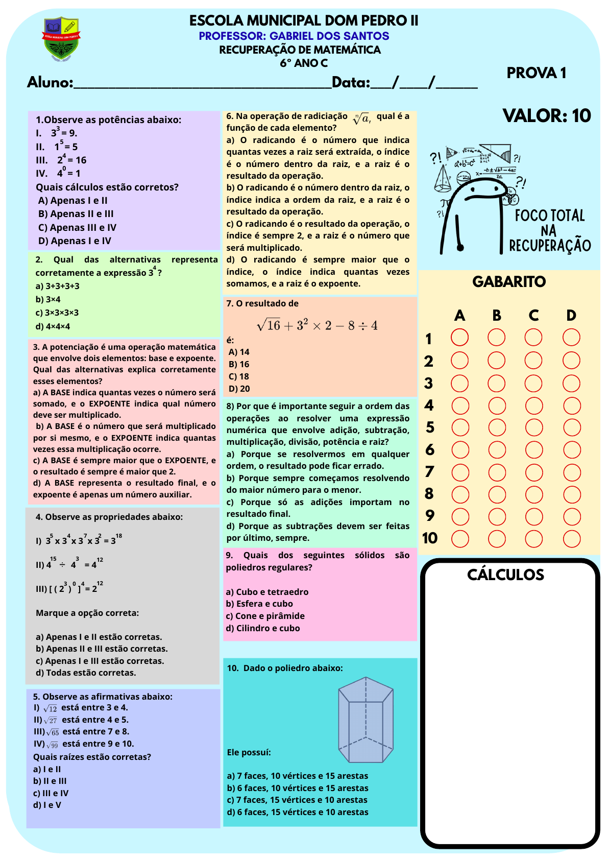 6. Na operação de radiciação qual é a função de cada elemento? a) O radicando é o número que indica quantas vezes a raiz será extraída, o índice é o número dentro da raiz, e a raiz é o resultado da operação. b) O radicando é o número dentro da raiz, o índice indica a ordem da raiz, e a raiz é o resultado da operação. c) O radicando é o resultado da operação, o índice é sempre 2, e a raiz é o número que será multiplicado. d) O radicando é sempre maior que o índice, o índice indica quantas vezes somamos, e a raiz é o expoente. 4. Observe as propriedades abaixo: I) 3 x 3 x 3 x 3 = 3 II) 4 4 = 4 III) [ ( 2 ) ] = 2 Marque a opção correta: a) Apenas I e II estão corretas. b) Apenas II e III estão corretas. c) Apenas I e III estão corretas. d) Todas estão corretas. 7. O resultado de é: A) 14 B) 16 C) 18 D) 20 9. Quais dos seguintes sólidos são poliedros regulares? a) Cubo e tetraedro b) Esfera e cubo c) Cone e pirâmide d) Cilindro e cubo 10. Dado o poliedro abaixo: Ele possuí: a) 7 faces, 10 vértices e 15 arestas b) 6 faces, 10 vértices e 15 arestas c) 7 faces, 15 vértices e 10 arestas d) 6 faces, 15 vértices e 10 arestas 2. Qual das alternativas representa corretamente a expressão 3 ? a) 3+3+3+3 b) 3×4 c) 3×3×3×3 d) 4×4×4 ESCOLA MUNICIPAL DOM PEDRO II VALOR: 10 PROFESSOR: GABRIEL DOS SANTOS Aluno:_____________________________________Data:___/____/______ RECUPERAÇÃO DE MATEMÁTICA 6º ANO C GABARITO 1 A B C D 2 3 4 5 6 7 8 9 10 CÁLCULOS PROVA 1 1.Observe as potências abaixo: I. 3 = 9. II. 1 = 5 III. 2 = 16 IV. 4 = 1 Quais cálculos estão corretos? A) Apenas I e II B) Apenas II e III C) Apenas III e IV D) Apenas I e IV 3 5 4 0 3. A potenciação é uma operação matemática que envolve dois elementos: base e expoente. Qual das alternativas explica corretamente esses elementos? a) A BASE indica quantas vezes o número será somado, e o EXPOENTE indica qual número deve ser multiplicado. b) A BASE é o número que será multiplicado por si mesmo, e o EXPOENTE indica quantas vezes essa multiplicação ocorre. c) A BASE é sempre maior que o EXPOENTE, e o resultado é sempre é maior que 2. d) A BASE representa o resultado final, e o expoente é apenas um número auxiliar. 5 4 7 2 18 15 3 12 3 0 4 12 5. Observe as afirmativas abaixo: Quais raízes estão corretas? a) I e II b) II e III c) III e IV d) I e V FOCO TOTAL NA RECUPERAÇÃO 4 I) está entre 3 e 4. II) está entre 4 e 5. III) está entre 7 e 8. IV) está entre 9 e 10. 8) Por que é importante seguir a ordem das operações ao resolver uma expressão numérica que envolve adição, subtração, multiplicação, divisão, potência e raiz? a) Porque se resolvermos em qualquer ordem, o resultado pode ficar errado. b) Porque sempre começamos resolvendo do maior número para o menor. c) Porque só as adições importam no resultado final. d) Porque as subtrações devem ser feitas por último, sempre.