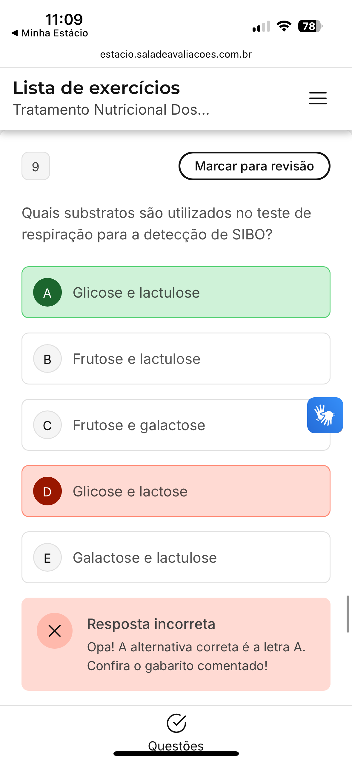 11:09 78 Minha Estácio estacio.saladeavaliacoes.com.br Lista de exercícios Tratamento Nutricional Dos... 9 Marcar para revisão Quais substratos são utilizados no teste de respiração para a detecção de SIBO? A Glicose e lactulose Frutose e lactulose Frutose e galactose D Glicose e lactose E Galactose e lactulose X Resposta incorreta Opa! A alternativa correta é a letra A. Confira gabarito comentado! Questões