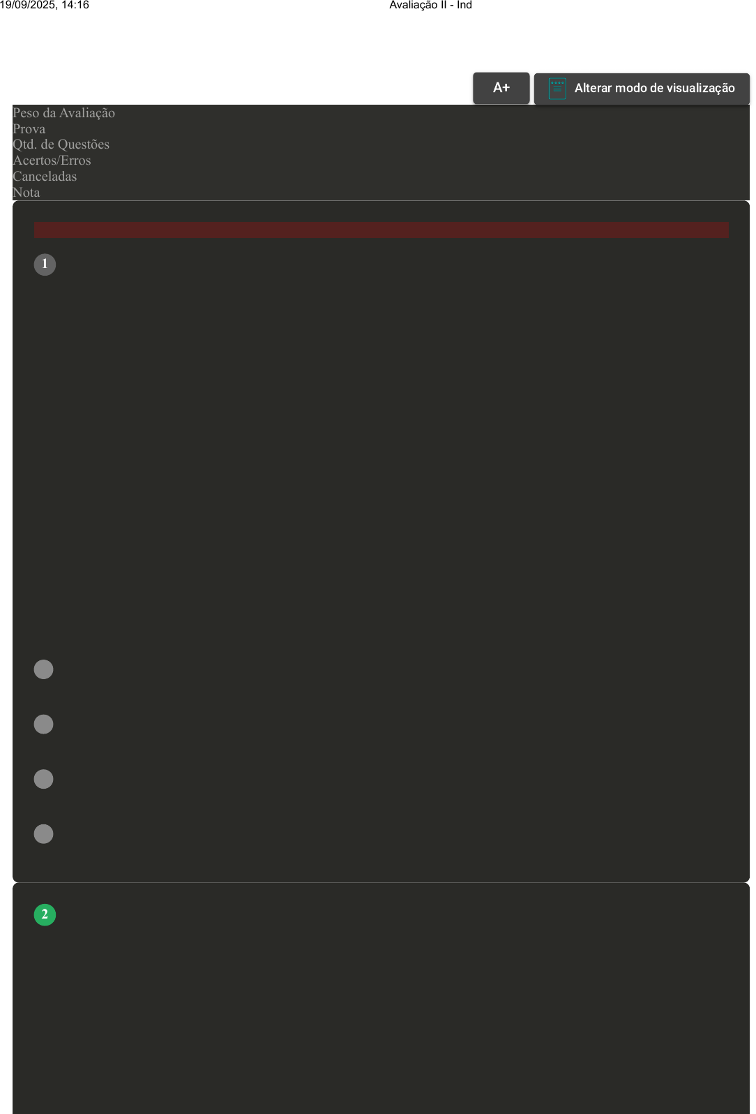 Prova Impressa GABARITO | Avaliação II - Individual (Cod.:986850) Peso da Avaliação 2,00 Prova 90135952 Qtd. de Questões 10 Acertos/Erros 8/0 Canceladas 2 Nota 10,00 Atenção: Esta questão foi cancelada, porém a pontuação foi considerada. O principal componente do sistema nervoso é o neurônio, um tipo de célula altamente especializada em receber, conduzir e transmitir mensagens a outras células. A região entre dois neurônios é chamada de sinapse: as substâncias químicas que transmitem as mensagens de um neurônio para o outro são chamadas de mediadores, mensageiros químicos ou neurotransmissores. Os cientistas descobriram que em muitas doenças do sistema nervoso a quantidade desses neurotransmissores pode estar alterada. Sobre o exposto, analise as sentenças a seguir: I- Quando o neurônio é devidamente estimulado, ocorre uma onda de alterações elétricas em sua membrana, sempre dos dendritos em direção ao axônio. II- As sinapses nervosas ocorrem, em geral, entre o axônio de um neurônio e o dendrito de outro, mas também podem haver sinapses entre um axônio e um corpo celular, entre dois axônios, ou entre um axônio e uma célula muscular, neste caso, chamada sinapse neuromuscular. III- Dentre outras substâncias que atuam como neurotransmissores, podemos citar a dopamina. Assinale a alternativa CORRETA: A Somente a sentença III está correta. B As sentenças I, II e III estão corretas. C Somente a sentença I está correta. D Somente a sentença II está correta. [Laboratório Virtual - Observação do esqueleto axial] O crânio humano consiste de 22 ossos individuais, que são em sua maioria conectados uns aos outros por articulações ossificadas, as chamadas suturas. Ele é subdividido nos ossos faciais (esqueleto facial) e na calota craniana (esqueleto cerebral). O esqueleto facial protege e suporta as estruturas faciais subjacentes, envolvendo os globos oculares; enquanto a calota craniana abriga o cérebro, além das estruturas dos ouvidos médio e interno (orelhas média e interna). VOLTAR A+ Alterar modo de visualização 1 2 19/09/2025, 14:16 Avaliação II - Individual about:blank 1/7 Analise a peça apresentada e assinale a alternativa CORRETA que corresponde à nomenclatura das estruturas indicadas com os números 1, 5, 7 e 13: Fonte: HANSEN, J. T. Netter anatomia para colorir. 2. ed. Rio de Janeiro: Campus Elsevier (Medicina), 2015. 19/09/2025, 14:16 Avaliação II - Individual about:blank 2/7 A 1 = Temporal; 5 = Vômer; 7 = Lacrimal; 13 = Maxila. B 1 = Frontal; 5 = Occipital; 7 = Nasal; 13 = Mandíbula. C 1 = Esfenoide; 5 = Temporal; 7 = Zigomático; 13 = Vômer. D 1 = Parietais; 5 = Occipital; 7 = Zigomático; 13 = Palatino. O coração contém câmaras cardíacas. Essas câmaras estão dividida por camadas teciduais, que podem ser consideradas como paredes. Sobre as câmaras cardíacas, classifique V para as sentenças verdadeiras e F para as falsas: ( ) Duas câmaras superiores (átrio direito e ventrículo esquerdo), sendo separados pelo septo interatrial; duas câmaras inferiores (ventrículo direito e átrio esquerdo), sendo separados septo interventricular. ( ) Câmaras superiores (ventrículo direito e ventrículo esquerdo), sendo separados pelo septo interatrial; duas câmaras inferiores (átrio direito e átrio esquerdo), sendo separados septo interventricular. ( ) Duas câmaras superiores (átrio direito e esquerdo), sendo separados pelo septo interatrial; duas câmaras inferiores (ventrículo direito e esquerdo), sendo separados septo interventricular. ( ) Duas câmaras superiores (átrio direito e esquerdo), sendo separados pelo septo interventricular, duas câmaras inferiores (ventrículo direito e esquerdo), sendo separados septo interatrial. Assinale a alternativa que apresenta a sequência CORRETA: A V - F - F - V. B F - F - V - F. C F - V - V - F. D V - V - V - F. As valvas atrioventriculares direita e esquerda, como seu nome sugere, estão localizadas entre os átrios e os ventrículos. Enquanto os átrios e os ventrículos estão relaxados (em diástole), essas valvas permanecem abertas e o sangue contido nos átrios flui em direção aos ventrículos. Quando os ventrículos se contraem (sístole ventricular), essas valvas se fecham e impedem que o sangue retorne aos átrios, direcionando, assim, o sangue contido nos ventrículos para o tronco pulmonar e para a aorta. Sobre os temos que as válvulas atrioventriculares direita e esquerda são conhecidas, analise as sentenças a seguir: 3 4 19/09/2025, 14:16 Avaliação II - Individual about:blank 3/7 I- A valva atrioventricular direita é também chamada de valva tricúspide, pois apresenta três válvulas ou cúspides. II- A valva atrioventricular direita é também chamada de mitral ou bicúspide, pois apresenta três válvulas ou cúspides, enquanto a valva atrioventricular esquerda é chamada de valva tricúspide, por apresentar apenas duas válvulas. III- A valva atrioventricular direita é também chamada de mitral ou bicúspide, por apresentar apenas duas válvulas, enquanto a valva atrioventricular esquerda é chamada de valva tricúspide, pois apresenta três válvulas ou cúspides. IV- A valva atrioventricular esquerda é chamada de mitral ou bicúspide por apresentar apenas duas válvulas. Assinale a alternativa CORRETA: A Somente a sentença III está correta. B Somente a sentença II está correta. C As sentenças I e IV estão corretas. D Somente a sentença I está correta. Atenção: Esta questão foi cancelada, porém a pontuação foi considerada. O espaço ocupado pelas trabéculas aracnoideas é denominado espaço subaracnoideo e está preenchido pelo líquido cerebrospinal. A aracnoide forma uma série de projeções em direção aos seios venosos da dura-máter, as granulações aracnoideas, as quais têm como função reabsorver o líquido cerebrospinal. Sobre o exposto, avalie as asserções a seguir e a relação proposta entre elas: I- O líqui