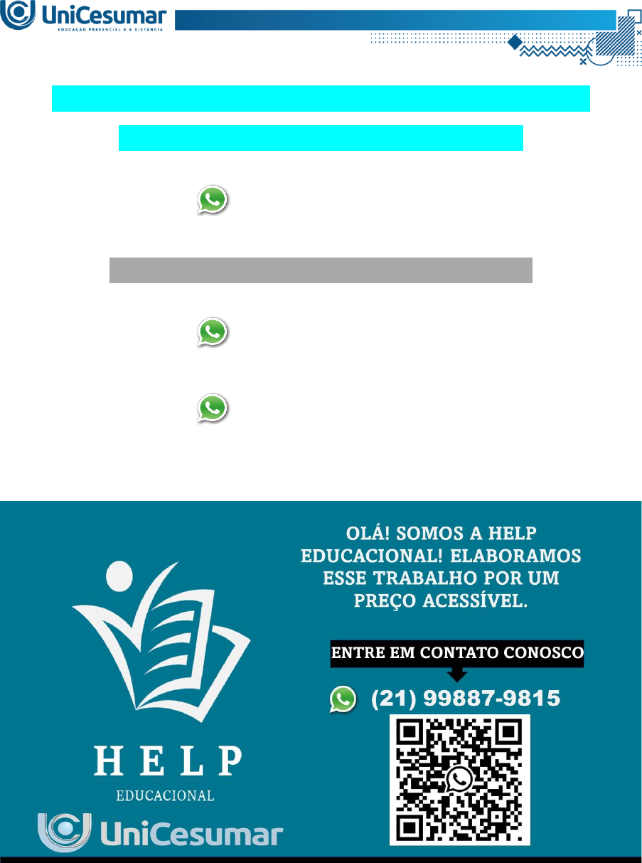 PORTFÓLIO – PRÁTICA PEDAGÓGICA: FRUIÇÃO ARTÍSTICA E A REFLEXÃO - 53_2025 (21) 99887-9815 ASSESSORIA NOS SEUS TRABALHOS (21) 99887-9815 (21) 99887-9815 Segundo Praxedes (2005, p. 110) “[...] todo ser humano tem preconceitos, mas cada um é responsável por aquele que cultiva”. Por isso, devemos avaliá-los e criticá-los. Os atos pre conceituosos quanto às raças e etnias fazem com que o indivíduo tenha atitudes que opri- mem e excluem o outro, categorizando-os como inferiores ou incapazes, por exemplo. Es- ses preconceitos étnico-raciais são prejudiciais também às relações escolares e na comuni- dade, e podem fazer com que um grupo tenha desconfiança do outro apenas por sua apa- rência ou hábitos culturais, sem, ao menos, conhecê-lo. Ao propor práticas para fruição/re- flexão sobre o outro, podemos repensar nossas práticas e agir para a cidadania e justiça so- cial. A partir desse contexto da atividade para práticas pedagógicas cidadãs, elabore um ro- teiro de atividade para a fruição/reflexão/criação a partir das obras de Rosana Paulino analisadas por Ellen Alves (2020). ALVES, Ellen Pyles Pereira. Saberes da sociologia e das artes visuais: conexões dialógicas numa intervenção pedagógica. Londrina, 2020. 150 f. Orientador: Ângela Maria De Sousa Lima. Dissertação (Mestrado Profissional em Ciências Sociais) – Universidade Estadual de Londrina, Centro de Letras e Ciências Humanas, Programa de Pós-graduação em Sociolo- gia, 2020. O roteiro deve conter as respostas a essas questões: 1) Descreva os materiais envolvidos para a fruição/reflexão/criação, 2) Escreva em um parágrafo argumentativo a sua proposta para dialogar com as obras de Rosana Paulino, 3) Justifique o porquê essa obra é importante para fruição e ampliação de significados por parte dos alunos(as), 4) Detalhe os procedimentos para a releitura da obra O texto de referência está disponível no MATERIAL DA DISCIPLINA e também no link https://repositorio.uel.br/items/79ef1ea5-1356-44be-8f95-4c0418e64f23 5) Para encaminhar sua resposta, utilize o FORMULÁRIO PADRÃO PARA RESPONDER A ATIVIDADE MAPA DE PRÁTICA PEDAGÓGICA: FRUIÇÃO ARTÍSTICA E A REFLEXÃO, disponível no MATERIAL DA DISCIPLINA. Lembre-se de anexar o arquivo correto em PDF, e, depois, clique em "finalizar questionário" Bons estudos! OLÁ! SOMOS A HELP EDUCACIONAL! ELABORAMOS ESSE TRABALHO POR UM PREÇO ACESSÍVEL. ENTRE EM CONTATO CONOSCO (21) 99887-9815