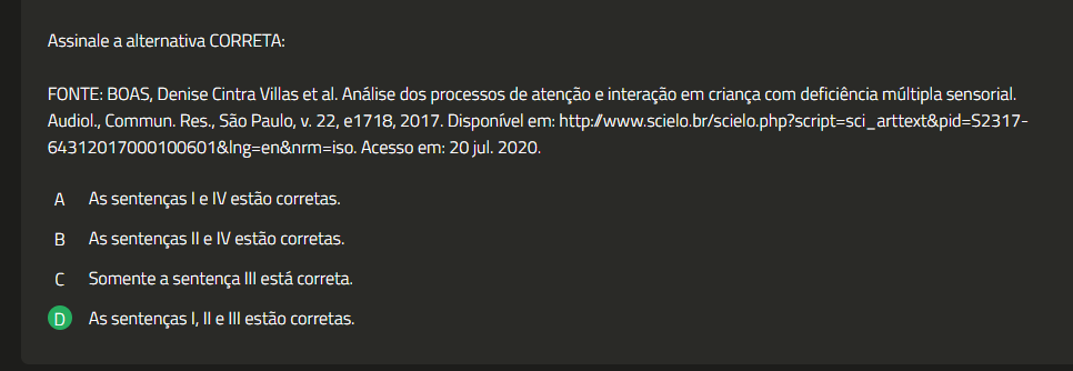Assinale a alternativa CORRETA: FONTE: BOAS, Denise Cintra Villas et al. Análise dos processos de atenção e interação em criança com deficiência múltipla sensorial. Audiol., Commun. Res., São Paulo, V. 22, 2017. Disponível em: 64312017000100601&lng=en&nrm=iso. Acesso em: 20 jul. 2020. A As sentenças e IV estão corretas. As sentenças II e IV estão corretas. Somente a sentença III está correta. D As sentenças I, II e III estão corretas.