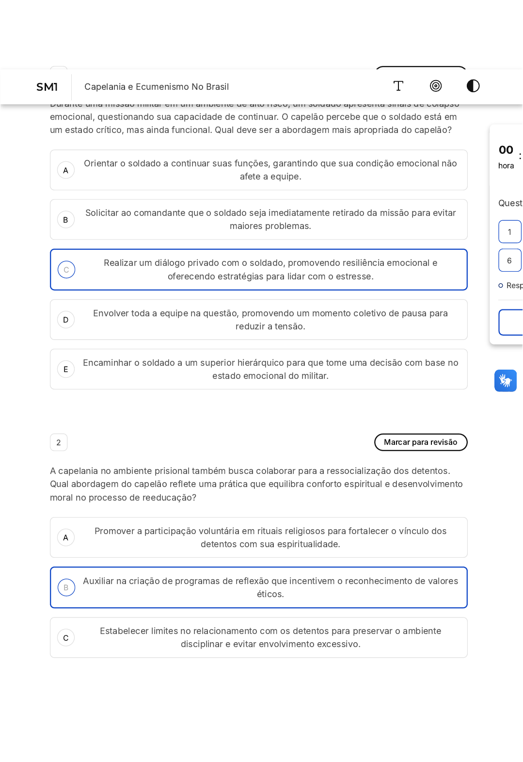 A B C D E A B C 1 Marcar para revisão Durante uma missão militar em um ambiente de alto risco, um soldado apresenta sinais de colapso emocional, questionando sua capacidade de continuar. O capelão percebe que o soldado está em um estado crítico, mas ainda funcional. Qual deve ser a abordagem mais apropriada do capelão? Orientar o soldado a continuar suas funções, garantindo que sua condição emocional não afete a equipe. Solicitar ao comandante que o soldado seja imediatamente retirado da missão para evitar maiores problemas. Realizar um diálogo privado com o soldado, promovendo resiliência emocional e oferecendo estratégias para lidar com o estresse. Envolver toda a equipe na questão, promovendo um momento coletivo de pausa para reduzir a tensão. Encaminhar o soldado a um superior hierárquico para que tome uma decisão com base no estado emocional do militar. 2 Marcar para revisão A capelania no ambiente prisional também busca colaborar para a ressocialização dos detentos. Qual abordagem do capelão reflete uma prática que equilibra conforto espiritual e desenvolvimento moral no processo de reeducação? Promover a participação voluntária em rituais religiosos para fortalecer o vínculo dos detentos com sua espiritualidade. Auxiliar na criação de programas de reflexão que incentivem o reconhecimento de valores éticos. Estabelecer limites no relacionamento com os detentos para preservar o ambiente disciplinar e evitar envolvimento excessivo. 00 hora : Quest Resp 1 6 SM1 Capelania e Ecumenismo No Brasil D E A B C D E A B Integrar atividades que reforcem a disciplina e adaptação às normas do presídio como parte do crescimento moral. Conduzir encontros regulares para compartilhar mensagens espirituais, estimulando reflexões em grupo sobre comportamento e fé. 3 Marcar para revisão Carlos é um detento que recentemente foi transferido para um novo presídio. Ele demonstra comportamento agressivo e resiste a qualquer tentativa de interação, alegando que foi injustiçado e que não vê sentido em participar de atividades internas. Durante uma conversa inicial com o capelão, ele expressa raiva e desconfiança, recusando qualquer apoio religioso. Qual seria a melhor abordagem do capelão para iniciar um processo de apoio? Esclarecer a Carlos que sua atitude está prejudicando sua convivência no presídio. Explicar a importância de se adaptar às regras do novo ambiente como primeiro passo. Oferecer uma escuta ativa, permitindo que Carlos expresse suas frustrações sem pressa. Focar em apresentar as práticas religiosas disponíveis como solução imediata. Sugerir a Carlos a participação em atividades coletivas para aliviar sua raiva. 4 Marcar para revisão Carlos é um capelão que trabalha em um hospital especializado no tratamento de doenças crônicas. Durante uma visita, ele encontra um paciente em estágio avançado de uma doença degenerativa, que expressa desânimo e falta de propósito. O paciente não segue uma religião organizada, mas menciona que encontra conforto ao refletir sobre o impacto positivo de sua vida em seus familiares. Nesse contexto, Carlos busca oferecer conforto espiritual. Qual abordagem Carlos pode adotar para atender às necessidades desse paciente de maneira sensível e eficaz? Incentivar o paciente a possibilidade de práticas espirituais que lhe ofereçam um novo sentido de propósito, incentivando-o a considerar um caminho de fé. Fornecer suporte psicológico, descartando elementos espirituais, já que o paciente não segue uma religião. C D E A B C D E A B Propor que o paciente participe de práticas religiosas padronizadas, como meditação ou reflexão, para ajudar o paciente a encontrar conforto, independentemente de sua conexão com uma religião. Conduzir uma conversa reflexiva que valorize os aspectos significativos da vida do paciente, respeitando sua perspectiva pessoal. Encaminhar o paciente a outro profissional, pois ele não compartilha crenças religiosas. 5 Marcar para revisão Maria é uma capelã que atua em um hospital público onde pacientes de diferentes crenças buscam apoio emocional e espiritual. Durante uma visita, um paciente expressa angústias relacionadas a questões espirituais e culturais que divergem das crenças de Maria. Qual deve ser a abordagem de Maria para atender às necessidades desse paciente? Buscar alinhar as crenças do paciente com a sua própria tradição religiosa. Focar exclusivamente em aspectos emocionais, evitando qualquer menção à espiritualidade. Ouvir ativamente o paciente, mostrando respeito e sensibilidade à sua visão de mundo. Solicitar a transferência do atendimento a outro capelão com crenças similares às do paciente. Orientar o paciente a buscar assistência em uma instituição religiosa de sua preferência. 6 Marcar para revisão No ambiente escolar, o papel do capelão vai além do apoio espiritual. Considere um cenário onde um grupo de alunos demonstra dificuldades para se relacionar devido a diferenças culturais e religiosas. Como o capelão pode atuar de maneira eficaz para promover um ambiente de harmonia? Enfatizando práticas religiosas específicas para que os alunos adotem um comportamento mais alinhado. Propondo dinâmicas de grupo que incentivem o diálogo e a compreensão das diferenças individuais. C D E A B C D E A B C Corrigindo o comportamento dos alunos que demonstram resistência em aceitar as diferenças culturais. Solicitando à direção da escola que adote regras rígidas de convivência para evitar novos conflitos. Organizando eventos religiosos para fortalecer a espiritualidade de todos os estudantes. 7 Marcar para revisão No ambiente prisional, o capelão desempenha um papel fundamental ao ajudar os detentos a lidarem com os desafios emocionais e psicológicos de sua realidade. Em situações de desespero, como um capelão pode demonstrar de forma prática o acolhimento espiritual? Reforçando a necessidade de obediên