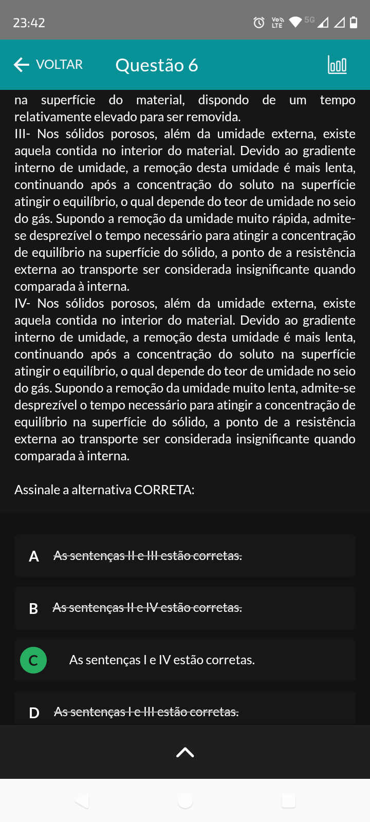 23:42 5G LTE VOLTAR Questão 6 000 na superfície do material, dispondo de um tempo relativamente elevado para ser removida. III- Nos sólidos porosos, além da umidade externa, existe aquela contida no interior do material. Devido ao gradiente interno de umidade, a remoção desta umidade é mais lenta, continuando após a concentração do soluto na superfície atingir o equilíbrio, o qual depende do teor de umidade no seio do gás. Supondo a remoção da umidade muito rápida, admite- se desprezível o tempo necessário para atingir a concentração de equilíbrio na superfície do sólido, a ponto de a resistência externa ao transporte ser considerada insignificante quando comparada à interna. IV- Nos sólidos porosos, além da umidade externa, existe aquela contida no interior do material. Devido ao gradiente interno de umidade, a remoção desta umidade é mais lenta, continuando após a concentração do soluto na superfície atingir o equilíbrio, qual depende do teor de umidade no seio do gás. Supondo a remoção da umidade muito lenta, admite-se desprezível o tempo necessário para atingir a concentração de equilíbrio na superfície do sólido, a ponto de a resistência externa ao transporte ser considerada insignificante quando comparada à interna. Assinale a alternativa CORRETA: A As sentenças estão corretas. B As sentenças H e IV estão corretas. As sentenças e IV estão corretas. D As sentenças le estão corretas.