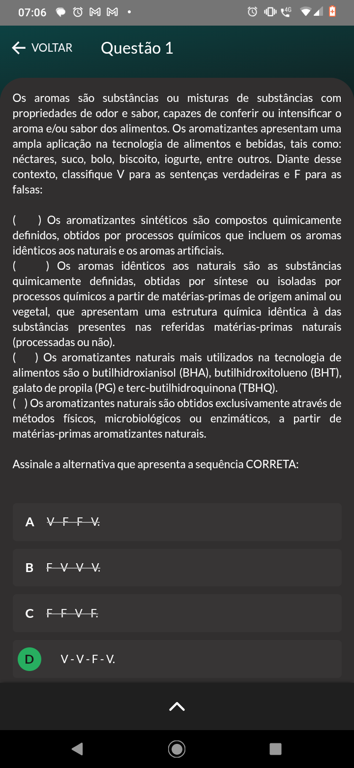 07:06 M 4G VOLTAR Questão 1 Os aromas são substâncias ou misturas de substâncias com propriedades de odor e sabor, capazes de conferir ou intensificar aroma e/ou sabor dos alimentos. Os aromatizantes apresentam uma ampla aplicação na tecnologia de alimentos e bebidas, tais como: néctares, suco, bolo, biscoito, iogurte, entre outros. Diante desse contexto, classifique V para as sentenças verdadeiras e F para as falsas: ( ) Os aromatizantes sintéticos são compostos quimicamente definidos, obtidos por processos químicos que incluem os aromas idênticos aos naturais e os aromas artificiais. ( ) Os aromas idênticos aos naturais são as substâncias quimicamente definidas, obtidas por síntese ou isoladas por processos químicos a partir de matérias-primas de origem animal ou vegetal, que apresentam uma estrutura química idêntica à das substâncias presentes nas referidas matérias-primas naturais (processadas ou não). ( ) Os aromatizantes naturais mais utilizados na tecnologia de alimentos são butilhidroxianisol butilhidroxitolueno (BHT), galato de propila (PG) e terc-butilhidroquinona (TBHQ). Os aromatizantes naturais são obtidos exclusivamente através de métodos físicos, microbiológicos ou enzimáticos, a partir de matérias-primas aromatizantes naturais. Assinale a alternativa que apresenta a sequência CORRETA: A c D V-V-F-V.