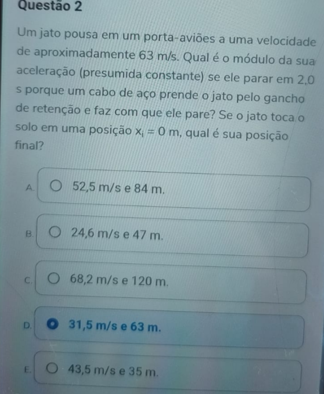 Questão 2 Um jato pousa em um porta-aviões a uma velocidade de aproximadamente 63 m/s. Qual é módulo da sua aceleração (presumida constante) se ele parar em 2,0 S porque um cabo de aço prende jato pelo gancho de retenção e faz com que ele pare? Se jato toca solo em uma posição = 0 m, qual é sua posição final? A. 52,5 m/s e 84 m. B. 24,6 m/s e 47 m. C. 68,2 m/s e 120 m. D. 31,5 m/s e 63 m. E. 43,5 m/s e 35 m.
