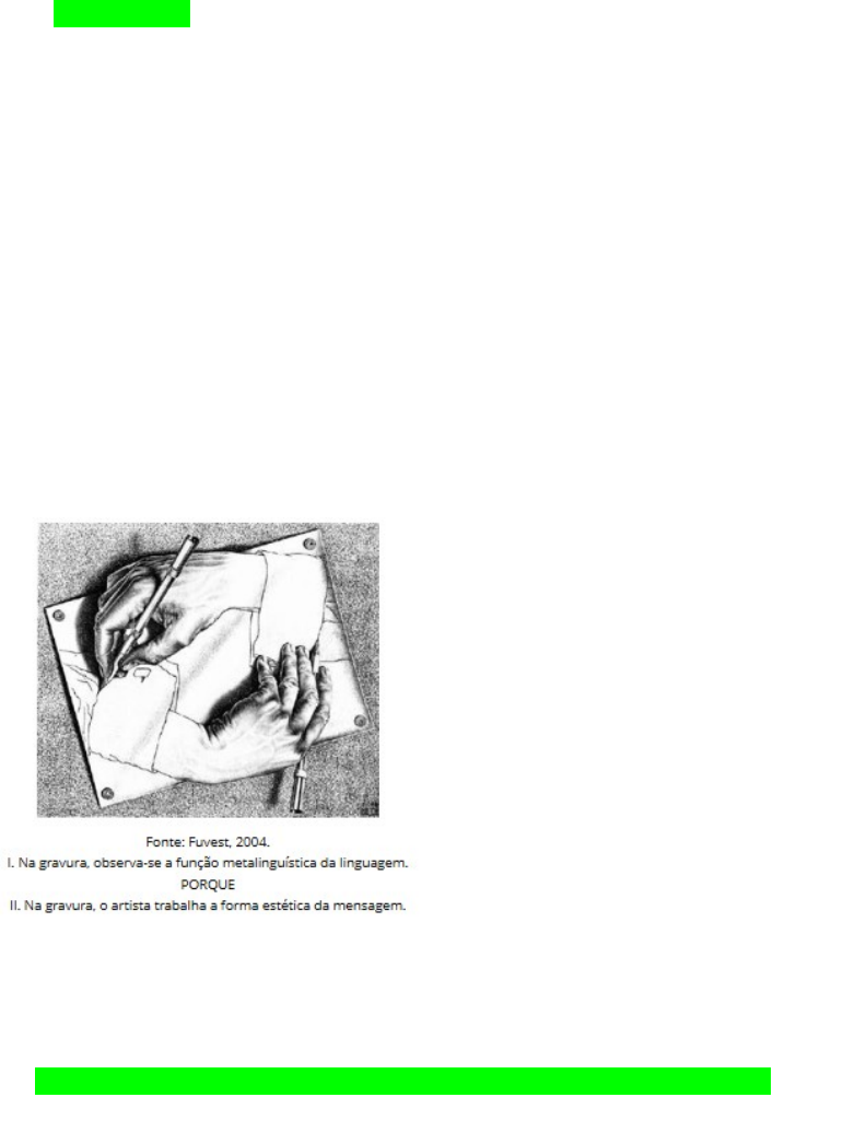 Pergunta 1 Considere os versos da música de Chico César e analise as afirmativas a seguir. “Respeitem meus cabelos, brancos Chegou a hora de falar Vamos ser francos Pois quando um preto fala O branco cala ou deixa a sala Com veludo nos tamancos Cabelo veio da África Junto com meus santos” I. A presença, ou a ausência, da vírgula altera o sentido do primeiro verso. II. Com a vírgula no primeiro verso, “brancos” torna-se vocativo. III. Se a vírgula do primeiro verso fosse retirada, haveria referência à idade do eu-lírico, e não à etnia. É correto o que se afirma em: a. I, II e III. (x) b. I e II. c. II e III. d. I e III. e. II, apenas. Pergunta 2 Considere a ilustração do artista Escher e analise as asserções e a relação proposta entre elas. Assinale a alternativa correta. a. As asserções I e II são verdadeiras, e a II justifica a I. b. As asserções I e II são verdadeiras, e a II não justifica a I. (x) c. A asserção I é verdadeira. d. A asserção I é falsa. e. As duas asserções são falsas. Pergunta 3 Considere o título jornalístico e analise as afirmativas. “Apresentador assume ter medo de morrer em entrevista” I. Há ambiguidade no título, pois entende-se que ele tem medo de morrer durante uma entrevista. II. Se a locução “em entrevista” fosse colocada após o verbo “assume”, o problema do enunciado seria resolvido. III. A ambiguidade do título ocorre devido à polissemia da palavra “entrevista”. É correto o que se afirma em: a. I, II e III. b. I e II. (x) c. II e III. d. I e III. e. I, apenas. Pergunta 4 Considere o texto publicado na imprensa e analise as afirmativas. Texto: Em vez de ser morta há facadas, personagem central mata agressor a tiros no final do espetáculo para se “modernizar” I. A expressão “em vez de” é incorreta, deveria ser substituída por “ao invés de”. II. O correto é “a facadas”. III. O correto é “à facadas”. IV. O correto é “à tiros”. É correto o que se afirma apenas em: a. I e II. b. II. (x) c. I e III. d. III e IV. e. III. Pergunta 5 Considere o texto a seguir e analise as afirmativas. “Ao chegar ao ancoradouro, recebeu Alzira Alves Filha um colar indígena feito de escamas de pirarucu e frutos do mar, que estava acompanhada de um grupo do Movimento Evangélico Unido.” (Folha de S.Paulo, 12/02/92) I. O texto pertence ao gênero textual notícia e apresenta estrutura dissertativo-argumentativa. II. Há um erro de regência verbal no texto. III. Observa-se falta de clareza, provocada pelo mau posicionamento da oração adjetiva. É correto o que se afirma em: 1. a. I, II e III. b. II e III. c. I e III. d. I e II. e. III, apenas. (x) Pergunta 6 Considere o texto escrito em um anúncio publicitário de um carro da categoria SUV. “Evite dirigir fora da estrada. Você pode não querer mais voltar para ela.” Os dois períodos poderiam ser ligados por uma conjunção sem alteração do sentido pretendido pelo publicitário. Assinale a alternativa que apresenta a conjunção possível. 1. a. Entretanto. b. À medida que. c. Pois. (x) d. E. e. Portanto. Pergunta 7 Considere o período e analise as afirmativas. “Ana estava muito cansada, por isso resolveu arrumar a casa inteira.” I. O uso da conjunção inadequada provoca incoerência no enunciado apresentado. II. A conjunção que une as orações do período deveria ser substituída por outra, como “entretanto”. III. Para unir as duas orações do período, deveria ser usado o pronome “onde”. É correto o que se afirma em: a. I, II e III. b. II e III. c. I e II. (x) d. I e III. e. I, apenas. Pergunta 8 Observe a peça publicitária a seguir e analise as asserções e a relação proposta entre elas. I. O objetivo do anúncio é mostrar que quem bebe comete, sem perceber, erros ortográficos. PORQUE II. A troca de letras nas palavras da peça publicitária alerta para o fato de que o álcool altera a percepção do consumidor. Assinale a alternativa correta. a. As asserções I e II são verdadeiras, e a II justifica a I. b. As asserções I e II são verdadeiras, e a II não justifica a I. c. A asserção I é verdadeira. d. A asserção I é falsa. (x) e. As duas asserções são falsas. Pergunta 9 Considere o texto e analise as afirmativas. “O desenvolvimento de tecnologias de comunicação permitem que uma pessoa converse com outra em um país distante, na qual ocorre intercâmbio cultural, podendo aprender novos idiomas e costumes.” I. Na primeira oração, há um erro de concordância verbal: o correto é “permite”. II. O uso do elemento coesivo “na qual” está correto. III. Em “podendo aprender novos idiomas e costumes”, há problema na construção sintática, pois falta o sujeito correto da oração. É correto o que se afirma em: a. I, II e III. b. I e II. c. II e III. d. I e III. (x) e. II, apenas. Pergunta 10 Considere o trecho, publicado em um jornal há alguns anos e analise as afirmativas. “Amantes dos antigos bolachões penam não só para encontrar os discos, que ficam a cada dia mais raros. A dificuldade aparece também na hora de trocar a agulha ou levar o toca-discos para o concerto.” I. O primeiro período encontra-se fragmentado, pois não há continuidade da oração. II. Há um erro ortográfico na palavra “concerto”. III. O texto é claro, coeso e bem estruturado. É correto o que se afirma somente em: a. I. b. II. c. III. d. II e III. e. I e II. (x) image1.png image2.png image3.png image4.png