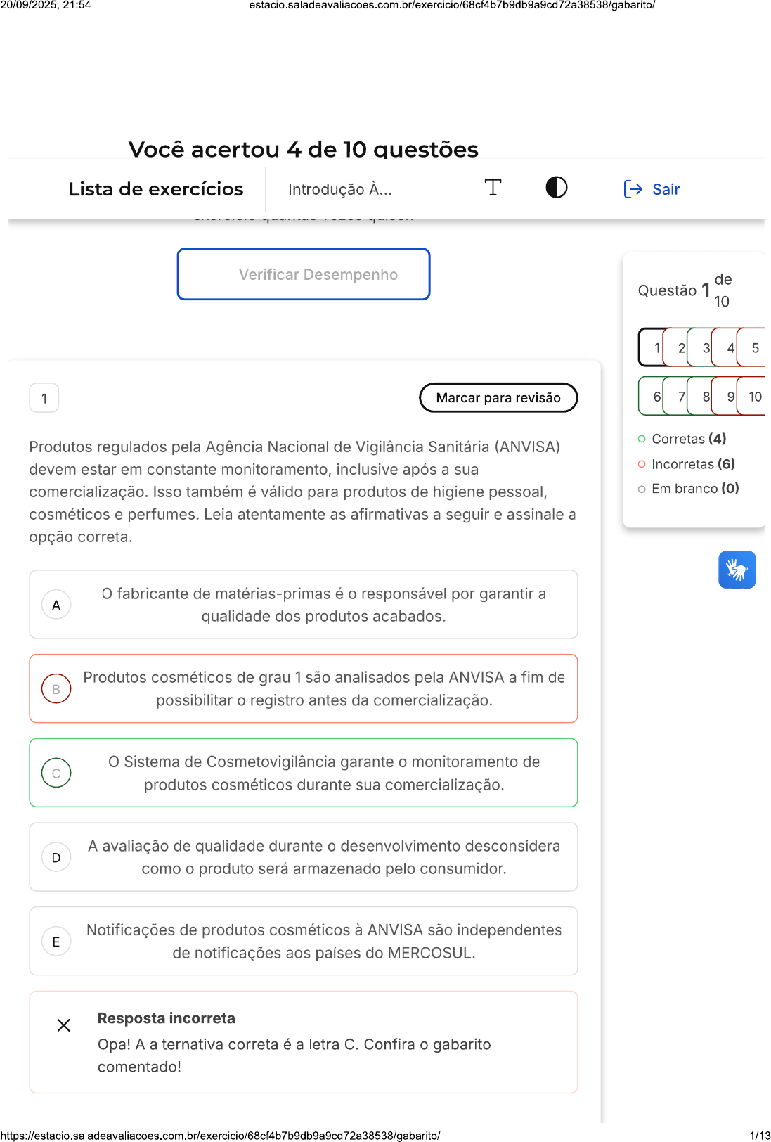 20/09/2025, 21:54 estacio.saladeavaliacoes.com.br/exercicio/68cf4b7b9db9a9cd72a38538/gabarito/ Você acertou 4 de 10 questões Lista de exercícios Introdução À... T Sair Verificar Desempenho de Questão 1 10 1 2 3 4 5 1 Marcar para revisão 6 7 8 9 10 Corretas (4) Produtos regulados pela Agência Nacional de Vigilância Sanitária (ANVISA) devem estar em constante monitoramento, inclusive após a sua Incorretas (6) comercialização. Isso também é válido para produtos de higiene pessoal, Em branco (0) cosméticos e perfumes. Leia atentamente as afirmativas a seguir e assinale a opção correta. O fabricante de matérias-primas é o responsável por garantir a A qualidade dos produtos acabados. Produtos cosméticos de grau 1 são analisados pela ANVISA a fim de possibilitar registro antes da comercialização. Sistema de Cosmetovigilância garante o monitoramento de c produtos cosméticos durante sua comercialização. A avaliação de qualidade durante o desenvolvimento desconsidera D como produto será armazenado pelo consumidor. Notificações de produtos cosméticos à ANVISA são independentes E de notificações aos países do MERCOSUL. X Resposta incorreta A alternativa correta é a letra Confira o gabarito comentado! https://estacio.saladeavaliacoes.com.br/exercicio/68cf4b7b9db9a9cd72a38538/gabarito 1/1320/09/2025, 21:54 estacio.saladeavaliacoes.com.br/exercicio/68cf4b7b9db9a9cd72a38538/gabarito/ Gabarito Comentado Sistema de Cosmetovigilância é responsável pelo monitoramento de produtos cosméticos durante sua comercialização. Este sistema é crucial para garantir a qualidade, segurança e eficácia dos produtos no mercado. Durante o desenvolvimento de produtos, são realizados estudos que incluem alterações de temperatura e umidade, prevendo a possibilidade de transporte e/ou armazenamento inadequado. Esses ensaios são de responsabilidade do fabricante do produto. Produtos cosméticos são classificados em grau 1 ou 2, e cada um passa por análises diferentes pela ANVISA antes de serem disponibilizados para comercialização. Produtos de grau 1, em geral, são isentos de registro e rapidamente liberados para comercialização, enquanto produtos de grau 2 muitas vezes precisam ser registrados. Além disso, é importante ressaltar que as notificações de produtos cosméticos à ANVISA não são independentes de notificações aos países do MERCOSUL, como Argentina, Paraguai e Uruguai, com quem o Brasil compartilha aspectos regulatórios. Portanto, casos notificados à ANVISA também devem ser notificados a esses países. 2 Marcar para revisão termo skin care refere-se ao cuidado com a pele. A indústria cosmética tem investido bastante em produtos destinados a esse cuidado e tem aprimorado diversos produtos para cuidado com a pele facial, assim como investe bastante em maquiagens, cuja principal função é enaltecer a beleza. A partir disso, assinale a alternativa correta sobre produtos cosméticos destinados à face: As matérias-primas utilizadas nessas formulações apresentam A propriedade comedogênica. Protetores solares destinados à face se apresentam como cremes com alto teor graxo. Maquiagens para diferentes tons de pele utilizam combinação c idêntica de pigmentos. 2/1320/09/2025, 21:54 estacio.saladeavaliacoes.com.br/exercicio/68cf4b7b9db9a9cd72a38538/gabarito/ Produtos cosméticos presentes no mercado são ineficientes quanto D ao efeito antienvelhecimento. Formulações cosméticas podem apresentar esfoliantes que se E caracterizam como mecânicos ou químicos. X Resposta incorreta Opa! A alternativa correta é a letra E. Confira gabarito comentado! Gabarito Comentado Os produtos cosméticos para a face são formulados com matérias- primas não comedogênicas, ou seja, que não obstruem os poros. Além disso, é importante evitar formulações com alto teor de fase oleosa ou de conteúdo graxo. No que diz respeito às maquiagens, os diferentes pigmentos são combinados de maneira adequada para atender aos diversos tipos de tonalidades de pele e às demandas de cores para maquiagem de acordo com as tendências do mercado. Atualmente, o setor cosmético oferece muitos produtos com efeito antienvelhecimento comprovado. Portanto, a alternativa correta é a que indica que os esfoliantes podem ser caracterizados como mecânicos (que apresentam microesferas) ou químicos (como ácidos). Vale ressaltar que existem novas tecnologias para esfoliantes, menos utilizadas, que são representadas por enzimas. 3 Marcar para revisão Você é o responsável pelo setor de pesquisa e desenvolvimento de uma indústria cosmética, que pretende desenvolver uma nova linha de produtos naturais. Entretanto, a marca pretende entregar um produto com um diferencial no mercado, oferecendo produtos para a pele que agreguem a ação fotoprotetora. Baseado nessas informações, assinale a alternativa correta: Esses produtos serão considerados produtos cosméticos de grau 1, A por representarem formulações naturais. Esses produtos serão considerados produtos cosméticos de grau 1, pois são produtos destinados à pele. https://estacio.saladeavaliacoes.com.br/exercicio/68cf4b7b9db9a9cd72a38538/gabarito./ 3/1320/09/2025, 21:54 Esses produtos serão considerados produtos cosméticos de grau 2, c por apresentarem ação fotoprotetora. Esses produtos serão considerados produtos cosméticos de grau 2, D por apresentarem propriedades básicas. Esses produtos serão considerados produtos cosméticos de grau 2, E por não apresentarem restrições de uso. Resposta correta Parabéns, você selecionou a alternativa correta. Confira o gabarito comentado! Gabarito Comentado Gabarito: Esses produtos serão considerados produtos cosméticos de grau 2, por apresentarem ação fotoprotetora. Justificativa: De acordo com a RDC 7/2015, os cosméticos são classificados em produtos de grau 1 e grau 2. Os produtos de grau 1 possuem propriedades básicas e não apresentam restrições de uso. 