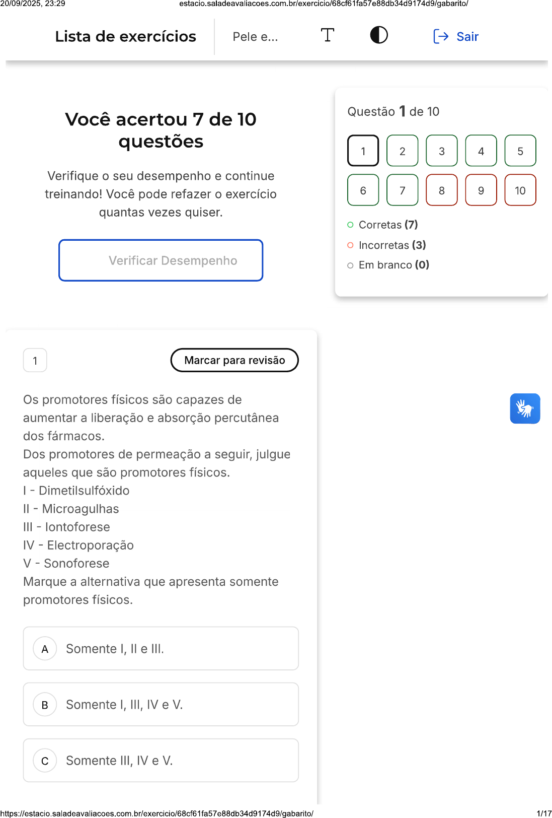 20/09/2025, 23:29 estacio.saladeavaliacoes.com.br/exercicio/68cf61fa57e88db34d9174d9/gabarito/ Lista de exercícios Pele e... T Sair Questão 1 de 10 Você acertou 7 de 10 questões 1 2 3 4 5 Verifique seu desempenho e continue treinando! Você pode refazer exercício 6 7 8 9 10 quantas vezes quiser. Corretas (7) Incorretas (3) Verificar Desempenho Em branco 1 Marcar para revisão Os promotores físicos são capazes de aumentar a liberação e absorção percutânea dos fármacos. Dos promotores de permeação a seguir, julgue aqueles que são promotores físicos. I - Dimetilsulfóxido - Microagulhas III - lontoforese IV - Electroporação V Sonoforese Marque a alternativa que apresenta somente promotores físicos. A Somente I, e III. Somente I, III, IV e V. c Somente III, IV e V. 1/1720/09/2025, 23:29 D Somente I, II, III e IV. E Somente II, III, IV e V. Resposta correta Parabéns, você selecionou a alternativa correta. Confira gabarito comentado! Gabarito Comentado A alternativa correta é a letra E, que indica que os promotores físicos são as Microagulhas, lontoforese, Electroporação e Sonoforese. Dimetilsulfóxido (DMSO), presente nas outras alternativas, é um promotor de permeação cutânea químico e não físico. Portanto, não se enquadra na categoria de promotores físicos, que são aqueles que aumentam a liberação e absorção percutânea dos fármacos por meio de métodos físicos. 2 Marcar para revisão Os promotores de permeação cutânea podem ser definidos como substâncias ou métodos farmacologicamente inativos, que interagem com os componentes do estrato córneo, reduzindo a resistência cutânea à difusão dos ativos. A respeito dos promotores de permeação cutânea analise as afirmativas abaixo. I. A sonoforese é um método físico muito utilizado no tratamento clínico de doenças na 2/1720/09/2025, 23:29 qual se utiliza um equipamento de ultrassom de alta frequência. II. A iontoforese e a sonoforese são técnicas muito semelhantes que só podem ser utilizadas por profissionais altamente treinados pois trabalham com princípio de alto aquecimento e podem causar sérias queimaduras sobre a pele do paciente caso sejam utilizadas da maneira incorreta. III. A eletroporação e a iontoforese são técnicas muito semelhantes que utilizam pulsos elétricos, os quais promovem a formação transitória de poros aquosos nas bicamadas lipídicas do estrato córneo aumentando a capacidade de permeação do ativo. IV. A sonoforese, também conhecida como ultrassom, promove ondas de choques as quais desestabilizam estrato córneo através de um processo de cavitação que gera um rápido crescimento e colapso das bolhas de ar favorecendo assim a permeação das substâncias ativas. Marque a alternativa que apresenta as afirmativas corretas. A III e IV são corretas. le são corretas. c e III são corretas. D e III são corretas. E le IV são corretas. Resposta correta https://estacio.saladeavaliacoes.com.br/exercicio/68cf61fa57e88db34d9174d9/gabarito/ 3/1720/09/2025, 23:29 Parabéns, você selecionou a alternativa correta. Confira gabarito comentado! Gabarito Comentado A afirmativa I está incorreta, pois a sonoforese utiliza ultrassom de baixa frequência (20 a 100 kHz), e não de alta frequência. A afirmativa também está incorreta, pois a iontoforese e a sonoforese são técnicas distintas, a primeira utiliza corrente elétrica e a segunda utiliza ultrassom. Já a afirmativa III está correta, pois tanto a eletroporação quanto a iontoforese são técnicas que utilizam pulsos elétricos para promover a formação transitória de poros aquosos nas bicamadas lipídicas do estrato córneo, aumentando a capacidade de permeação do ativo. A afirmativa IV também está correta, pois a sonoforese, ou ultrassom, promove ondas de choque que desestabilizam estrato córneo através de um processo de cavitação, favorecendo a permeação das substâncias ativas. Portanto, as afirmativas III e IV são as corretas. 3 Marcar para revisão A epiderme é a camada mais superficial da pele. Existem células da epiderme que desempenham papel como defesa no organismo humano. Marque a alternativa que apresenta essas células. 4/1720/09/2025, 23:29 A Linfócitos Fibroblastos. c Melanócitos. D Células de Merkel. E Células de Langerhans. Resposta correta Parabéns, você selecionou a alternativa correta. Confira gabarito comentado! Gabarito Comentado As células de Langerhans, presentes na epiderme, desempenham um papel crucial na defesa do organismo humano, sendo responsáveis pela resposta imune. As demais células listadas nas alternativas possuem funções distintas. Os linfócitos são células sanguíneas, também conhecidos como glóbulos brancos, que têm um papel importante na resposta imunológica. Os fibroblastos são células sanguíneas que participam ativamente no processo de cicatrização. Os melanócitos são células que sintetizam a melanina, pigmento responsável pela coloração da pele, cabelos e olhos. Por fim, as células de Merkel são células neuronais sensitivas que desempenham um papel importante na percepção do tato. https://estacio.saladeavaliacoes.com.br/exercicio/68cf61fa57e88db34d9174d9/gabarito/ 5/1720/09/2025, 23:29 4 Marcar para revisão A pele é constituída por 3 camadas: epiderme, derme e hipoderme. Desta forma, assinale a alternativa que melhor define a camada da derme. Na derme não estão localizados A nervos ou vasos sanguíneos. A derme é dividida em camada papilar, mais interna, e camada reticular, mais externa. Na derme estão localizadas fibras colágenas e elastinas que c proporcionam flexibilidade e elasticidade à pele. A derme é formada de tecido conjuntivo cuja função é de D sustentação e flexibilidade para a pele. Neste tecido há pouca diversidade de células. Na derme é possível observar uma E fina divisão entre a epiderme, bem definida e com células anucleadas. Resposta correta Parabéns, você selecionou a al