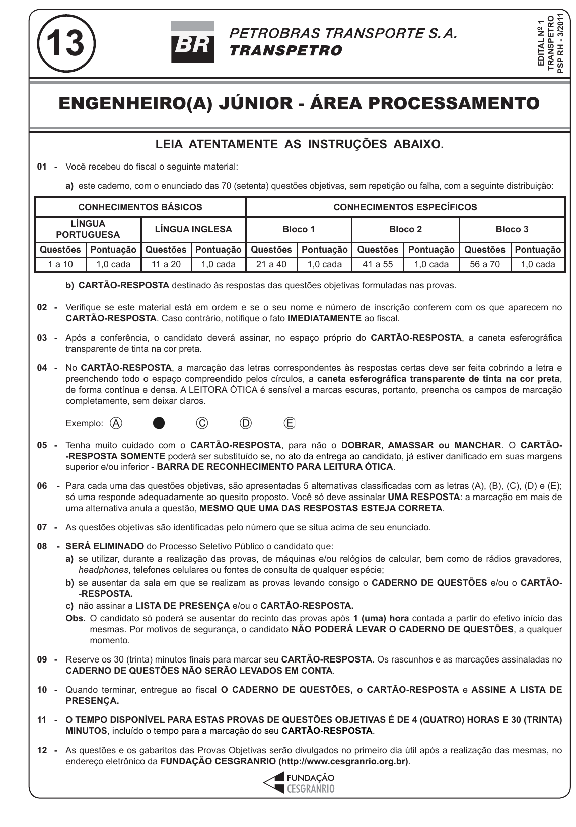 pcimarkpci MDAwMDowMDAwOjAwMDA6MDAwMDowMDAwOmZmZmY6YmIzYzpmYmVm:VGh1LCAxOCBBdWcgMjAyMiAxNzozMTowMyAtMDMwMA== www.pciconcursos.com.br ENGENHEIRO(A) JÚNIOR - ÁREA PROCESSAMENTO1 LEIA ATENTAMENTE AS INSTRUÇÕES ABAIXO. 01 - Você recebeu do fiscal o seguinte material: a) este caderno, com o enunciado das 70 (setenta) questões objetivas, sem repetição ou falha, com a seguinte distribuição: b) CARTÃO-RESPOSTA destinado às respostas das questões objetivas formuladas nas provas. 02 - Verifique se este material está em ordem e se o seu nome e número de inscrição conferem com os que aparecem no CARTÃO-RESPOSTA. Caso contrário, notifique o fato IMEDIATAMENTE ao fiscal. 03 - Após a conferência, o candidato deverá assinar, no espaço próprio do CARTÃO-RESPOSTA, a caneta esferográfica transparente de tinta na cor preta. 04 - No CARTÃO-RESPOSTA, a marcação das letras correspondentes às respostas certas deve ser feita cobrindo a letra e preenchendo todo o espaço compreendido pelos círculos, a caneta esferográfica transparente de tinta na cor preta, de forma contínua e densa. A LEITORA ÓTICA é sensível a marcas escuras, portanto, preencha os campos de marcação completamente, sem deixar claros. Exemplo: 05 - Tenha muito cuidado com o CARTÃO-RESPOSTA, para não o DOBRAR, AMASSAR ou MANCHAR. O CARTÃO- -RESPOSTA SOMENTE poderá ser substituído se, no ato da entrega ao candidato, já estiver danificado em suas margens superior e/ou inferior - BARRA DE RECONHECIMENTO PARA LEITURA ÓTICA. 06 - Para cada uma das questões objetivas, são apresentadas 5 alternativas classificadas com as letras (A), (B), (C), (D) e (E); só uma responde adequadamente ao quesito proposto. Você só deve assinalar UMA RESPOSTA: a marcação em mais de uma alternativa anula a questão, MESMO QUE UMA DAS RESPOSTAS ESTEJA CORRETA. 07 - As questões objetivas são identificadas pelo número que se situa acima de seu enunciado. 08 - SERÁ ELIMINADO do Processo Seletivo Público o candidato que: a) se utilizar, durante a realização das provas, de máquinas e/ou relógios de calcular, bem como de rádios gravadores, headphones, telefones celulares ou fontes de consulta de qualquer espécie; b) se ausentar da sala em que se realizam as provas levando consigo o CADERNO DE QUESTÕES e/ou o CARTÃO- -RESPOSTA. c) não assinar a LISTA DE PRESENÇA e/ou o CARTÃO-RESPOSTA. Obs. O candidato só poderá se ausentar do recinto das provas após 1 (uma) hora contada a partir do efetivo início das mesmas. Por motivos de segurança, o candidato NÃO PODERÁ LEVAR O CADERNO DE QUESTÕES, a qualquer momento. 09 - Reserve os 30 (trinta) minutos finais para marcar seu CARTÃO-RESPOSTA. Os rascunhos e as marcações assinaladas no CADERNO DE QUESTÕES NÃO SERÃO LEVADOS EM CONTA. 10 - Quando terminar, entregue ao fiscal O CADERNO DE QUESTÕES, o CARTÃO-RESPOSTA e ASSINE A LISTA DE PRESENÇA. 11 - O TEMPO DISPONÍVEL PARA ESTAS PROVAS DE QUESTÕES OBJETIVAS É DE 4 (QUATRO) HORAS E 30 (TRINTA) MINUTOS, incluído o tempo para a marcação do seu CARTÃO-RESPOSTA. 12 - As questões e os gabaritos das Provas Objetivas serão divulgados no primeiro dia útil após a realização das mesmas, no endereço eletrônico da FUNDAÇÃO CESGRANRIO (http://www.cesgranrio.org.br). 13 ED IT A L N o 1 TR A N SP ET R O PS P R H - 3/ 20 11 CONHECIMENTOS BÁSICOS CONHECIMENTOS ESPECÍFICOS LÍNGUA PORTUGUESA LÍNGUA INGLESA Bloco 1 Bloco 2 Bloco 3 Questões Pontuação Questões Pontuação Questões Pontuação Questões Pontuação Questões Pontuação 1 a 10 1,0 cada 11 a 20 1,0 cada 21 a 40 1,0 cada 41 a 55 1,0 cada 56 a 70 1,0 cada ENGENHEIRO(A) JÚNIOR - ÁREA PROCESSAMENTO pcimarkpci MDAwMDowMDAwOjAwMDA6MDAwMDowMDAwOmZmZmY6YmIzYzpmYmVm:VGh1LCAxOCBBdWcgMjAyMiAxNzozMTowMyAtMDMwMA== www.pciconcursos.com.br ENGENHEIRO(A) JÚNIOR - ÁREA PROCESSAMENTO 2 LÍNGUA PORTUGUESA Um pouco de silêncio Nesta trepidante cultura nossa, da agitação e do barulho, gostar de sossego é uma excentricidade. Sob a pressão do ter de parecer, ter de participar, ter de adquirir, ter de qualquer coisa, assumimos uma infinidade de obrigações. Muitas desnecessárias, ou- tras impossíveis, algumas que não combinam conos- co nem nos interessam. Não há perdão nem anistia para os que ficam de fora da ciranda: os que não se submetem mas ques- tionam, os que pagam o preço de sua relativa auto- nomia, os que não se deixam escravizar, pelo menos sem alguma resistência. O normal é ser atualizado, produtivo e bem-in- formado. É indispensável circular, estar enturmado. Quem não corre com a manada praticamente nem existe, se não se cuidar botam numa jaula: um animal estranho. Acuados pelo relógio, pelos compromissos, pela opinião alheia, disparamos sem rumo – ou em trilhas determinadas – feito hamsters que se alimentam de sua própria agitação. Ficar sossegado é perigoso: pode parecer doença. Recolher-se em casa, ou dentro de si mesmo, ame- aça quem leva um susto cada vez que examina sua alma. Estar sozinho é considerado humilhante, sinal de que não se arrumou ninguém – como se amizade ou amor se “arrumasse” em loja. [...] Além do desgosto pela solidão, temos horror à quietude. Logo pensamos em depressão: quem sabe terapia e antidepressivo? Criança que não brinca ou salta nem participa de atividades frenéticas está com algum problema. O silêncio nos assusta por retumbar no vazio dentro de nós. Quando nada se move nem faz baru- lho, notamos as frestas pelas quais nos espiam coi- sas incômodas e mal resolvidas, ou se enxerga outro ângulo de nós mesmos. Nos damos conta de que não somos apenas figurinhas atarantadas correndo entre casa, trabalho e bar, praia ou campo. Existe em nós, geralmente nem percebido e nada valorizado, algo além desse que paga contas, transa, ganha dinheiro, e come, envelhece, e um dia (mas isso é só para os outros!) vai morrer. Quem é esse que afinal sou eu? Quais seus desejos e medos, s