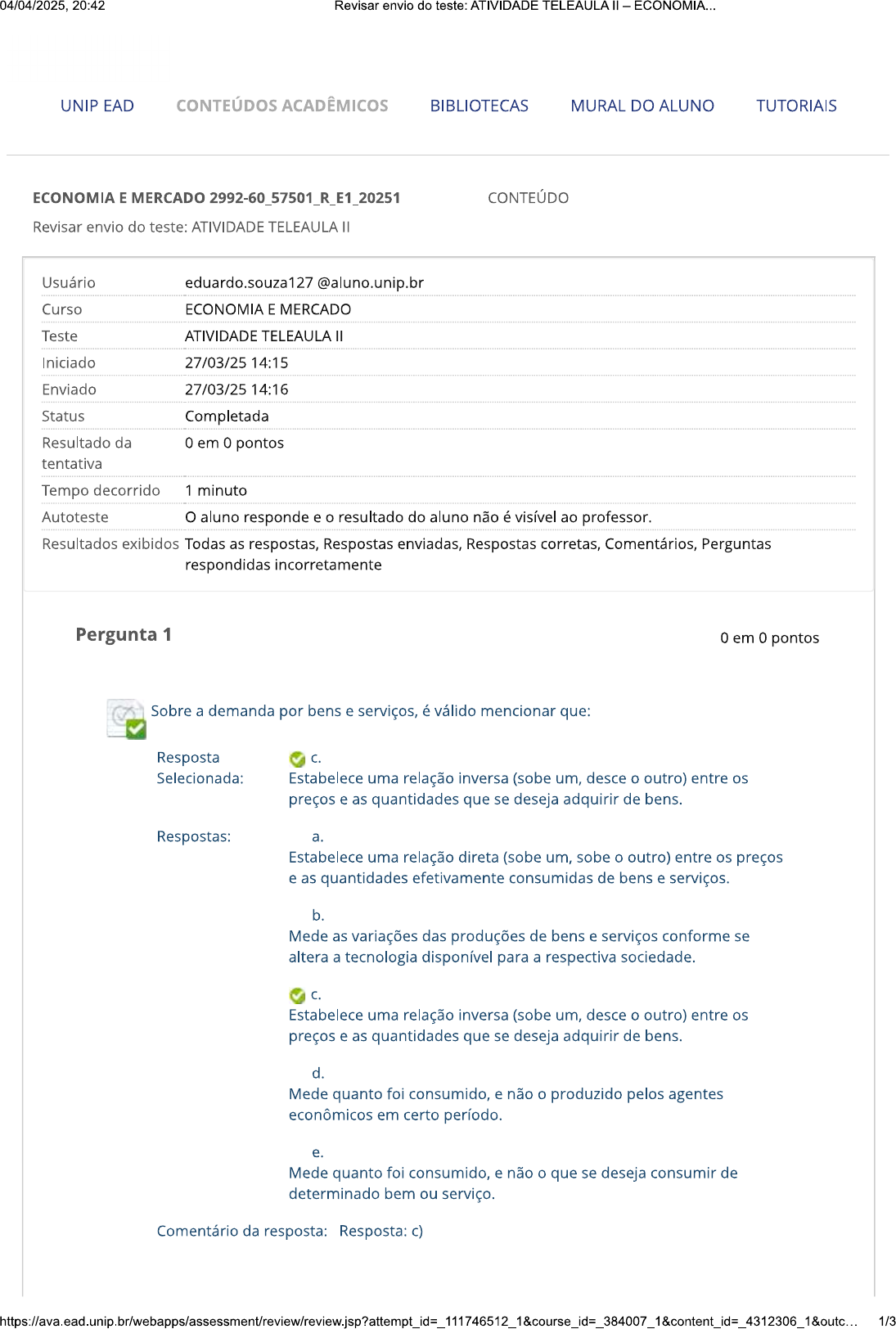 04/04/2025, 20:42 Revisar envio do teste: ATIVIDADE TELEAULA ECONOMIA... UNIP EAD CONTEÚDOS ACADÊMICOS BIBLIOTECAS MURAL DO ALUNO TUTORIAIS ECONOMIA E MERCADO 2992-60_57501_R_E1_20251 CONTEÚDO Revisar envio do teste: ATIVIDADE TELEAULA Usuário Curso ECONOMIA E MERCADO Teste ATIVIDADE TELEAULA Iniciado 27/03/25 14:15 Enviado 27/03/25 14:16 Status Completada Resultado da 0 em 0 pontos tentativa Tempo decorrido 1 minuto Autoteste aluno responde e resultado do aluno não é visível ao professor. Resultados exibidos Todas as respostas, Respostas enviadas, Respostas corretas, Comentários, Perguntas respondidas incorretamente Pergunta 1 0 em 0 pontos Sobre a demanda por bens e serviços, é válido mencionar que: Resposta Selecionada: Estabelece uma relação inversa (sobe um, desce outro) entre os preços e as quantidades que se deseja adquirir de bens. Respostas: a. Estabelece uma relação direta (sobe um, sobe outro) entre os preços e as quantidades efetivamente consumidas de bens e serviços. b. Mede as variações das produções de bens e serviços conforme se altera a tecnologia disponível para a respectiva sociedade. Estabelece uma relação inversa (sobe um, desce outro) entre os preços e as quantidades que se deseja adquirir de bens. d. Mede quanto foi consumido, e não produzido pelos agentes econômicos em certo período. e. Mede quanto foi consumido, e não que se deseja consumir de determinado bem ou serviço. Comentário da resposta: Resposta: c) 1/304/04/2025, 20:42 Revisar envio do teste: ATIVIDADE TELEAULA ECONOMIA... Pergunta 2 0 em 0 pontos A respeito da interação entre compradores e vendedores no mercado, é correto dizer: Resposta e. Selecionada: mercado estará em equilíbrio nas situações de igualdade entre as intenções de compra e venda dos agentes econômicos. Respostas: a. Não se verificam as situações de inexistência de inflação, isto é, quando os preços nominais equivalem aos reais, para todos os bens e serviços negociados no mercado. b. Os mercados somente são considerados equilibrados em transações com bens e serviços não financeiros. mercado estará em equilíbrio mesmo que alguns comerciantes não consigam vender tudo o que desejarem aos preços vigentes no mercado. d. equilíbrio de mercado independe dos preços dos bens. e. mercado estará em equilíbrio nas situações de igualdade entre as intenções de compra e venda dos agentes econômicos. Comentário da resposta: Resposta: e) Pergunta 3 0 em 0 pontos Escolha, entre as alternativas a seguir, a que determina valor da elasticidade-preço da demanda: Resposta d. Selecionada: É a razão (divisão) entre a variação percentual da quantidade que se deseja consumir e a variação percentual do preço do produto. Respostas: a. É a variação percentual da quantidade liberada pelo produtor e que pode ser usufruída pelos consumidores de bens. b. É obtida dividindo-se a variação percentual do preço pelo PIB (Produto Interno Bruto) em recessões econômicas. C. É obtida somando-se a variação percentual do preço pelo PIB (Produto Interno Bruto) em recessões econômicas. 2/304/04/2025, 20:42 Revisar envio do teste: ATIVIDADE TELEAULA ECONOMIA... d. É a razão (divisão) entre a variação percentual da quantidade que se deseja consumir e a variação percentual do preço do produto. e. É a única forma/alternativa de medição da elasticidade da demanda. Comentário da resposta: Resposta: d) Pergunta 4 0 em 0 pontos É importante conhecermos tipo e as características do mercado em que atuamos na economia. Com relação às estruturas de mercados, não pode ser considerado correto: Resposta a. Selecionada: As estruturas diferem conforme nível de concorrência entre os produtores e os consumidores. Respostas: a. As estruturas diferem conforme nível de concorrência entre os produtores e os consumidores. b. mercado imobiliário é classificado como local ou regional. É facilitada a entrada de novos agentes em mercados estruturados em concorrência perfeita. d. Mercado pode ser entendido, genericamente, como o encontro entre compradores e vendedores de bens e serviços. e. Nos mercados de fatores de produção, somente há a participação dos produtores de bens e serviços. OK Sexta-feira, 4 de Abril de 2025 20h42min05s GMT-03:00 3/3