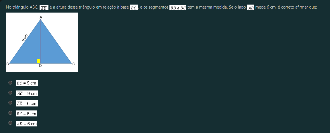 No ABC, AD é a altura desse triângulo em relação à base BC e os segmentos BD e DC têm a mesma medida. Se O lado AB mede 6 cm, é correto afirmar que: A B D C BC 9 cm AC = 9 cm AC 6 cm = 6 cm AD 6 cm