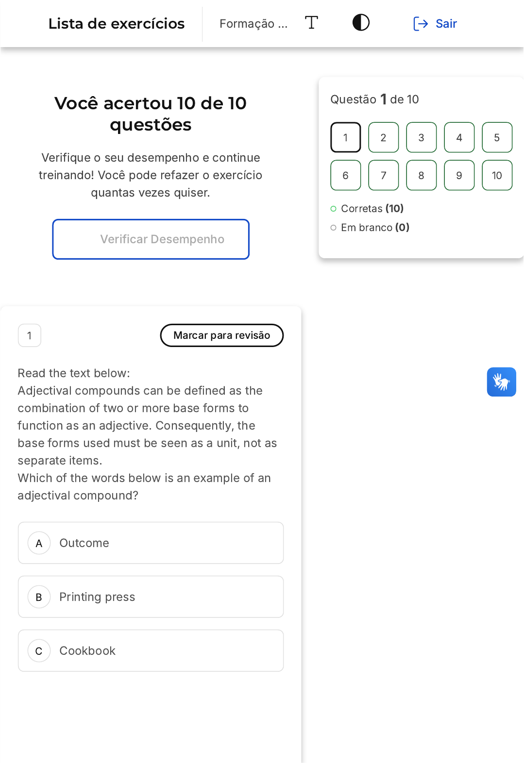 Você acertou 10 de 10 questões Verifique o seu desempenho e continue treinando! Você pode refazer o exercício quantas vezes quiser. Verificar Desempenho A B C 1 Marcar para revisão Read the text below: Adjectival compounds can be defined as the combination of two or more base forms to function as an adjective. Consequently, the base forms used must be seen as a unit, not as separate items. Which of the words below is an example of an adjectival compound? Outcome Printing press Cookbook Questão 1 de 10 Corretas (10) Em branco (0) 1 2 3 4 5 6 7 8 9 10 Lista de exercícios Formação … Sair D E A B Story-telling Good-looking Resposta correta Parabéns, você selecionou a alternativa correta. Confira o gabarito comentado! Gabarito Comentado The word good-looking is an example of an adjectival compound based on an adjective (= good) + -ing participle (= looking). All the other options are examples of nominal compounds 2 Marcar para revisão Read the text below: One of the most important word formation processes in English is known as affixation. It is a rich resource available in the English language, which can be used to generate new words. Based on the text above, which of the options contains a word created via affixation? Oldest. Happier C D E A B Books Witches Renew Resposta correta Parabéns, você selecionou a alternativa correta. Confira o gabarito comentado! Gabarito Comentado Affixation comprises either the use of prefixes or suffixes in order to create new words. In the case above, the word renew is composed of a base form (new) + a prefix (re). All the other options are examples of words containing inflections 3 Marcar para revisão Read the text below: One of the most important types of bound morphemes are those responsible for providing information concerning number, degree, possession, tense, and aspect. The text above refers to: prefixes suffixes C D E roots inflections stems Resposta correta Parabéns, você selecionou a alternativa correta. Confira o gabarito comentado! Gabarito Comentado When a bound morpheme is used to provide specific grammatical information related to number (singular vs. plural), degree (comparative vs. superlative), possession (‘s = apostrophe + s), tense (present tense vs. past tense), and aspect (progressive aspect vs. perfective aspect), it is known as an inflectional morpheme. 4 Marcar para revisão Read the text below: English inflections can be used to provide information concerning degree. In English, comparative and superlative structures are normally dependent on these morphological items. Based on the text above, which of the words below contains an inflection used to refer to degree? A B C D E Quickly Thoughtful Happiness. Older Regardless Resposta correta Parabéns, você selecionou a alternativa correta. Confira o gabarito comentado! Gabarito Comentado Inflections related to degree provide information concerning comparative and superlative structures. The word older contains the “-er” inflection typically used to refer to the comparative degree. The other options contain words in which the bound morpheme is used to create new words. In this case, the morpheme is known as derivational morpheme 5 Marcar para revisão Read the text below: A typical example of conversion involves the use of adjectives to perform the function of verbs. A B C D E Based on the text above, which of the sentences below contains an example of an adjective converted into a verb? I need to glue the pages of the book I have positioned the book in a different place I forgot to catalogue the books of my private library I know which side my bread is buttered I have to calm myself when teaching young learners Resposta correta Parabéns, você selecionou a alternativa correta. Confira o gabarito comentado! Gabarito Comentado The word calm is an example of a verb generated from an adject (i.e. calm). All the other options contain verbs generated from nouns. 6 Marcar para revisão Read the text below: A B C D E Suffixation is a type of word formation process which places affixes after base forms. It can be used to generate adjectives from verbs, for example. Based on the text above, which of the options contains an adjective generated from a verb? Childish Wealthy Dialectical Oceanic Productive Resposta correta Parabéns, você selecionou a alternativa correta. Confira o gabarito comentado! Gabarito Comentado The adjective productive was formed from the verb to produce in partnership with the suffix -tive. All the other options are examples of adjectives formed from nouns 7 Marcar para revisão Read the text below: A B C D E Prefixation involves the use of affixes before base forms. One important aspect to be considered is the semantic function of prefixes. Based on the text above, which of the options contains a pejorative prefix? Unzip Defrost Imbalanced Malnutrition Archangel. Resposta correta Parabéns, você selecionou a alternativa correta. Confira o gabarito comentado! Gabarito Comentado The word malnutrition contains the pejorative prefix mal-. All the other options make use of prefixes with different semantic function 8 Marcar para revisão Read the text below: The structure of adjectival compounds depends on the base forms used for their composition. A B C D E One interesting type refers to the use of the formula noun + adjective. Which of the words below is an example of an adjectival compound derived from the formula noun + adjective? Politically oriented Cold-brewed Fast-moving Swedish-American Duty-free Resposta correta Parabéns, você selecionou a alternativa correta. Confira o gabarito comentado! Gabarito Comentado The word duty-free is an example of an adjectival compound derived from the formula noun (= duty) + adjective (= free). All the other options are examples of adjectival compounds created via different formulas: adjective + adjective (= Swedish- American), adjective/adverb + -ed participle (= Politically oriented, cold- brewed) or adje