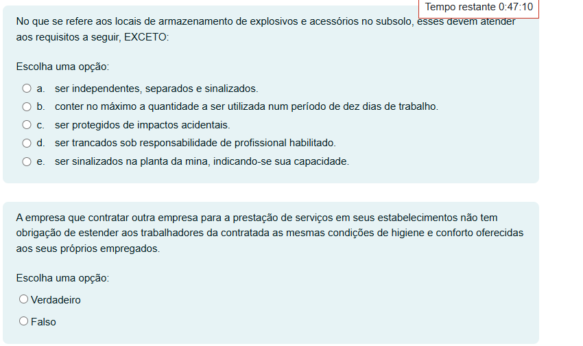 Tempo restante 0:47:10 No que se refere aos locais de armazenamento de explosivos e acessórios no subsolo, esses devem atender aos requisitos a seguir, EXCETO: Escolha uma opção: a. ser independentes, separados e sinalizados. b. conter no máximo a quantidade a ser utilizada num período de dez dias de trabalho. C. ser protegidos de impactos acidentais. d. ser trancados sob responsabilidade de profissional habilitado. e. ser sinalizados na planta da mina, indicando-se sua capacidade. A empresa que contratar outra empresa para a prestação de serviços em seus estabelecimentos não tem obrigação de estender aos trabalhadores da contratada as mesmas condições de higiene e conforto oferecidas aos seus próprios empregados. Escolha uma opção: Verdadeiro Falso