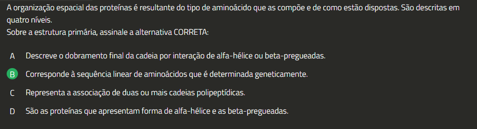 A organização espacial das proteínas é resultante do tipo de que as compõe e de como estão dispostas. São descritas em quatro níveis. Sobre a estrutura primária, assinale a alternativa CORRETA: A Descreve dobramento final da cadeia por interação de alfa-hélice ou beta-pregueadas. Corresponde à sequência linear de aminoácidos que é determinada geneticamente. Representa a associação de duas ou mais cadeias polipeptídicas. D São as proteínas que apresentam forma de alfa-hélice e as beta-pregueadas.
