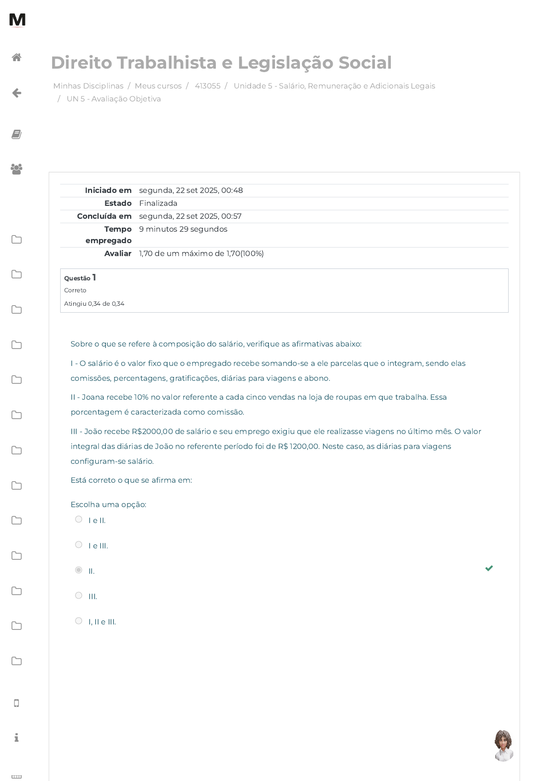 Minhas Disciplinas / Meus cursos / 413055 / Unidade 5 - Salário, Remuneração e Adicionais Legais / UN 5 - Avaliação Objetiva Direito Trabalhista e Legislação Social Iniciado em segunda, 22 set 2025, 00:48 Estado Finalizada Concluída em segunda, 22 set 2025, 00:57 Tempo empregado 9 minutos 29 segundos Avaliar 1,70 de um máximo de 1,70(100%) Questão 1 Correto Atingiu 0,34 de 0,34 Sobre o que se refere à composição do salário, verifique as afirmativas abaixo: I - O salário é o valor fixo que o empregado recebe somando-se a ele parcelas que o integram, sendo elas comissões, percentagens, gratificações, diárias para viagens e abono. II - Joana recebe 10% no valor referente a cada cinco vendas na loja de roupas em que trabalha. Essa porcentagem é caracterizada como comissão. III - João recebe R$2000,00 de salário e seu emprego exigiu que ele realizasse viagens no último mês. O valor integral das diárias de João no referente período foi de R$ 1200,00. Neste caso, as diárias para viagens configuram-se salário. Está correto o que se afirma em: Escolha uma opção: I e II. I e III. II. III. I, II e III. https://avap.multivix.edu.br/my/ https://avap.multivix.edu.br/course/view.php?id=35905 https://avap.multivix.edu.br/course/view.php?id=35905§ion=6 https://avap.multivix.edu.br/mod/quiz/view.php?id=1953213 https://avap.multivix.edu.br/my/ https://avap.multivix.edu.br/course/view.php?id=35905 https://avap.multivix.edu.br/user/index.php?id=35905 https://avap.multivix.edu.br/course/view.php?id=35905§ion=1 https://avap.multivix.edu.br/course/view.php?id=35905§ion=2 https://avap.multivix.edu.br/course/view.php?id=35905§ion=3 https://avap.multivix.edu.br/course/view.php?id=35905§ion=4 https://avap.multivix.edu.br/course/view.php?id=35905§ion=5 https://avap.multivix.edu.br/course/view.php?id=35905§ion=6 https://avap.multivix.edu.br/course/view.php?id=35905§ion=7 https://avap.multivix.edu.br/course/view.php?id=35905§ion=8 https://avap.multivix.edu.br/course/view.php?id=35905§ion=9 https://avap.multivix.edu.br/course/view.php?id=35905§ion=10 https://avap.multivix.edu.br/course/view.php?id=35905§ion=11 https://avap.multivix.edu.br/course/view.php?id=35905§ion=12 https://avap.multivix.edu.br/course/view.php?id=35905§ion=13 https://avap.multivix.edu.br/hooks/portal/ https://avap.multivix.edu.br/mod/page/view.php?id=1252%2F%22%20target%3D%22_blank https://avap.multivix.edu.br/calendar/view.php/ https://avap.multivix.edu.br/ https://avap.multivix.edu.br/ https://avap.multivix.edu.br/ https://avap.multivix.edu.br/ https://avap.multivix.edu.br/ https://avap.multivix.edu.br/ Questão 2 Correto Atingiu 0,34 de 0,34 Dadas as afirmativas sobre a folha de pagamentos: I. Todo empregador é obrigado a elaborar a folha de pagamento que constará, obrigatoriamente, o nome dos seus empregados, a remuneração paga a cada um e os respectivos descontos, podendo constar os descontos legais e os descontos convencionados. II. O valor do salário-família é pago por filho ou equiparado de 0 até 10 anos e quando a mãe e o pai estão nas categorias e faixa salarial que têm direito ao salário-família, os dois recebem o benefício. III. Na folha de pagamento analítica discrimina-se todas as parcelas que compuseram a remuneração dos empregados, ou seja, salário, horas extras, adicionais, prêmios e abonos. Discrimina-se também os descontos, como o INSS, IRRF, adiantamento salarial, faltas e atrasos, entre outros. IV. O empregador é obrigado a efetuar, na fonte, o desconto na remuneração de cada empregado referente à Contribuição Previdenciária (INSS) e a retenção do Imposto de Renda, conforme tabelas que são criadas pelos órgãos respectivamente competentes. verifica-se que estão corretas apenas: Escolha uma opção: I, III e IV. I e III. I e II. III e IV. II e IV. https://avap.multivix.edu.br/my/ https://avap.multivix.edu.br/course/view.php?id=35905 https://avap.multivix.edu.br/user/index.php?id=35905 https://avap.multivix.edu.br/course/view.php?id=35905§ion=1 https://avap.multivix.edu.br/course/view.php?id=35905§ion=2 https://avap.multivix.edu.br/course/view.php?id=35905§ion=3 https://avap.multivix.edu.br/course/view.php?id=35905§ion=4 https://avap.multivix.edu.br/course/view.php?id=35905§ion=5 https://avap.multivix.edu.br/course/view.php?id=35905§ion=6 https://avap.multivix.edu.br/course/view.php?id=35905§ion=7 https://avap.multivix.edu.br/course/view.php?id=35905§ion=8 https://avap.multivix.edu.br/course/view.php?id=35905§ion=9 https://avap.multivix.edu.br/course/view.php?id=35905§ion=10 https://avap.multivix.edu.br/course/view.php?id=35905§ion=11 https://avap.multivix.edu.br/course/view.php?id=35905§ion=12 https://avap.multivix.edu.br/course/view.php?id=35905§ion=13 https://avap.multivix.edu.br/hooks/portal/ https://avap.multivix.edu.br/mod/page/view.php?id=1252%2F%22%20target%3D%22_blank https://avap.multivix.edu.br/calendar/view.php/ https://avap.multivix.edu.br/ https://avap.multivix.edu.br/ https://avap.multivix.edu.br/ https://avap.multivix.edu.br/ https://avap.multivix.edu.br/ https://avap.multivix.edu.br/ Questão 3 Correto Atingiu 0,34 de 0,34 Nós, representantes do povo brasileiro, reunidos em Assembléia Nacional Constituinte para instituir um Estado Democrático, destinado a assegurar o exercício dos direitos sociais e individuais, a liberdade, a segurança, o bem- estar, o desenvolvimento, a igualdade e a justiça como valores supremos de uma sociedade fraterna, pluralista e sem preconceitos, fundada na harmonia social e comprometida, na ordem interna e internacional, com a solução pacífica das controvérsias, promulgamos, sob a proteção de Deus, a seguinte CONSTITUIÇÃO DA REPÚBLICA FEDERATIVA DO BRASIL. Art. 201. A previdência social será organizada sob a forma de regime geral, de caráter contributivo e de filiação obrigatória, observados critérios que preservem o equilíbrio financeiro e atuarial, e atenderá, nos termo