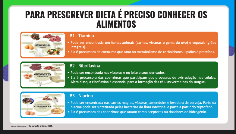 PARA PRESCREVER DIETA É PRECISO CONHECER OS ALIMENTOS B1 Tiamina Pode ser encontrada em fontes animais (carnes, e gema de ovo) e vegetais (grãos VITAMINA 81 integrais). Ela é precursora da coenzima que atua no metabolismo de carboidratos, lipídios e proteínas. B2 - Riboflavina Pode ser encontrada nas e no leite e seus derivados. VITAMINA 02 Ela é precursora das coenzimas que participam dos processos de oxirredução nas células. Além disso, a riboflavina é essencial para a formação das células vermelhas do sangue. B3 Niacina Pode ser encontrada nas carnes magras, vísceras, amendoim e levedura de cerveja. Parte da VITAMINA 83 niacina pode ser sintetizada pelas bactérias da flora intestinal e parte a partir do triptofano. Ela é precursora das coenzimas que atuam como aceptores ou doadores de hidrogênio. Elaboração própria,