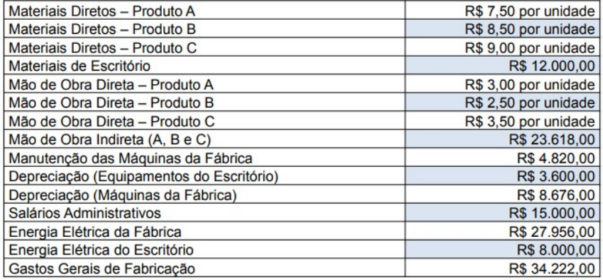 Situação Hipotética: Referente ao mês de novembro de 2021 foi ainda observado que a empresa Gama S.A. produziu o total de 16.700 unidades do produto A, 13.500 do produto B e 18.000 do produto C. Tendo como base todas as informações anteriormente disponibilizadas, e partindo-se do método de custeio por absorção, responda as alternativas abaixo. a) Classifique os gastos apresentados na tabela em: custo direto, custo indireto ou despesas. b) Realize a apropriação e encontre o valor total dos custos diretos para cada tipo de produto. c) Efetue os rateios (com base na quantidade produzida) e as apropriações dos custos indiretos para cada tipo de produto. d) Encontre o custo total de fabricação (Custo de Produção do Período) para cada tipo de produto. e) Encontre o custo unitário de fabricação. Conforme estudamos no conteúdo da disciplina, observamos que o método de custeio por absorção difere em alguns pontos do custeio variável. Sendo assim, quais seriam as principais diferenças existentes entre esses dois métodos de custeio? image1.png