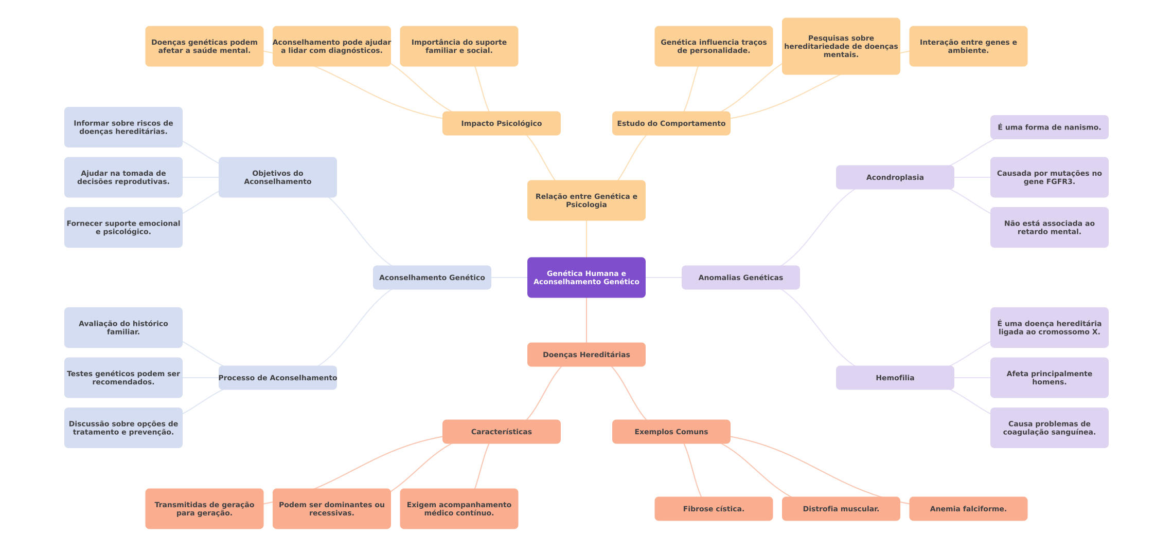 Doenças genéticas podem Aconselhamento pode ajudar Importância do suporte Genética influencia traços Pesquisas sobre afetar a saúde mental. familiar e social. hereditariedade de doenças Interação entre genes e a lidar com diagnósticos. de personalidade. ambiente. mentais. Informar sobre riscos de Impacto Psicológico Estudo do Comportamento uma forma de nanismo. doenças hereditárias. Ajudar na tomada de Objetivos do decisões reprodutivas. Aconselhamento Acondroplasia Causada por mutações no gene FGFR3. Relação entre Genética e Psicologia Fornecer suporte emocional Não está associada ao e psicológico. retardo mental. Genética Humana e Aconselhamento Genético Anomalias Genéticas Aconselhamento Genético Avaliação do histórico É uma doença hereditária familiar. ligada ao cromossomo X. Doenças Hereditárias Testes genéticos podem ser Processo de Aconselhamento Hemofilia Afeta principalmente recomendados. homens. Discussão sobre opções de Causa problemas de tratamento e prevenção. Características Exemplos Comuns coagulação sanguínea. Transmitidas de geração Podem ser dominantes ou Exigem acompanhamento Fibrose cística. Distrofia muscular. Anemia falciforme. para geração. recessivas. médico contínuo.
