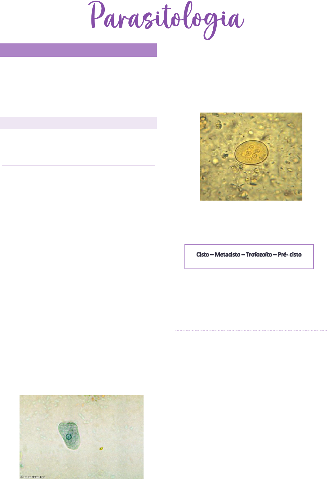 AMEBIASE Classificação • Filo- Sarcomastigophora • Subfilo- Sarcodina • Gênero- Entamoeba AMEBÍASE-ENTAMOEBA HISTOLYCA A E. histolytica é o agente etiológico da amebíase Monoxênico MORFOLOGIA Trofozoíto ➢ O trofozoíto mede cerca de 20 até 40 µm, podendo chegar a 60um em lesões tissulares, geralmente tem um só núcleo, o citoplasma diferenciado em ectoplasma (claro e hialino) e endoplasma (finamente granuloso, com vacúolos, núcleo e resto de substâncias alimentares; quando proveniente de casos de disenteria, é comum encontrar eritrócitos no citoplasma ➢ Examinando a fresco, apresenta-se pleomórfico, ativo, alongado, com emissão contínua e rápida de pseudópodes, grossos e hialinos ➢ A presença de hemácias no citoplasma do trofozoíto é uma característica diagnóstica importante para a E. histolytica, indicando a natureza patogênica da ameba ➢ Onde encontrar ✓ Intestino ✓Úlceras ✓Fezes diarreicas Cisto ➢ Os cistos são esféricos ou ovais, medem cerca de 8 a 20 µm e presentam de 1 a 4 núcleos. Os corpos cromatóides podem estar presentes no citoplasma em forma de bastonetes com as extremidades arredondadas. ➢ Onde encontrar ✓Fezes normais ➢ Pré-cisto é uma forma intermediária entre o trofozoíto e o cisto. ➢ Metacisto- É uma forma multinucleada que emerge do cisto no intestino delgado, onde sofre divisões, dando origem aos trofozoítos. BIOLOGIA DA ENTAMOEBA HISTOLYCA ➢ Os trofozoítos da E. histolytica normalmente vivem na luz do intestino grosso podendo, ocasionalmente, penetrar na mucosa e produzir ulcerações intestinais ou em outras regiões do organismo, como fígado, pulmão, rim e mais raramente, no cérebro e pele. ➢ São anaeróbios, mas podem crescer em atmosferas contendo até 5% de oxigênio. ➢ A locomoção por pseudópodes, ➢ Alimentam-se por fagocitose (partículas sólidas: hemácias, bactérias ou restos celulares) e por pinocitose (ingestão de partículas líquidas). ➢ Reproduzem-se por divisão binária dos trofozoítos CICLO BIOLÓGICO CICLO EVOLUTIVO TRANSMISSÃO • Fecal-oral: É a via principal, onde cistos do parasita presentes nas fezes de pessoas infectadas contaminam água, alimentos ou superfícies. • Contato oral-anal: A transmissão sexual por contato oral-anal também é um fator de disseminação. • Contaminação indireta: Mãos, objetos e alimentos podem ser contaminados e atuar como vetores, além de moscas e baratas. • Fatores de risco: Locais com saneamento precário são propensos à disseminação da doença. MANIFESTAÇÕES CLÍNICAS A infecção por Entamoeba histolytica é muitas vezes assintomática, mas quando há sintomas, podem variar: Intestinais: ➢ Diarreia: As fezes podem ficar moles e, em casos mais graves, apresentar muco e sangue, configurando um quadro de disenteria amebiana. ➢ Dor abdominal e cólicas. ➢ Febre e náuseas. ➢ Perda de peso. Extraintestinais (Complicações Graves): ➢ Abscesso hepático amebiano: A complicação mais comum fora do intestino, podendo causar dor na parte superior direita do abdômen, febre e hepatomegalia (aumento do fígado). ➢ Outras manifestações raras: A ameba pode atingir outros órgãos, como o pulmão ou o cérebro, embora seja mais raro DIAGNÓSTICO O diagnóstico da amebíase é confirmado através de: ➢ Exame de fezes: Detecção de cistos ou trofozoítos (formas do parasita) nas fezes ➢ sorológicos: Detecção de anticorpos contra o parasita no sangue. ➢ Exames de imagem: Ultrassom ou endoscopia podem ser necessários em casos de suspeita de complicações. TRATAMENTO ➢ Derivados da quinoleína ➢ emetinas ➢ antibióticas com eritromicina ➢ Metronidazol TRICHOMONAS • Reino: Protista • Filo: Sarcomastigopora • Classe: Zoomastigopora • Ordem: Trichomonadida • Família: Trichomonadidae • Gênero: Trichomonas • Espécie: T. vaginalis AS QUATRO ESPÉCIES ENCONTRADAS NO HOMEM SÃO TRICHOMONAS VAGINALIS, TRICHOMONAS TENAX, TRICHOMONAS HOMINIS E TRICHOMITUS FECALIS. TRICHOMONAS VAGINALIS CARACTERÍSTICAS MORFOLÓGICAS: • Forma e tamanho: É um trofozoíto em forma de pera ou oval, medindo entre 7 a 23 μm de comprimento. • Flagelos: Possui quatro flagelos livres na parte anterior do corpo e um quinto flagelo que forma a borda de uma membrana ondulada. • Membrana ondulada: Uma membrana ondulada se estende ao longo do corpo do organismo, sendo mais curta do que o comprimento do parasita. • Axóstilo: Um axóstilo, que é uma estrutura semelhante a uma haste delgada, estende-se por todo o comprimento do corpo do protozoário e se projeta posteriormente. • Hidrogenossomos: Apresenta hidrogenossomos, que são grânulos densos e são característicos do T. vaginalis. • Núcleo: Contém um núcleo elipsóide localizado na porção anterior do parasita. CICLO BIOLOGICO O ciclo biológico do Trichomonas vaginalis é simples e ocorre apenas na forma de trofozoíto, um organismo com flagelos que se alimenta. A transmissão ocorre por via sexual, e o parasita se multiplica por fissão binária longitudinal, sendo encontrado no trato genital inferior feminino e na uretra/próstata masculina. Não há forma de cisto, e a sobrevivência do parasita fora do hospedeiro é limitada. TRANSMISSÃO E PATOLOGIA Transmissão ➢ Contato Sexual:É a principal forma de transmissão, ocorrendo por meio de relações sexuais vaginais, anais ou orais com uma pessoa infetada. ➢ Contato Íntimo:O contato íntimo com secreções de uma pessoa contagiada também pode transmitir o parasita. ➢ De Mãe para Bebê:A transmissão pode ocorrer da mãe para o bebê durante o parto. Patologia SINTOMAS EM MULHERES: ➢ Corrimento vaginal abundante, amarelo- esverdeado, espumoso e com odor desagradável, semelhante a peixe. ➢ Prurido (comichão) na vulva e no períneo ➢ Dor durante o ato sexual (dispareunia) e dor ao urinar (disúria). ➢ Lesões puntiformes na parede vaginal e no colo do útero, com