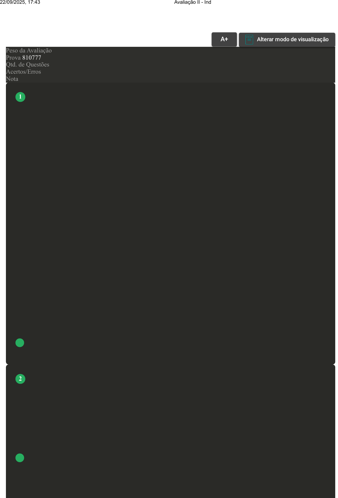 Prova Impressa GABARITO | Avaliação II - Individual (Cod.:955545) Peso da Avaliação 2,00 Prova 81077761 Qtd. de Questões 10 Acertos/Erros 10/0 Nota 10,00 Os eritrócitos também conhecidos como hemácias são a maior população de células no sangue. A sua importância se dá, também, ao fato de conter uma proteína chamada hemoglobina, que transporta os gases pela corrente sanguínea. Acerca da origem dos eritrócitos, analise as sentenças a seguir: I- Os eritrócitos têm origem nos eritroblastos na medula óssea. II- Os eritroblastos com apenas a membrana plasmática, citosol e hemoglobina formam os eritrócitos no sangue. III- Os eritrócitos se originam da fagocitose das porções heme e globina. IV- Os eritrócitos tem origem na fagocitose dos macrófagos no fígado. Assinale a alternativa CORRETA: A Somente a sentença IV está correta. B Somente a sentença III está correta. C As sentenças II e IV estão corretas. D As sentenças I e II estão corretas. O sangue é um tecido conjuntivo viscoso e denso. O sangue está constituído por uma parte líquida denominada plasma (55%) e uma parte celular, os elementos figurados (45%). O plasma é a parte acelular do sangue constituído por 90% de água, 8% de proteínas, 1% de sais inorgânicos e o restante formado por compostos orgânicos diversos. A parte celular do sangue, os elementos figurados, é formada por hemácias, leucócitos (neutrófilos, linfócitos, monócitos, eosinófilos e basófilos) e plaquetas, que são restos celulares. Assinale a alternativa CORRETA que corresponde à maior população de células do sangue: A Eritrócitos. B Eosinófilos. VOLTAR A+ Alterar modo de visualização 1 2 22/09/2025, 17:43 Avaliação II - Individual about:blank 1/7 C Neutrófilos. D Plaquetas. E Basófilos. Na classificação ABO (tipo sanguíneo), cada pessoa pertence a um grupo sanguíneo (A, B, AB e O). Nas hemácias humanas, podem existir dois tipos de proteínas: o aglutinogênio A e o aglutinogênio B. De acordo com a presença ou não dessas hemácias, o sangue é classificado como: Grupo A - possui somente o aglutinogênio A; Grupo B - possui somente o aglutinogênio B; Grupo AB - possui somente o aglutinogênio A e B; Grupo O - não possui aglutinogênios. No plasma sanguíneo humano, podem existir duas proteínas, chamadas aglutininas: aglutinina anti-A e aglutinina anti-B. Se uma pessoa possui aglutinogênio A, não pode ter aglutinina anti-A, da mesma maneira, se possui aglutinogênio B, não pode ter aglutinina anti-B. Caso contrário, ocorrem reações que provocam a aglutinação ou o agrupamento de hemácias, o que pode entupir vasos sanguíneos e comprometer a circulação do sangue no organismo. Esse evento relacionado à transfusão sanguínea, quando há aglutinação sanguínea entre duas amostras (doador e receptor), é popularmente conhecido como incompatibilidade sanguínea. Sobre o nome da(s) substância(s) (proteína) que faz(em) essa diferenciação e o componente figurado (elemento figurado) que esta se liga, assinale a alternativa CORRETA: A Glicocorticoides e está presente na membrana dos macrófagos. B Glicoproteínas e está presente na membrana dos basófilos e macrófagos. C Glicoproteínas e está presente na membrana dos eritrócitos. D Glicoproteínas e está presente na membrana dos eosinófilos. O coração contém câmaras cardíacas. Essas câmaras estão dividida por camadas teciduais, que podem ser consideradas como paredes. Sobre as câmaras cardíacas, classifique V para as sentenças verdadeiras e F para as falsas: ( ) Duas câmaras superiores (átrio direito e ventrículo esquerdo), sendo separados pelo septo interatrial; duas câmaras inferiores (ventrículo direito e átrio esquerdo), sendo separados septo interventricular. ( ) Câmaras superiores (ventrículo direito e ventrículo esquerdo), sendo separados pelo septo interatrial; duas câmaras inferiores (átrio direito e átrio esquerdo), sendo separados septo interventricular. ( ) Duas câmaras superiores (átrio direito e esquerdo), sendo separados pelo septo interatrial; duas câmaras inferiores (ventrículo direito e esquerdo), sendo separados septo interventricular. ( ) Duas câmaras superiores (átrio direito e esquerdo), sendo separados pelo septo interventricular, duas câmaras inferiores (ventrículo direito e esquerdo), sendo separados septo interatrial. 3 4 22/09/2025, 17:43 Avaliação II - Individual about:blank 2/7 Assinale a alternativa que apresenta a sequência CORRETA: A F - F - V - F. B F - V - V - F. C V - V - V - F. D V - F - F - V. Os leucócitos ou glóbulos brancos são as células responsáveis pela defesa do organismo. Em condições normais, o volume de leucócitos no sangue é de 5.000 a 10.000/uL. Nas infecções por vírus ou bactérias, a vida dos leucócitos pode ser de algumas horas, o que pode ser prolongado para alguns dias em outras infecções. Acerca dos leucócitos, analise as sentenças a seguir: I- A leucocitose é o aumento na contagem de leucócitos no sangue. II- A leucocitose é uma redução na contagem de leucócitos no sangue. III- Na leucopenia, a contagem dos leucócitos no sangue está em equilíbrio. IV- A leucopenia é uma redução na contagem de leucócitos no sangue. Assinale a alternativa CORRETA: A As sentenças II e III estão corretas. B As sentenças II e IV estão corretas. C As sentenças I e II estão corretas. D As sentenças I e IV estão corretas. A membrana sinovial secreta a sinóvia, um líquido que forma uma fina película sobre a superfície interna da cápsula articular. Esse líquido, de textura viscosa e translúcida ou discretamente amarelo-pálido, contém ácido hialurônico, encontrado comumente no líquido sinovial, no humor vítreo e no tecido conjuntivo colágeno. O ácido hialurônico é uma substância importante na constituição e proteção da articulação. Com relação às funções do ácido hialurônico, assinale a alternativa CORRETA
