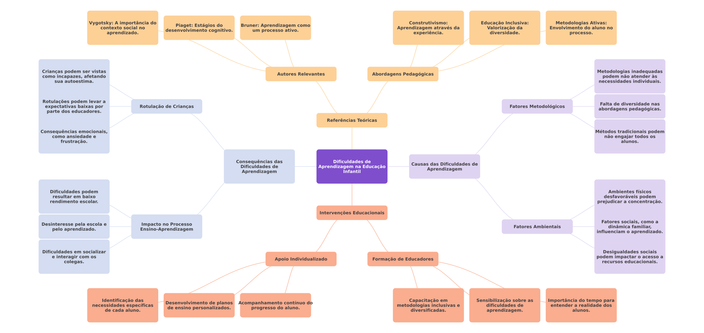 Vygotsky: A importância do Construtivismo: Educação Inclusiva: contexto social no Piaget: Estágios do Bruner: Aprendizagem como Metodologias Ativas: Aprendizagem através da Valorização da Envolvimento do aluno no aprendizado. cognitivo. um processo ativo. experiência. diversidade. processo. Crianças podem ser vistas Autores Relevantes Abordagens Pedagógicas Metodologias inadequadas como incapazes, afetando podem não atender às sua autoestima. necessidades individuais. Rotulações podem levar a Falta de diversidade nas expectativas baixas por Rotulação de Crianças Fatores Metodológicos parte dos educadores. abordagens pedagógicas. Referências Teóricas Consequências emocionais, Métodos tradicionais podem como ansiedade e não engajar todos os frustração. alunos. Consequências das Dificuldades de Causas das Dificuldades de Dificuldades de Aprendizagem na Educação Aprendizagem Infantil Aprendizagem Dificuldades podem Ambientes físicos resultar em baixo desfavoráveis podem rendimento escolar. prejudicar a concentração. Intervenções Educacionais Fatores sociais, como a Desinteresse pela escola e Impacto no Processo Fatores Ambientais dinâmica familiar, pelo aprendizado. Ensino-Aprendizagem influenciam 0 aprendizado. Dificuldades em socializar Desigualdades sociais e interagir com os Apoio Individualizado Formação de Educadores podem impactar acesso a colegas. recursos educacionais. Identificação das Desenvolvimento de planos Acompanhamento contínuo do Capacitação em Sensibilização sobre as Importância do tempo para necessidades específicas progresso do aluno. metodologias inclusivas e dificuldades de entender a realidade dos de cada aluno. de ensino personalizados. diversificadas. aprendizagem. alunos.