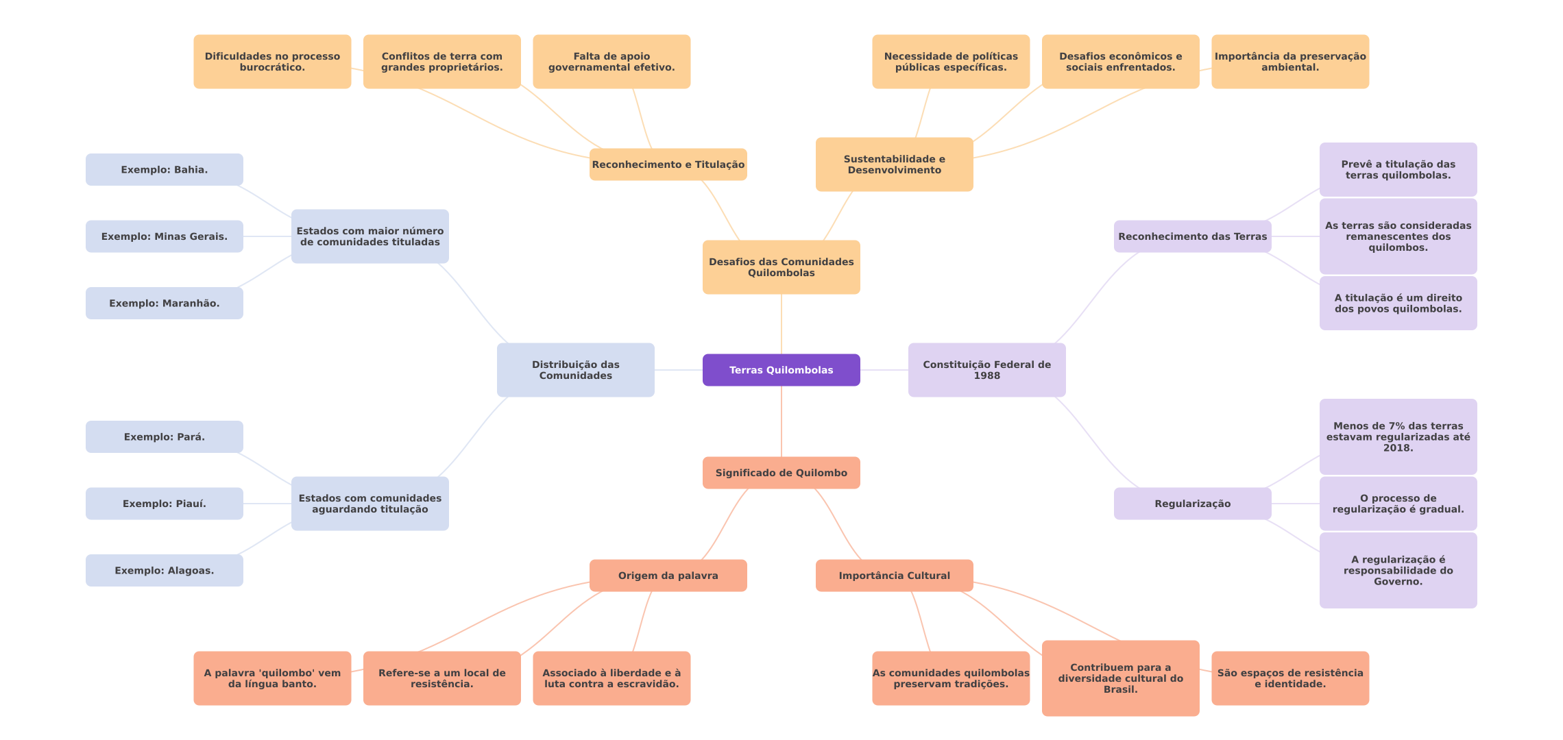 Dificuldades no processo Conflitos de terra com Falta de apoio Necessidade de políticas Desafios econômicos e Importância da preservação burocrático. grandes proprietários. governamental efetivo. públicas específicas. sociais enfrentados. ambiental. Sustentabilidade e Exemplo: Bahia. e Titulação Prevê a titulação das Desenvolvimento terras quilombolas. As terras são consideradas Estados com maior número Exemplo: Minas Gerais. Reconhecimento das Terras remanescentes dos de comunidades tituladas quilombos. Desafios das Comunidades Quilombolas Exemplo: Maranhão. A titulação é um direito dos povos quilombolas. Distribuição das Terras Quilombolas Constituição Federal de Comunidades 1988 Menos de 7% das terras Exemplo: Pará. estavam regularizadas até 2018. Significado de Quilombo Estados com comunidades Exemplo: Piauí. aguardando titulação Regularização processo de regularização é gradual. A regularização é Exemplo: Alagoas. Origem da palavra Importância Cultural responsabilidade do Governo. A palavra 'quilombo' vem Refere-se a um local de Associado à liberdade e à As comunidades quilombolas Contribuem para a diversidade cultural do São espaços de resistência da língua banto. resistência. luta contra a escravidão. preservam tradições. e identidade. Brasil.