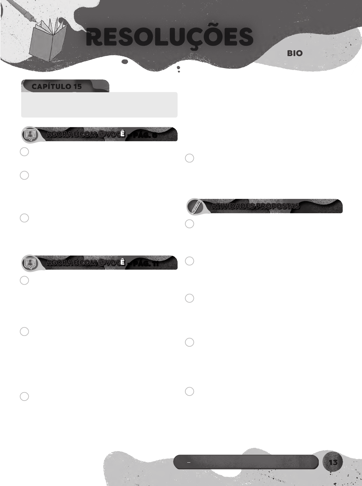 BIOLOGIA 1 RESOLUÇÕESRESOLUÇÕES 2a série – Ensino Médio – Livro 5 13 História da vida na Terra e evidências da evolução CAPÍTULO 15 AGORA É COM @VOCÊ – PÁG. 6– PÁG. 6 01 A ordem das divisões, da mais abrangente para a menos abrangente é: éon, era, período, época e idade. 02 (C) Surgimento dos primeiros hominídeos. (C) Diversificação dos mamíferos e das plantas com flores. (D) Maior extinção em massa da Terra. (A) Oxigenação da atmosfera. (B) Aparecimento dos primeiros seres eucariontes. 03 O cartaz de divulgação do filme mostra humanos e dinos- sauros coexistindo. Contudo, esse cenário não é possível, uma vez que os dinossauros foram extintos no final da Era Mesozoica, antes do surgimento dos seres humanos, que ocorreu na Era Cenozoica. AGORA É COM @VOCÊ – PÁG. 11– PÁG. 11 01 Para identificar o grau de parentesco evolutivo por meio de um trecho de DNA, basta analisar as semelhanças entre as sequências de bases nitrogenadas. Conclui-se, então, que as espécies 1 e 2 têm maior grau de parentesco evo- lutivo, pois suas sequências são mais semelhantes, com apenas duas bases nitrogenadas diferentes. 02 Trata-se de um exemplo de divergência evolutiva. A pela- gem é uma característica homóloga, comum a todas as espécies de ursos, herdada de um ancestral, porém apresenta diferenças que correspondem a adaptações a ambientes distintos. A pelagem branca do urso-polar permite que ele se camufle na neve, enquanto a do urso- -pardo é uma adaptação à vida nas montanhas e florestas temperadas. 03 a) O estudo dos fósseis ajuda a entender a evolução das espécies ao longo do tempo. No caso do fóssil encontrado, é possível inferir que os ossos do crâ- nio podem informar a respeito das características do cérebro das aves. b) Outras evidências que podem ser estudadas pelos cientistas para desvendar a evolução das aves são: • Estruturas homólogas: estruturas semelhantes em diferentes espécies evidenciam parentesco evolutivo. • Estruturas vestigiais: órgãos sem função aparente são resquícios de estruturas que foram funcionais em ancestrais. • Similaridade genética: semelhanças em sequências do DNA de espécies indicam proximidade evolutiva. • Embriologia comparada: semelhanças nos estágios iniciais de desenvolvimento de diferentes espécies sugerem ancestralidade comum. 04 A afirmação não é correta, pois as asas de aves e as de morcegos são estruturas análogas, ou seja, não têm origem em um ancestral comum e não refletem paren- tesco evolutivo. Trata-se de adaptações a hábitos de vida semelhantes. ATIVIDADES PROPOSTAS 01 E O Quaternário é o período geológico mais recente, esten- dendo-se de 2,5 milhões de anos atrás até hoje; portanto, compõe a era atual, a Cenozoica. 02 A Os ossos mostrados na imagem são estruturas herdadas de um ancestral tetrápode, as quais perderam função nas baleias, tornando-se vestigiais. 03 E A semelhança morfológica entre tubarão e golfinho é um exemplo de analogia anatômica, processo resultante da adaptação a ambientes semelhantes por convergência adaptativa, e não de um ancestral comum exclusivo. 04 D A convergência evolutiva ocorre quando duas espécies apresentam características semelhantes, mas não têm a mesma origem. Portanto, trata-se de organismos pouco aparentados evolutivamente e cujas semelhanças resultam de adaptações a ambientes similares. 05 a) Homólogas. b) Análogas. c) As estruturas homólogas têm a mesma origem embrio- nária, mas podem ter funções diferentes (como no exemplo da figura 1) em razão da divergência evolu- tiva. As estruturas análogas têm origens embrionárias diferentes, mas a mesma função (como no exemplo da figura 2) em razão da convergência evolutiva. 14 2a série – Ensino Médio – Livro 5 BIOLOGIA 1 06 E Diversos estudos podem evidenciar a evolução biológica. Entre eles, destacam-se as análises de fósseis, as homolo- gias e analogias, as estruturas vestigiais e as comparações genéticas. 07 C Analisando o gráfico, é possível saber que houve uma grande disponibilidade de oxigênio atmosférico durante o Período Carbonífero. Além disso, o enunciado ressalta a existência de animais gigantes no mesmo período. Com base nessas informações, infere-se que a alta concentra- ção de oxigênio pode ter sido um fator de seleção favorá- vel para animais de grande porte, uma vez que esse gás é utilizado pelas células para produzir energia por meio da respiração celular. 08 D O ser humano, o gato, a baleia e o morcego são animais mamíferos. Portanto, os órgãos mostrados são homólo- gos, pois têm a mesma origem evolutiva, uma vez que foram herdados de um ancestral comum. As funções des- sas estruturas diferem em razão da divergência evolutiva. 09 B Como mostra o cladograma, todas as estruturas têm a mesma origem: um ancestral comum dos tetrápodes. Por- tanto, elas são homólogas, mas houve divergência evolutiva entre os grupos, o que resultou em adaptações relaciona- das aos diferentes hábitos de vida e ambientes. 10 B Os fósseis são evidências da evolução. Eles correspon- dem a restos ou vestígios de seres vivos do passado, for- necendo informações sobre a vida em outras épocas na Terra, inclusive de espécies extintas.